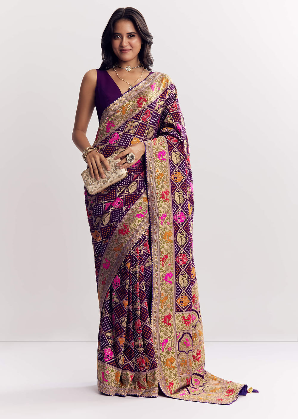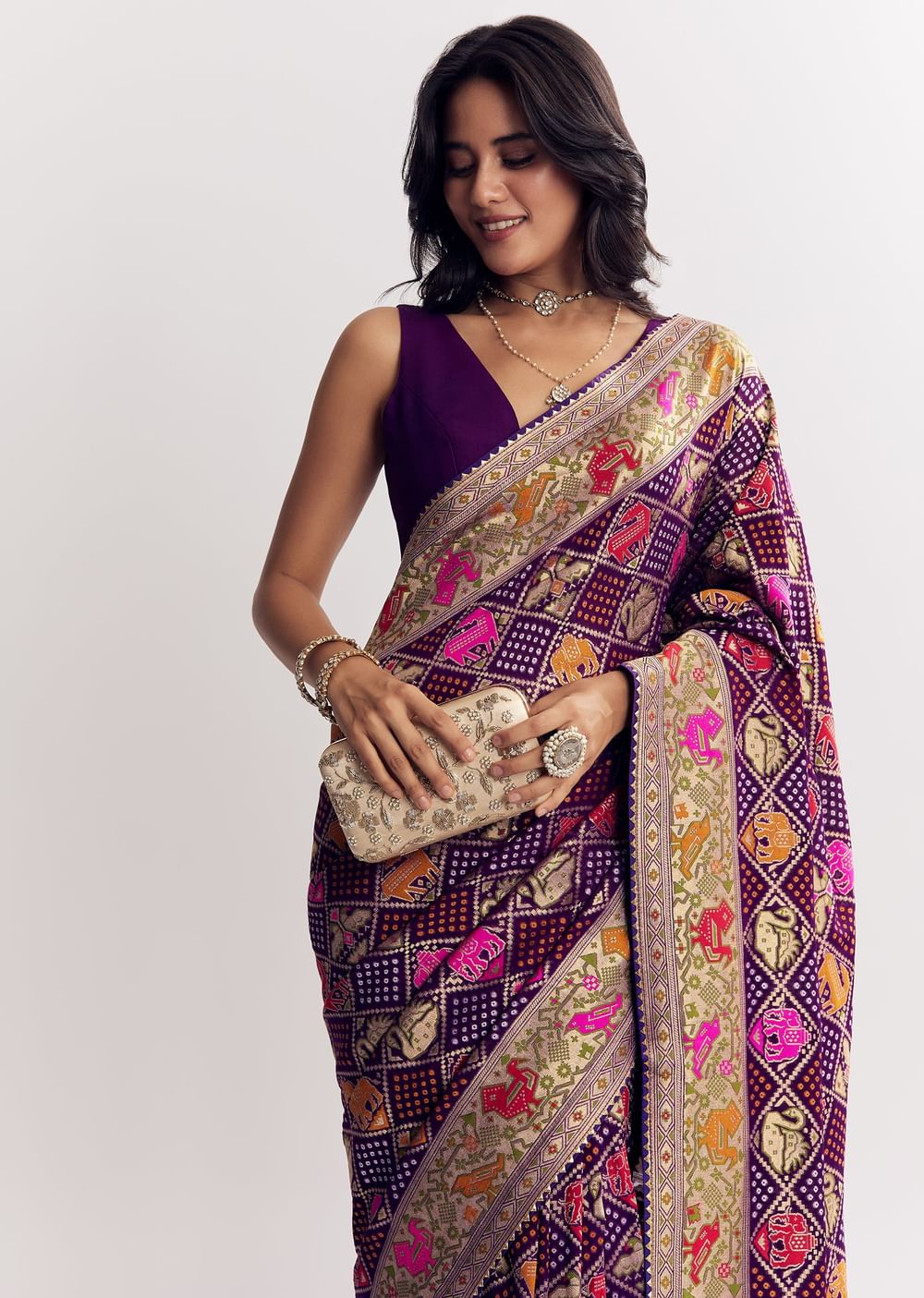 Whimsy and tradition meet in this bandhani purple saree, decorated with animal motifs and a shimmering gota border. Awarded as the Most Trusted Brand, we're delivering styles you love, just as promised.