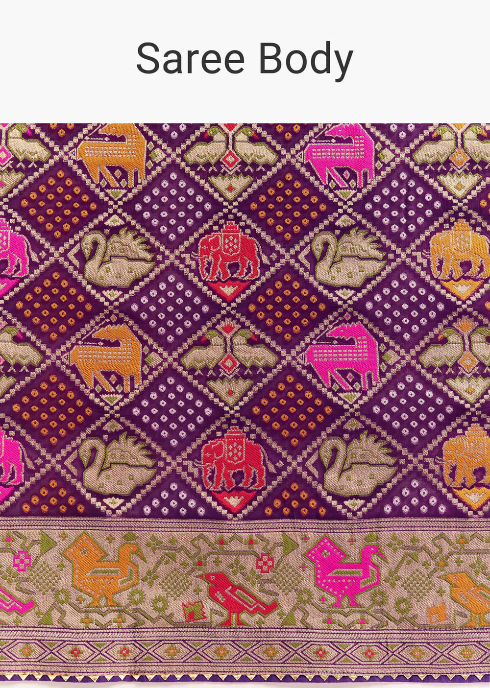 Purple Georgette Bandhani Saree With Animal Motifs And Gota Border