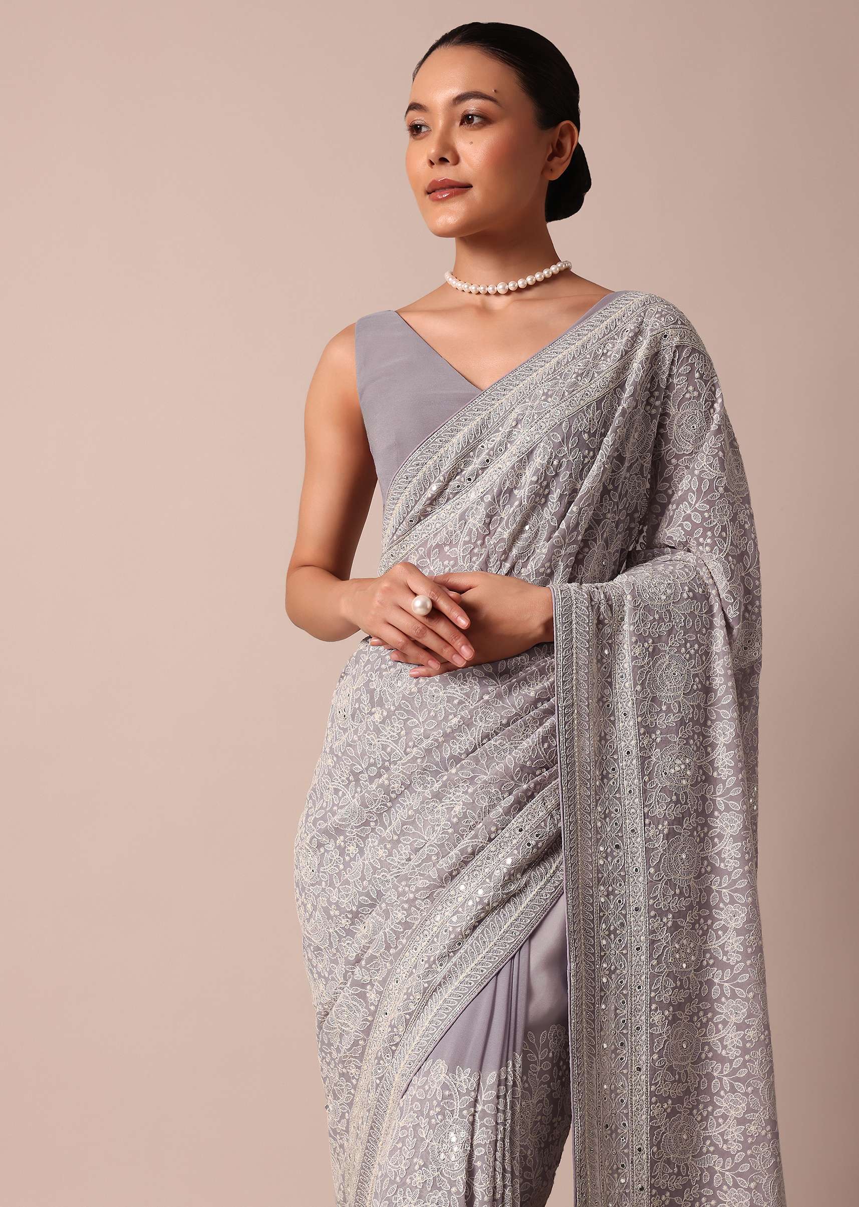 Purple Georgette Lucknowi Chikankari Sequin Saree With Unstitched Blouse Piece