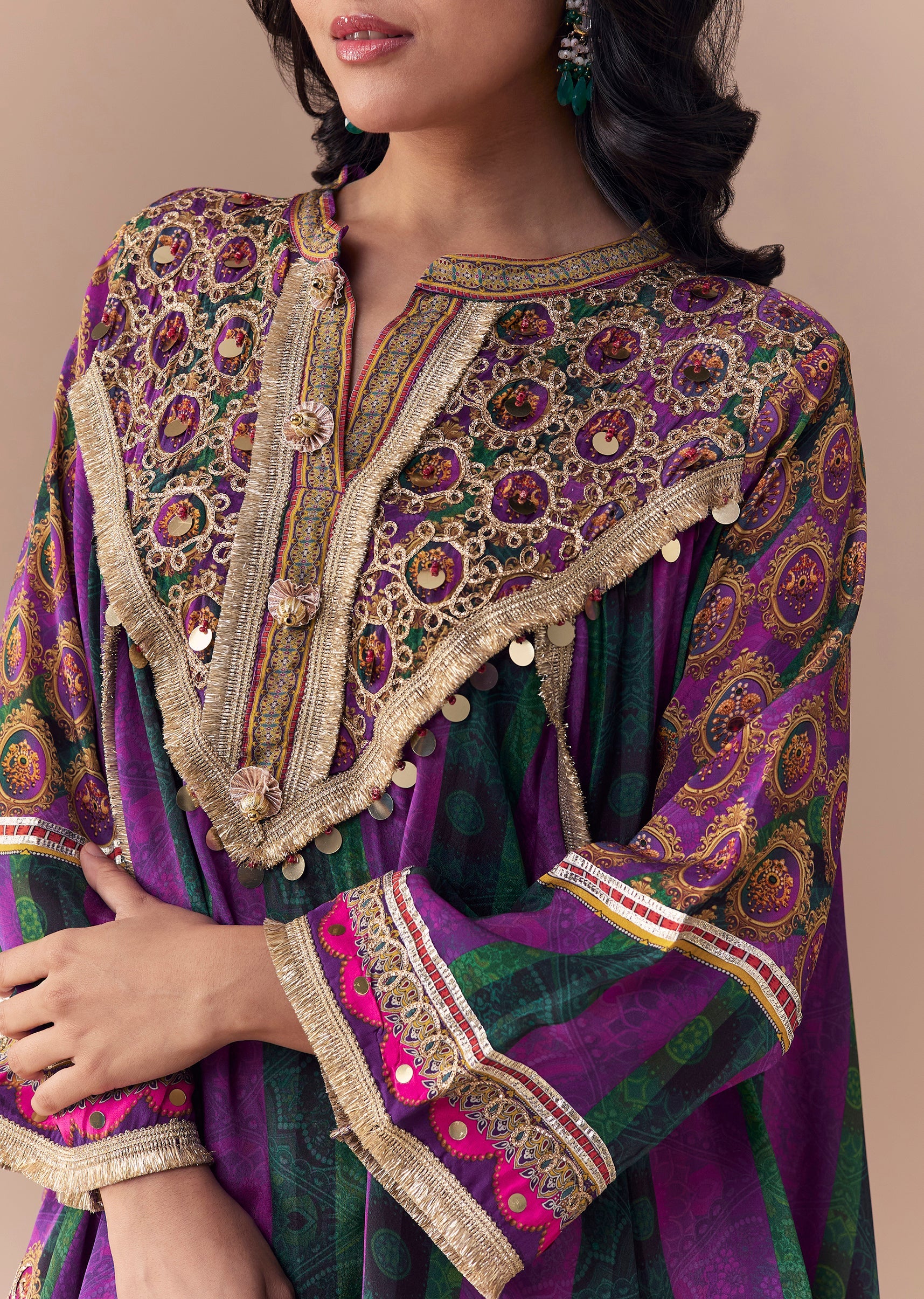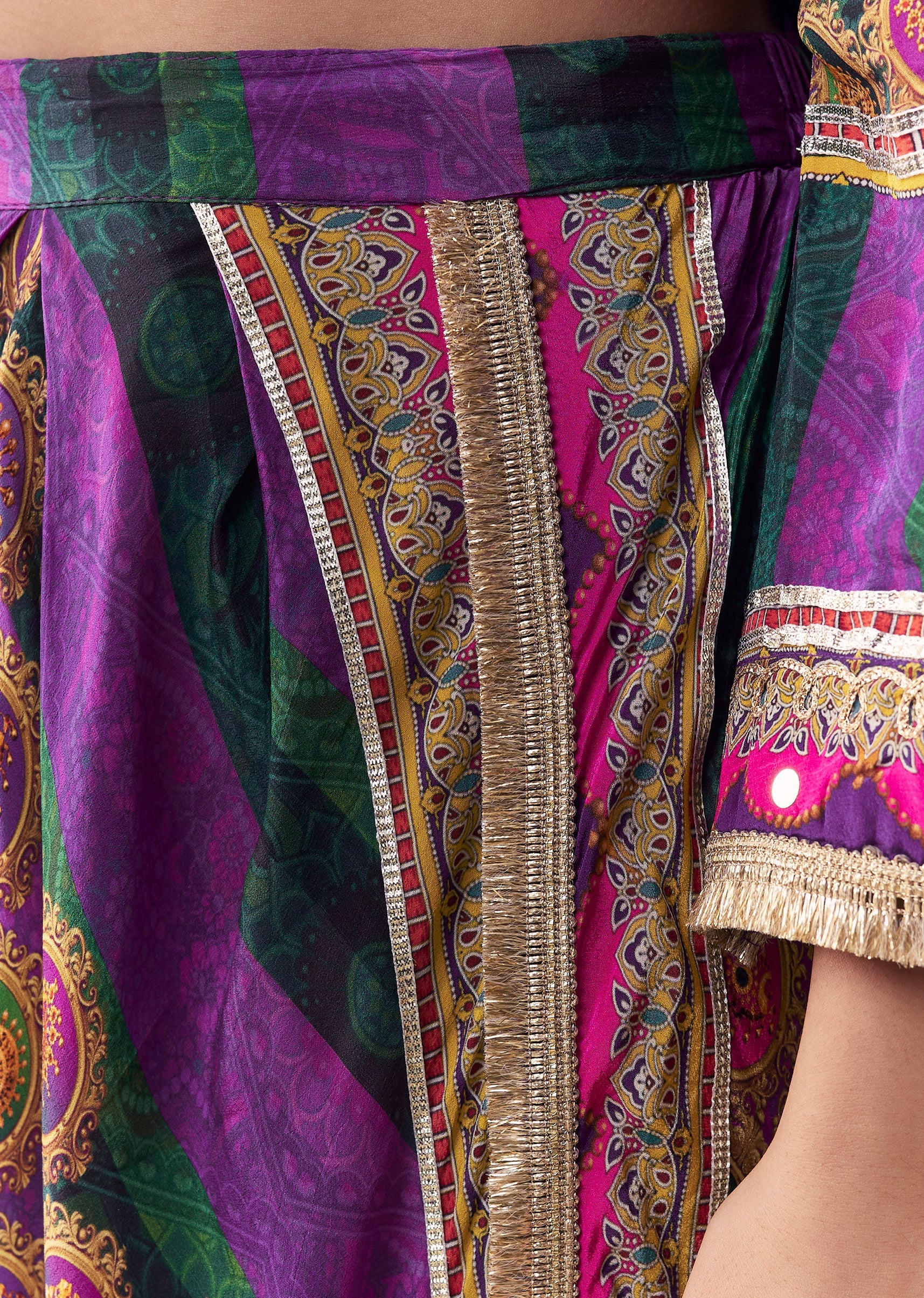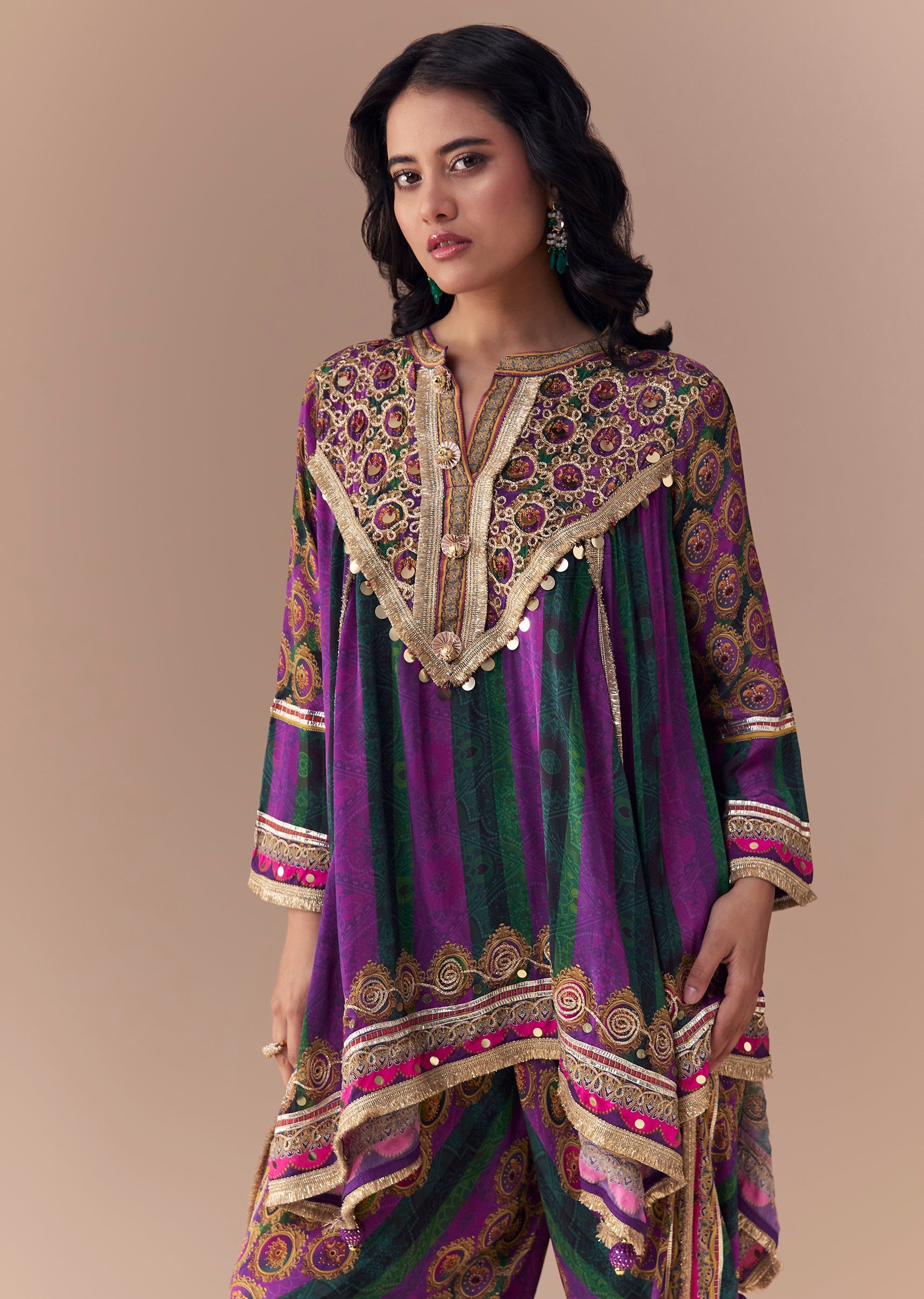 This indie-inspired ensemble features a printed kurta with intricate gotta lace work paired with a classic dhoti silhouette, creating a festive yet contemporary charm. Crafted in rich purple crepe, it... More Product Details
