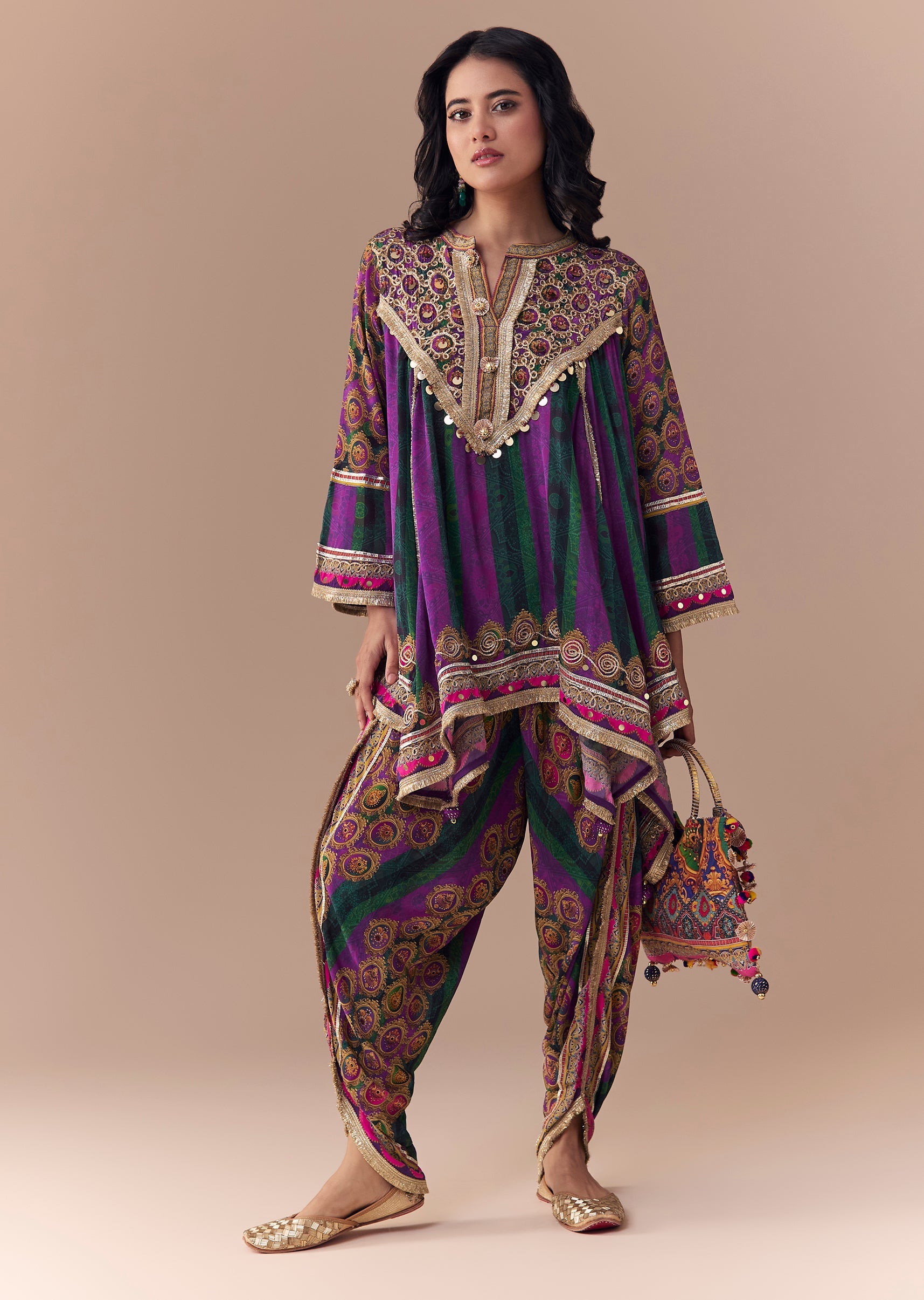 Purple Indie Print Dhoti Set with Handbag