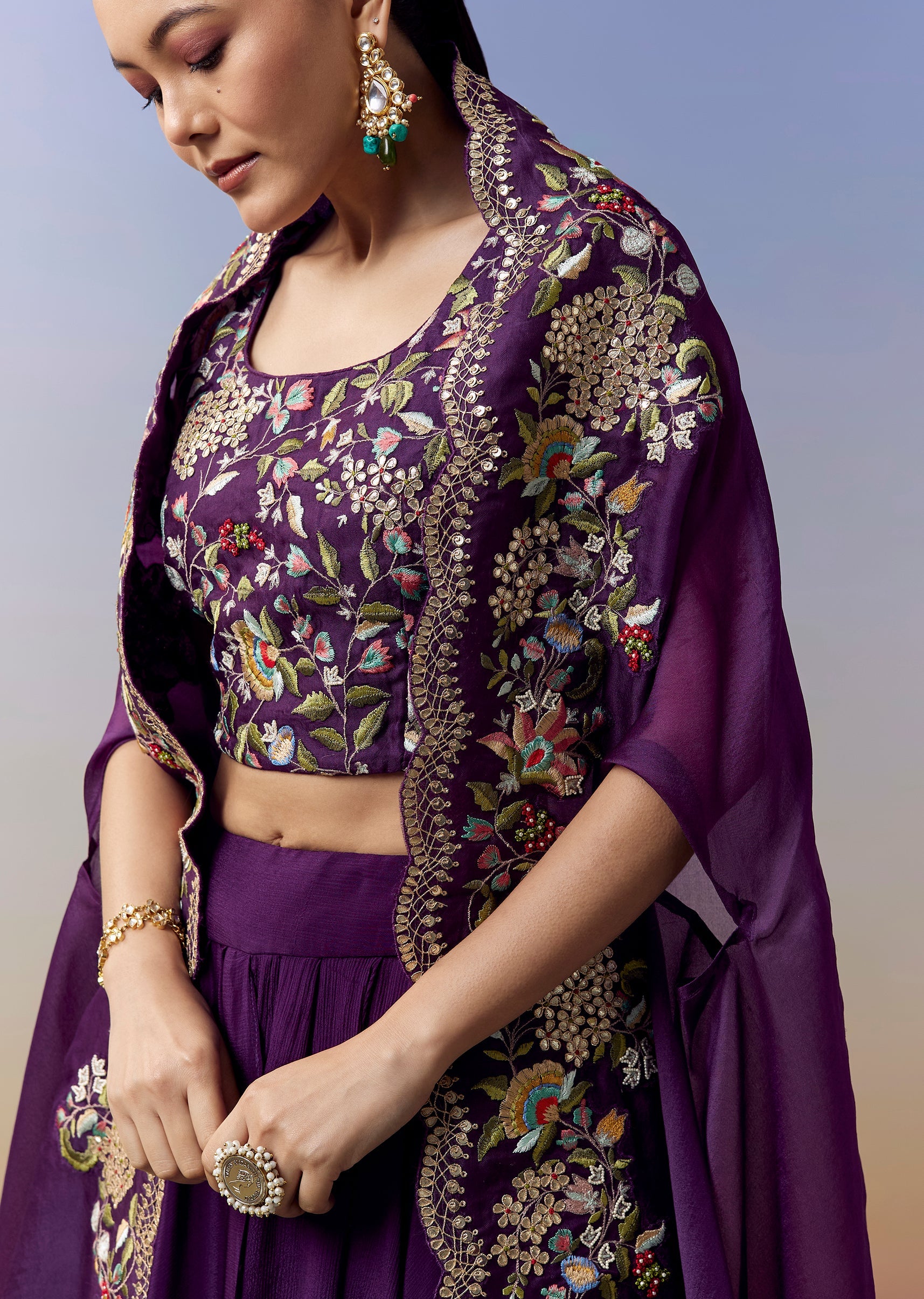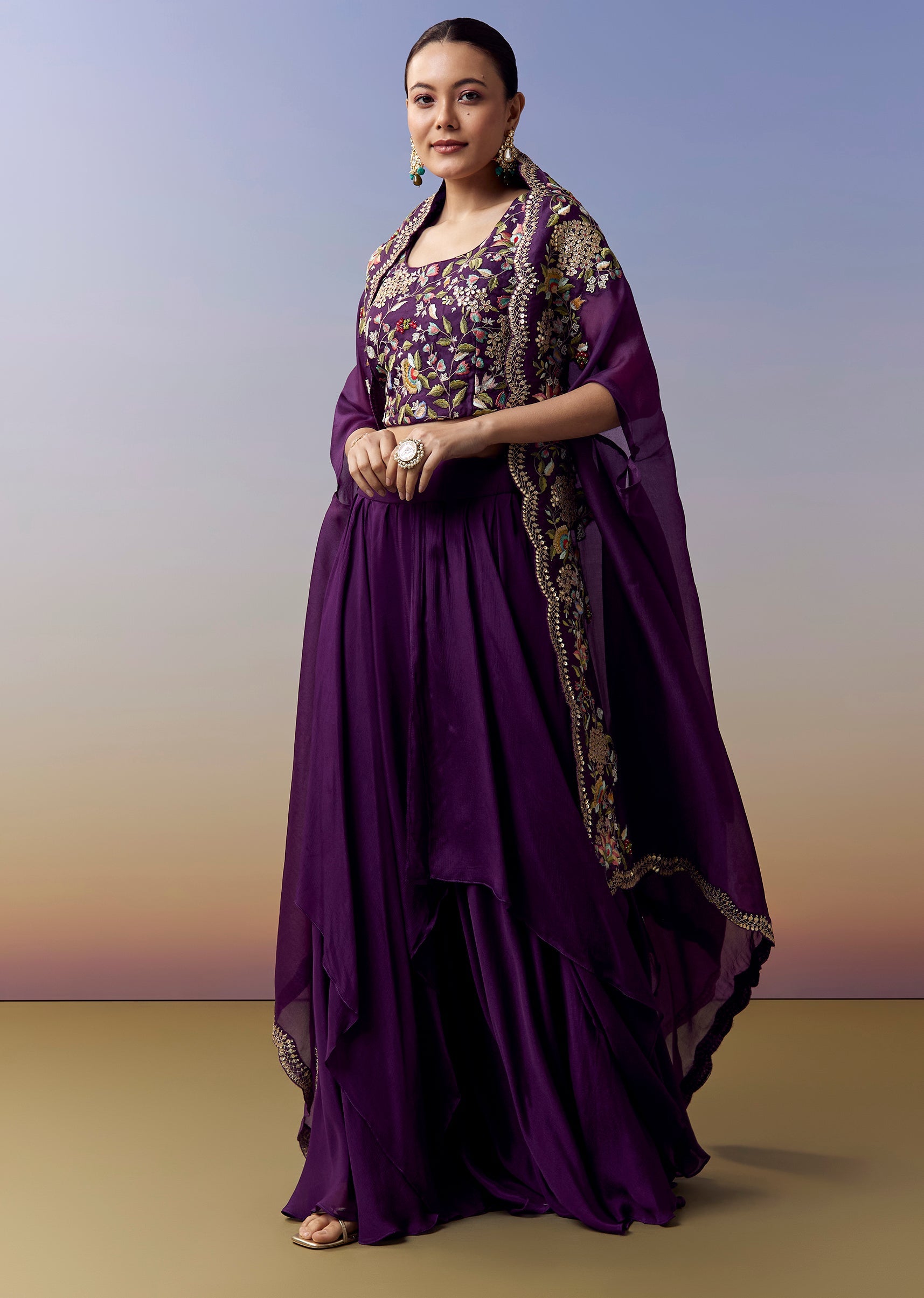 Purple Indo Western Crop Top Skirt Set With Parsi Work