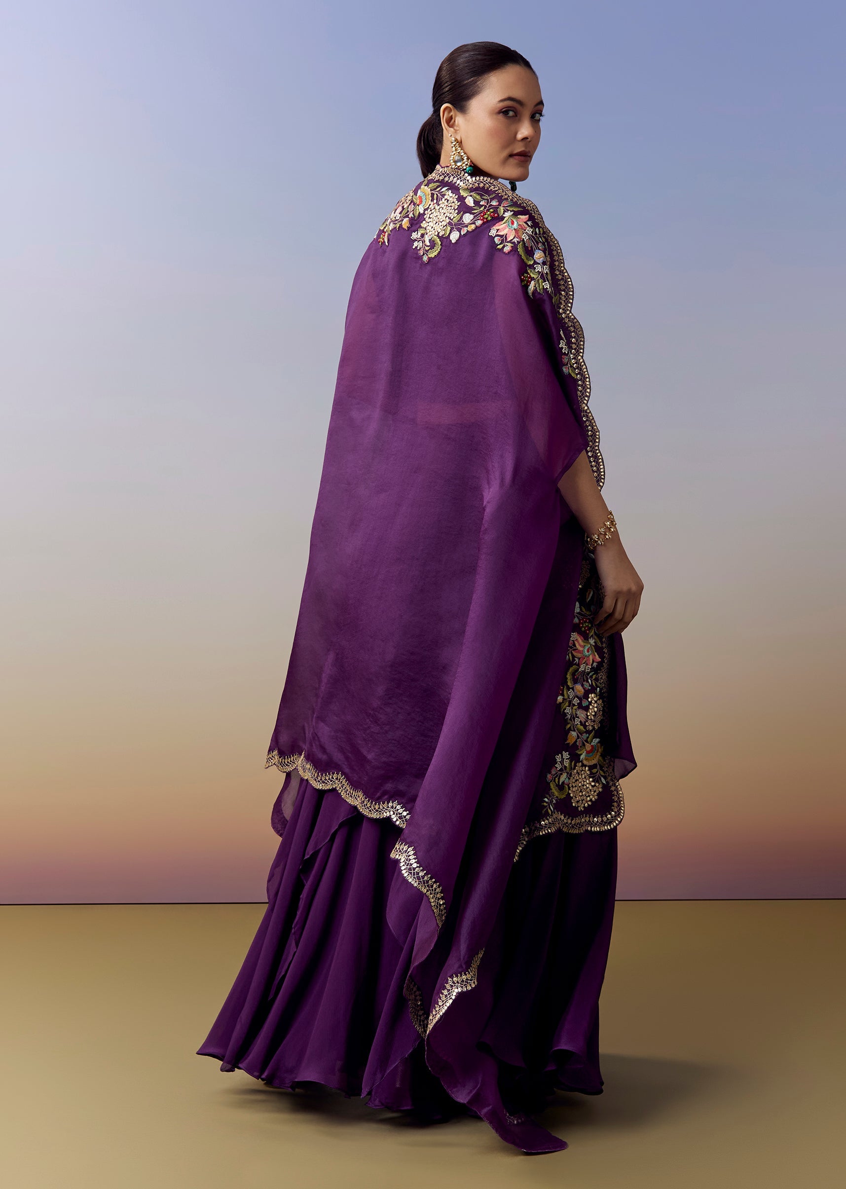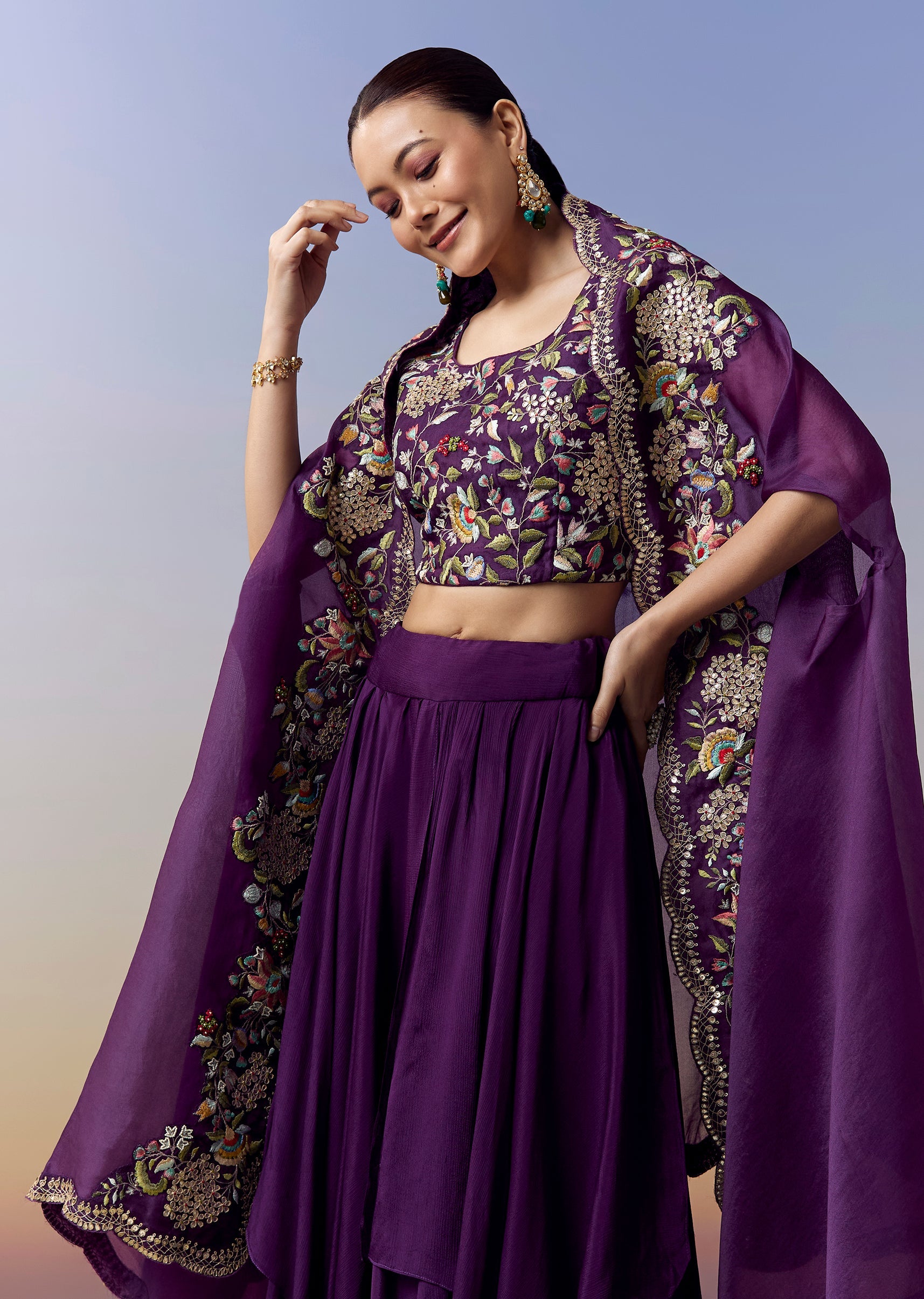 Vibrant and contemporary, this purple crop top and skirt set is crafted for wedding, sangeet and mehendi celebrations. The satin material offers a smooth lustrous fall, while the coordinated cape... More Product Details