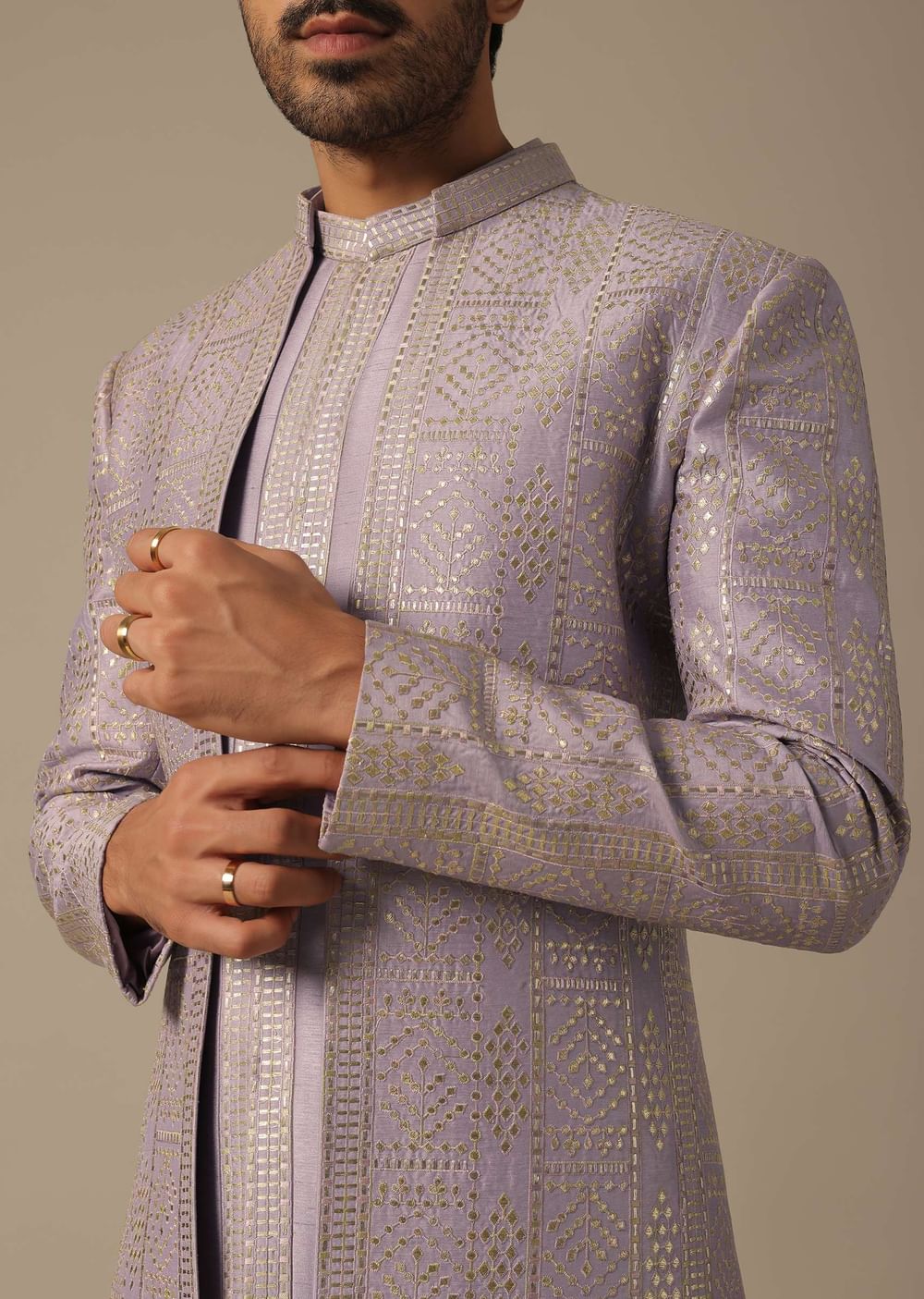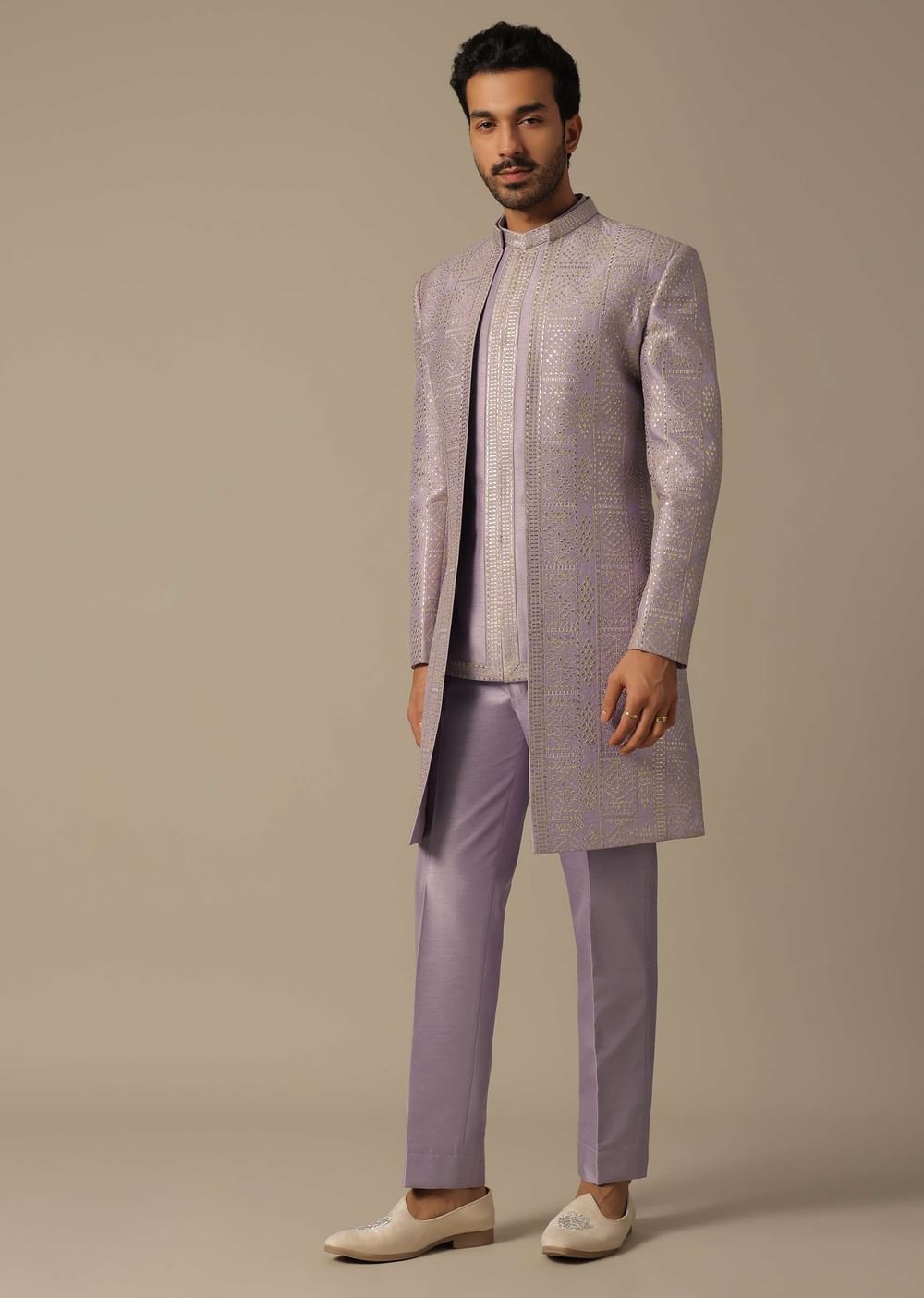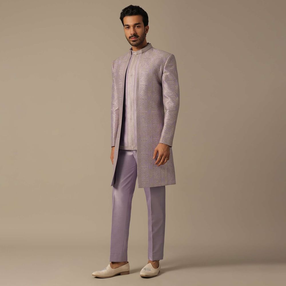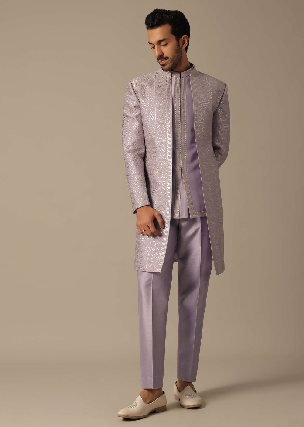 Embody regal sophistication in our Purple Silk Indowestern. It showcases intricate zari embroidery all over. The pack includes an indowestern, bandi, and trouser. This ensemble, featuring a mandarin collar and... More Product Details
