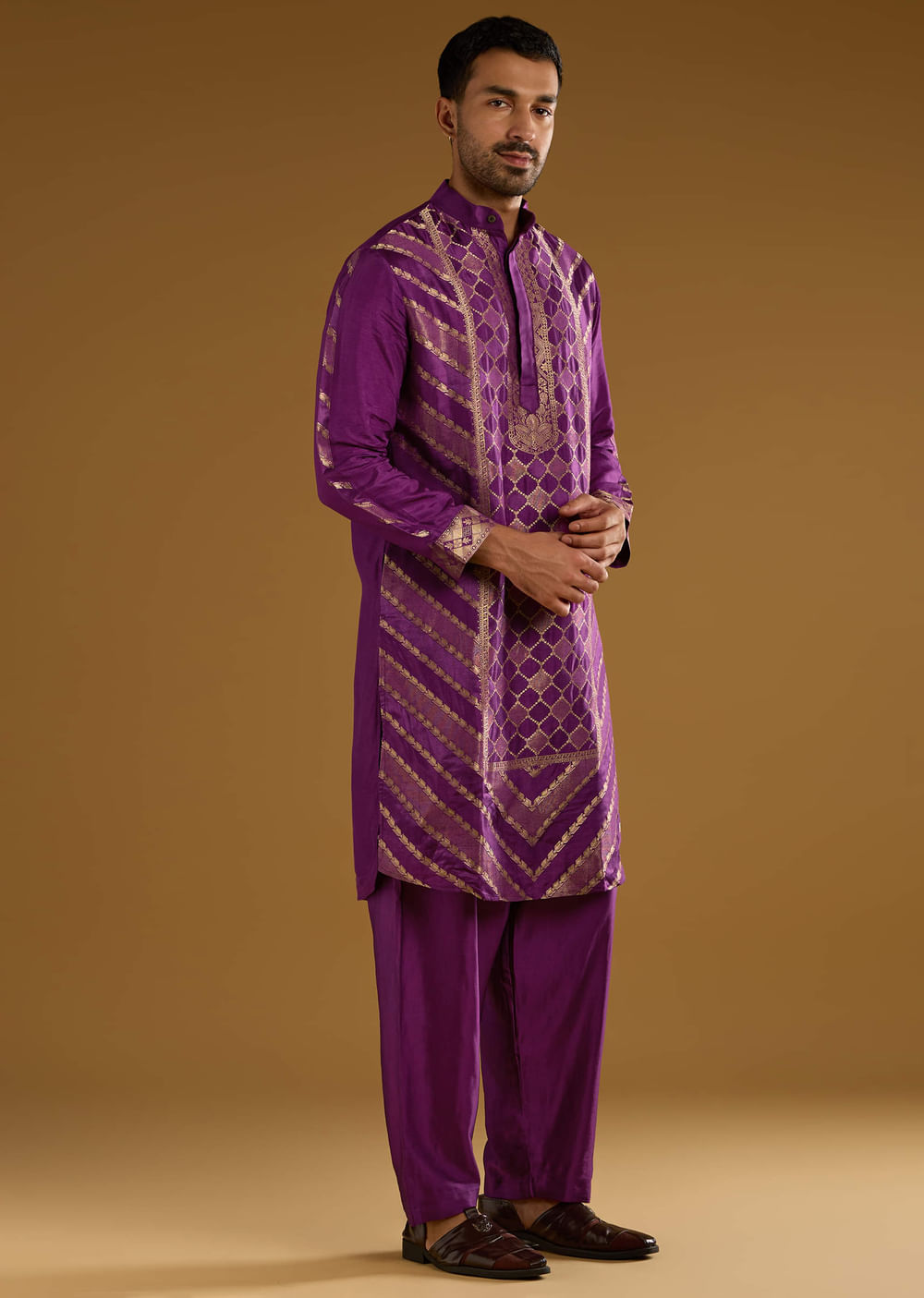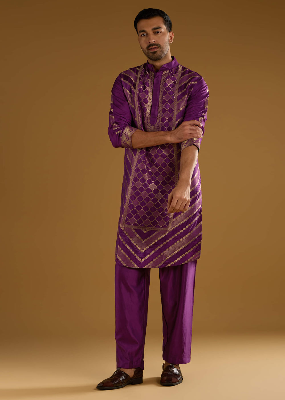 Depth without weight defines this purple jacquard men’s kurta set, where the handwoven weave catches light in a measured way. The colour reads rich while the pattern keeps the silhouette disciplined. You arrive composed and festive for haldi and mehendi. Awarded as the Most Trusted Brand, we're delivering styles you love, just as promised.