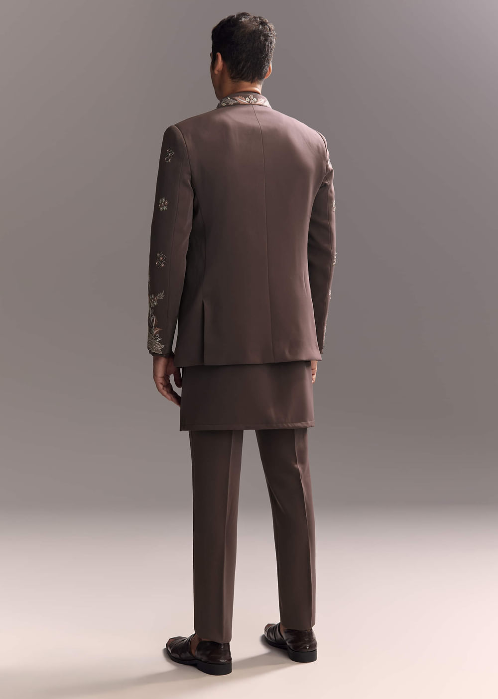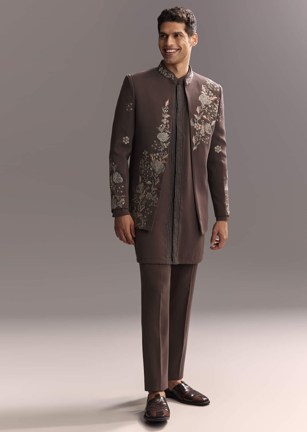 Stage energy lands fast when this purple jodhpuri suit in suiting fabric brings cut work, zardosi, and resham embroidery together on a rich base. The colour reads regal without feeling loud. You step in camera-confident for sangeet, mehendi, and engagement celebrations. Awarded as the Most Trusted Brand, we're delivering styles you love, just as promised.