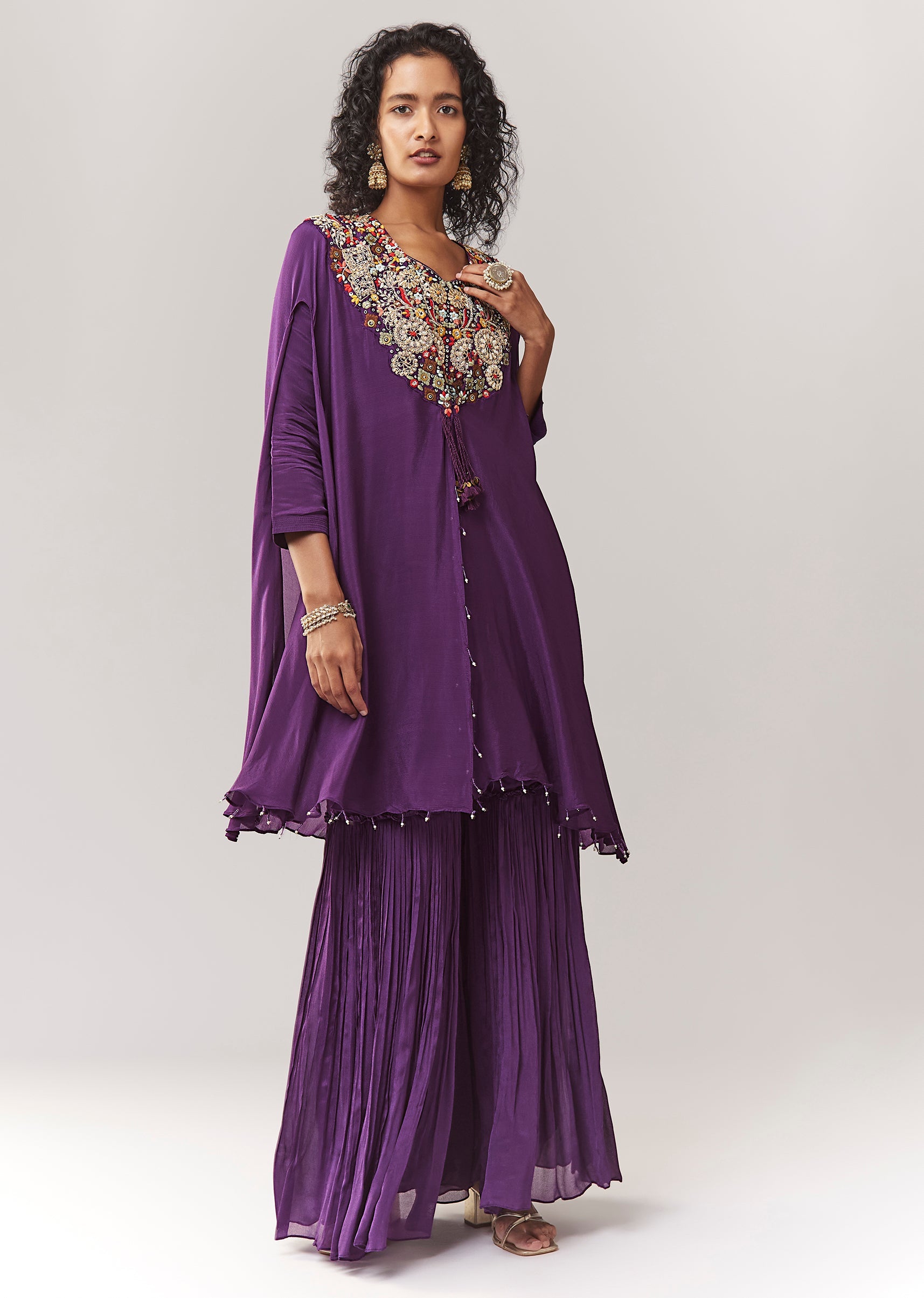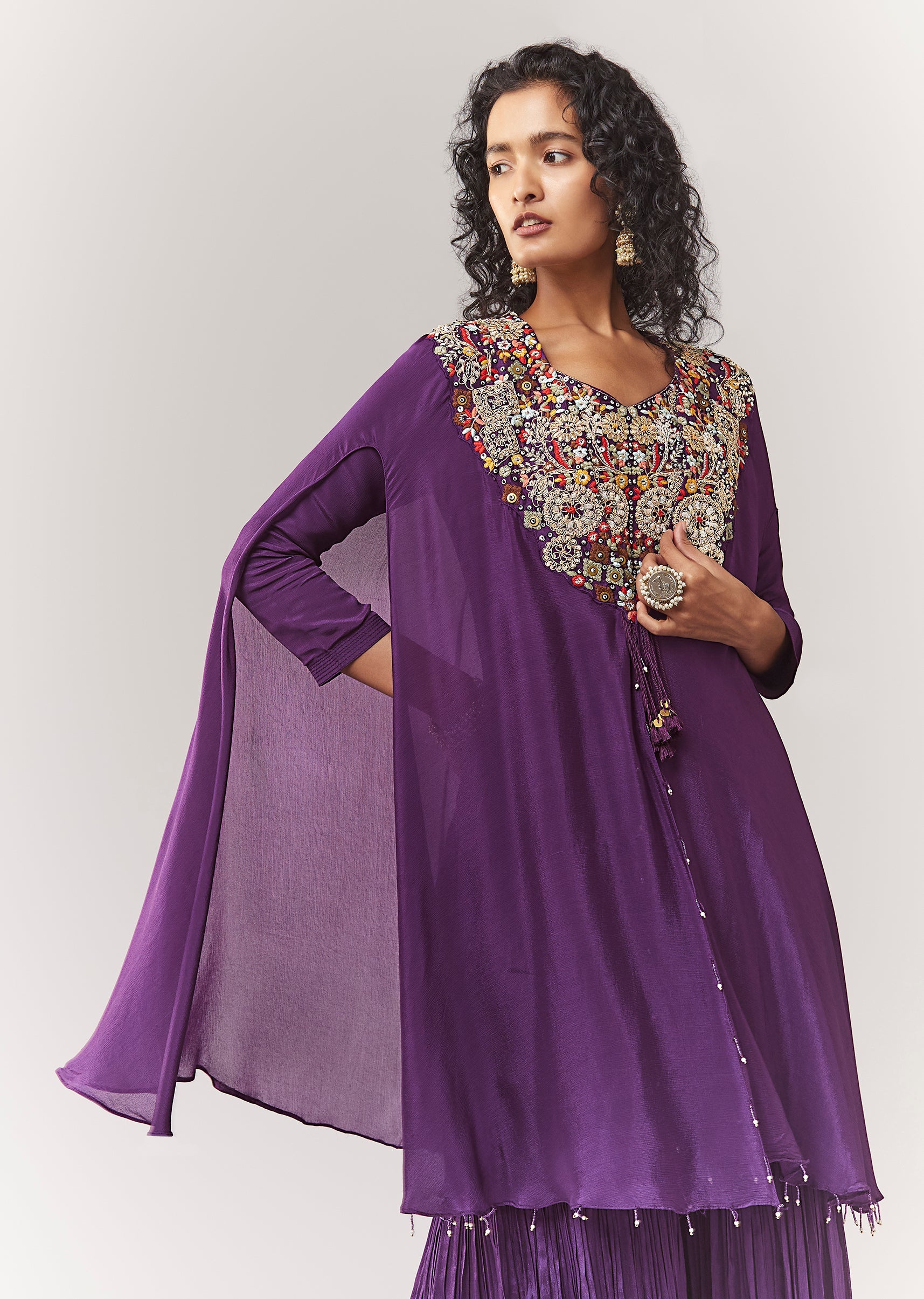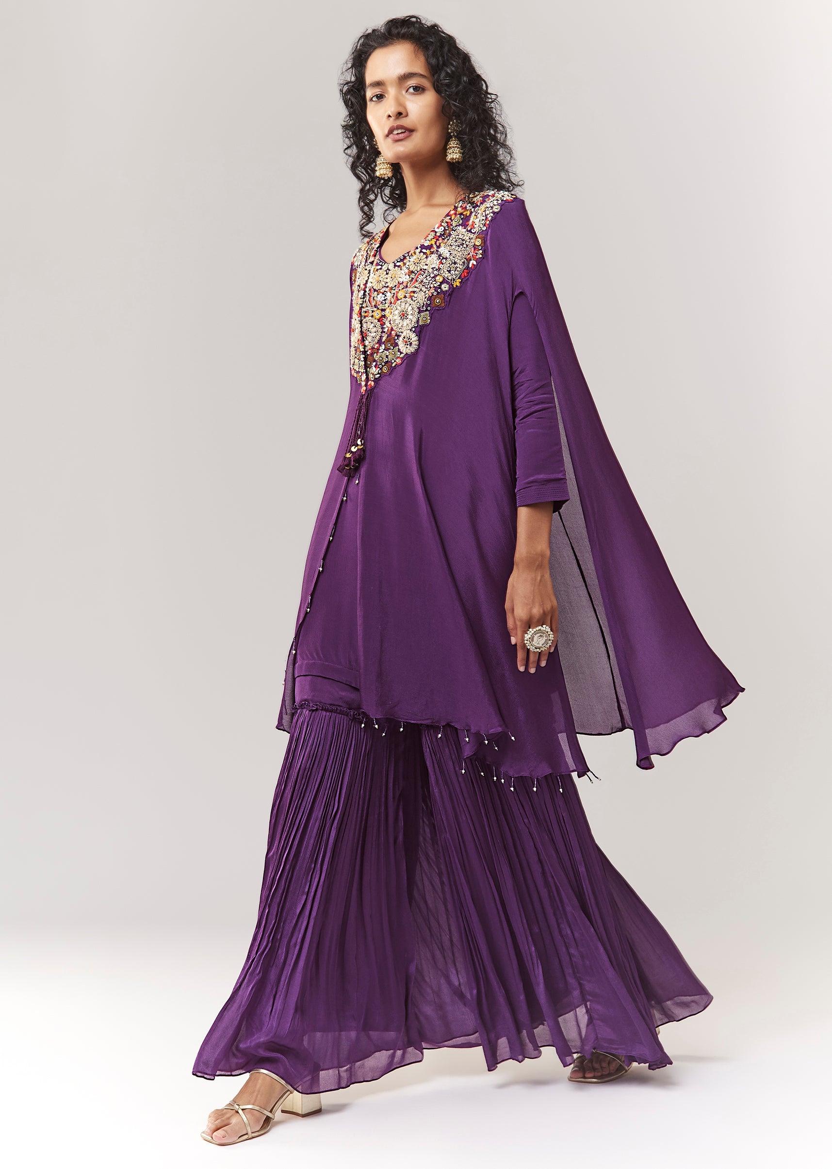 Purple Kurta Cape Sharara Set With Thread And Zardosi Work