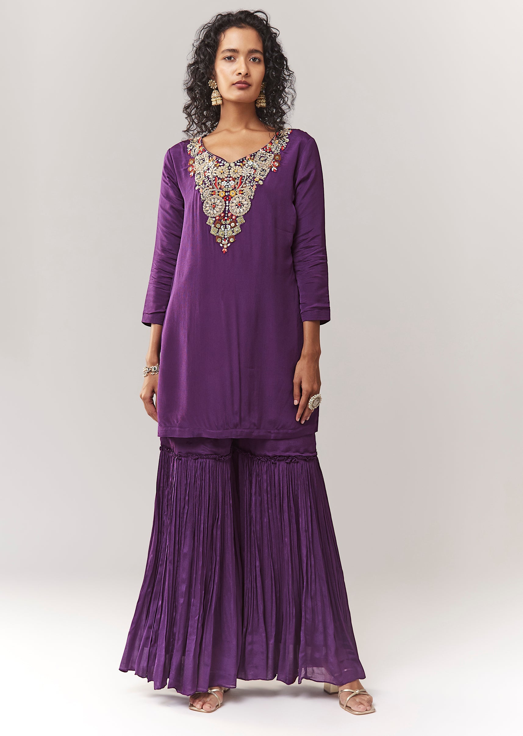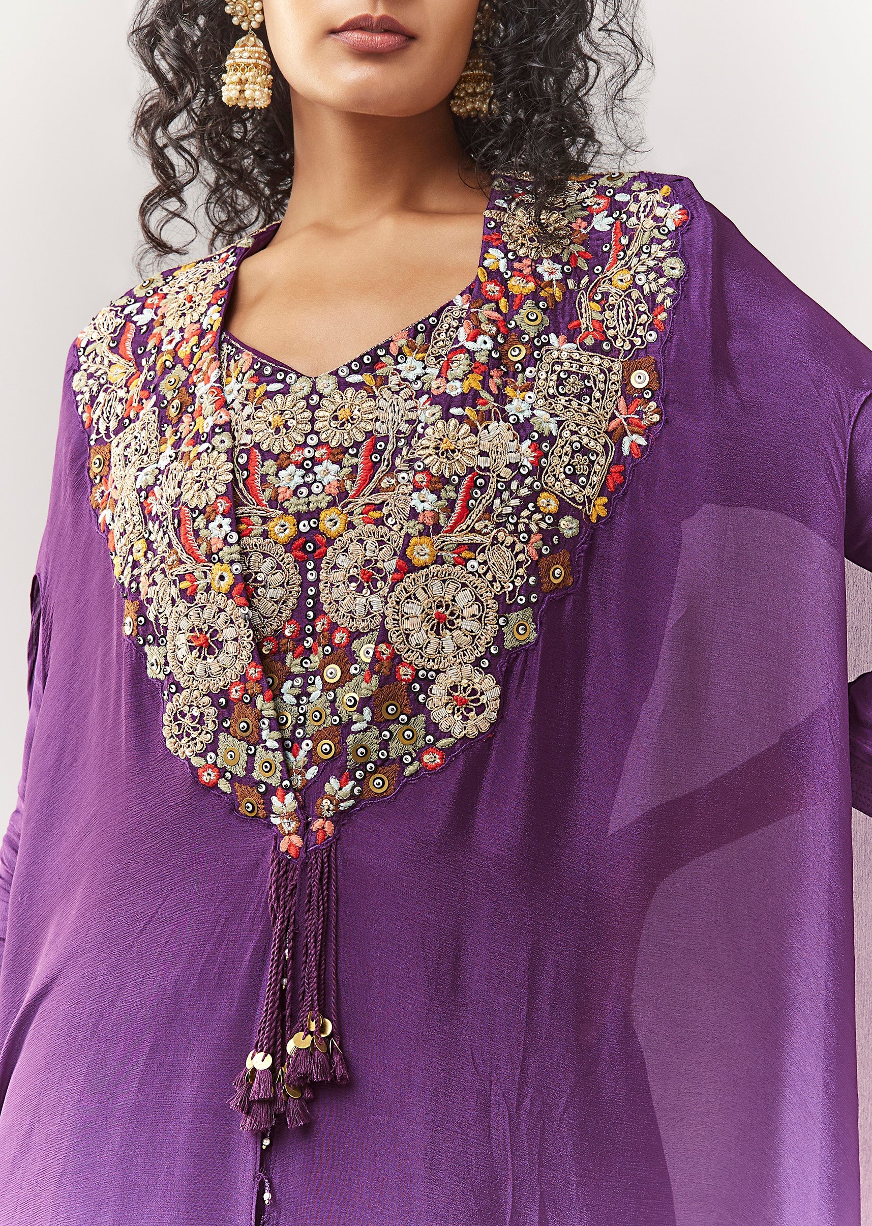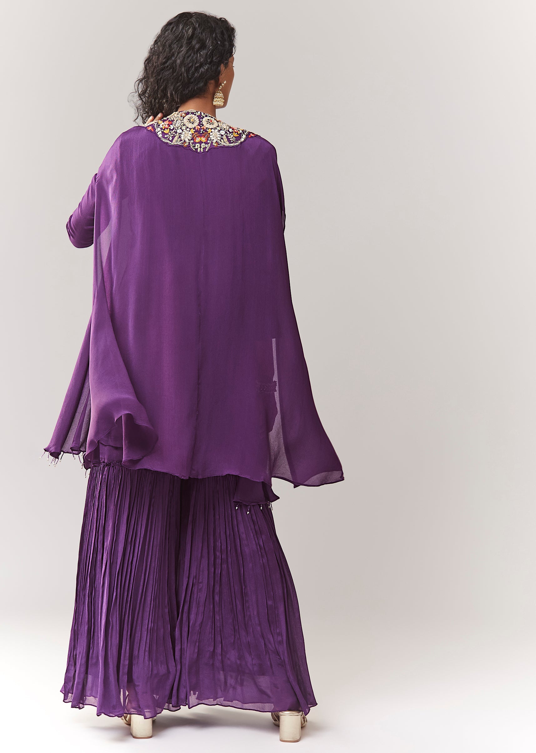 Purple Kurta Cape Sharara Set With Thread And Zardosi Work