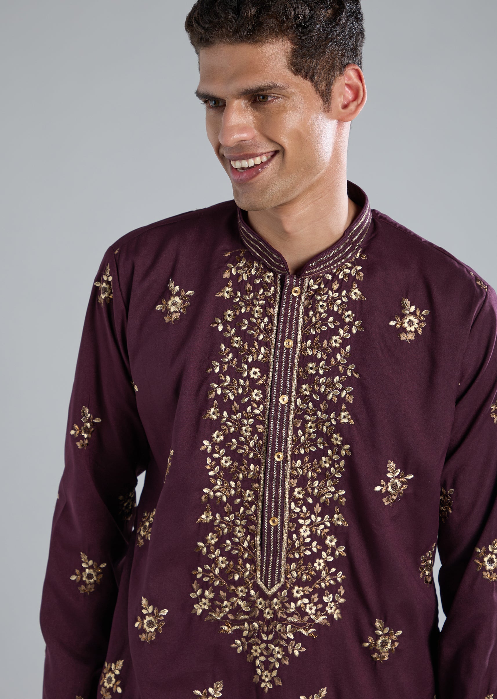 Elegant and rich in tone, this purple kurta set is crafted using silk as the primary fabric with art silk as the secondary base for a smooth and refined finish. Subtle thread and resham detailing add texture while the mandarin collar and full sleeves lend a structured and timeless appeal. Designed with front button closures for both the kurta and the bottoms, this set brings comfort and sophistication together, making it ideal for festive gatherings and special occasions. Slight variation in color is possible due to photography. Awarded as the Most Trusted Brand, we're delivering styles you love, just as promised.