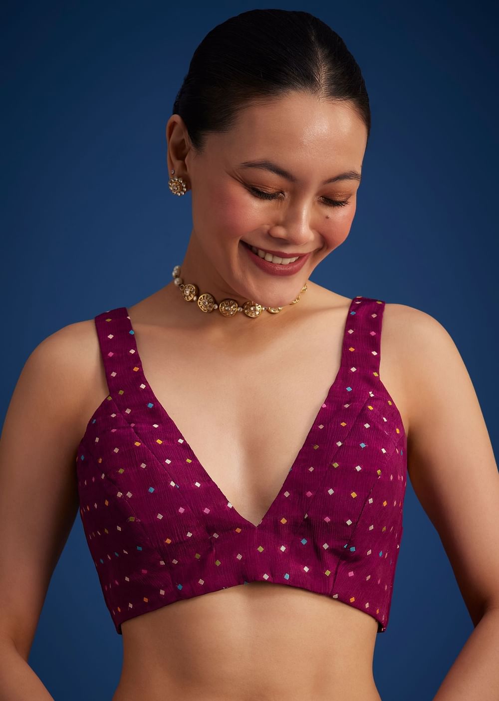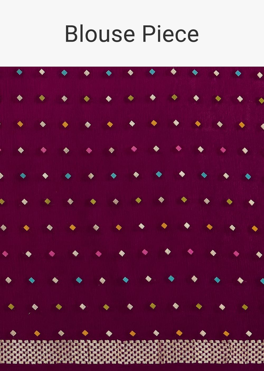 - Step into sophistication with this purple saree adorned with delicate leaf woven and contrasting linear patterns across the body.