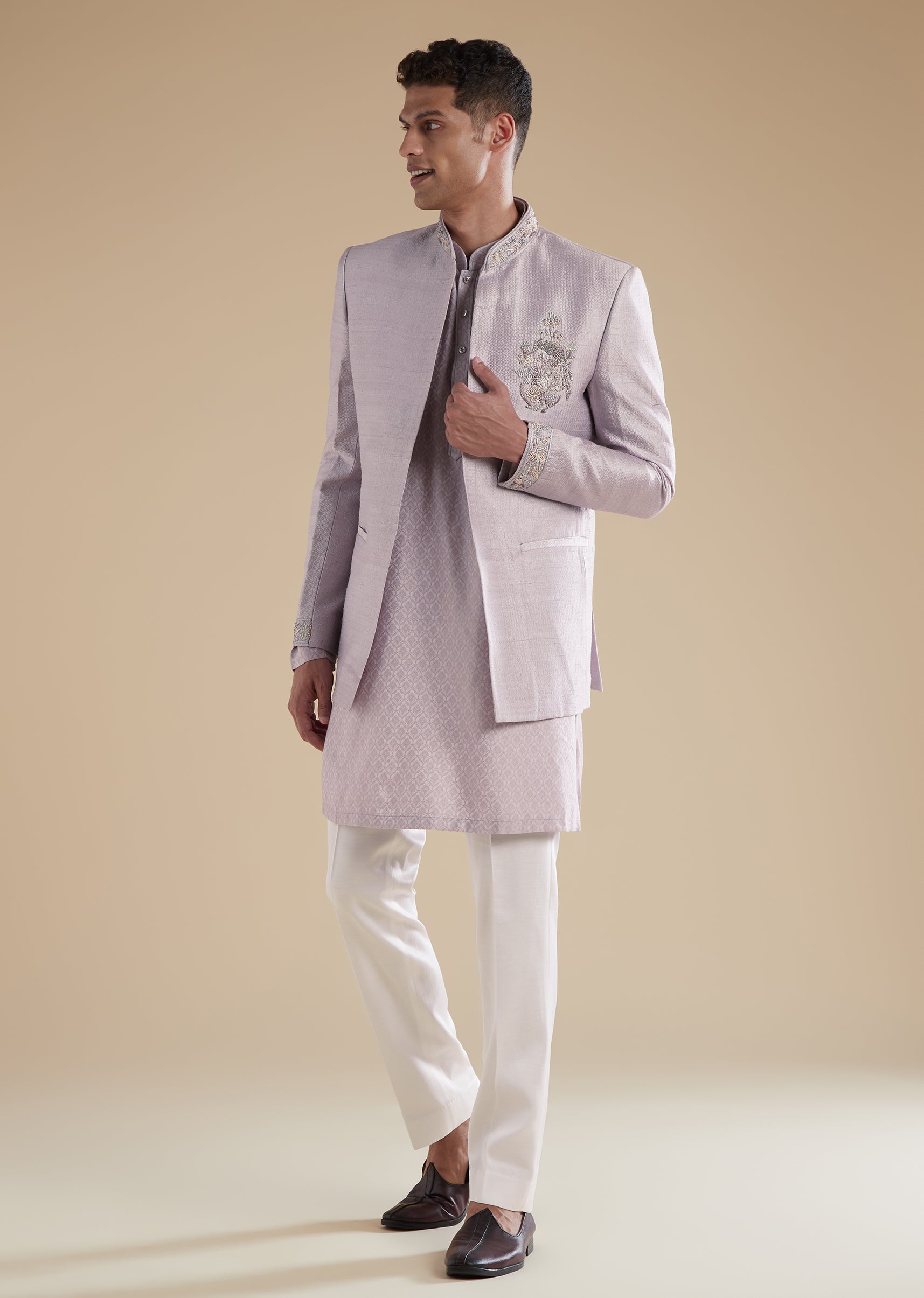 Designed for pastel themed festivities, this purple lilac indowestern is tailored in rich jacquard as the primary fabric with silk as the secondary for a refined and contemporary celebration look.... More Product Details