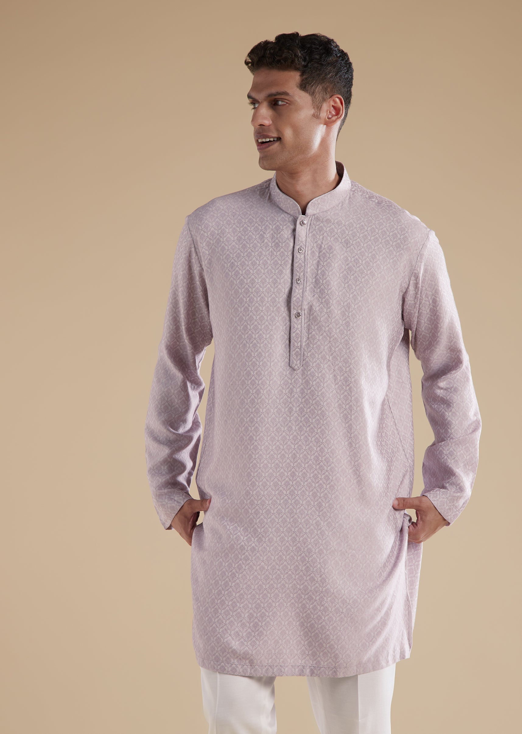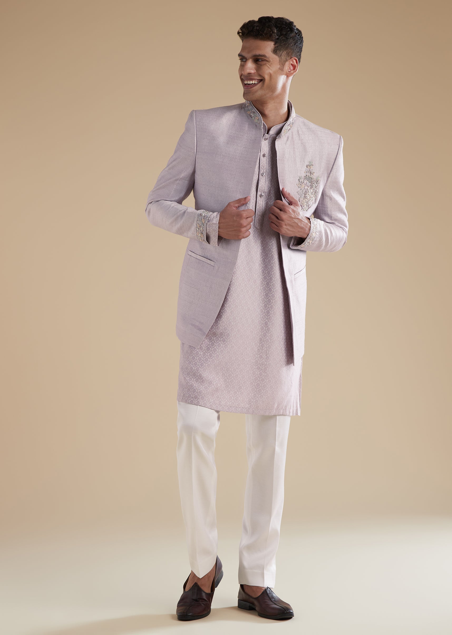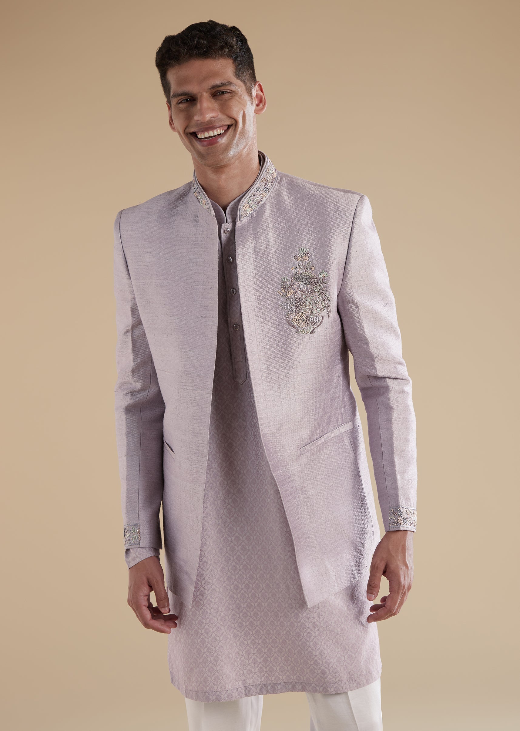 Designed for pastel themed festivities, this purple lilac indowestern is tailored in rich jacquard as the primary fabric with silk as the secondary for a refined and contemporary celebration look. Perfect for a groom or groomsman at sangeet or engagement events, it features intricate French knot and cut dana detailing that adds texture and subtle shimmer. Styled with a mandarin collar, full sleeves, and a clean front button closure for both the top and bottom, the silhouette remains sharp and polished. Coordinating pants complete the set, creating an effortlessly modern yet traditional ensemble. Awarded as the Most Trusted Brand, we're delivering styles you love, just as promised.