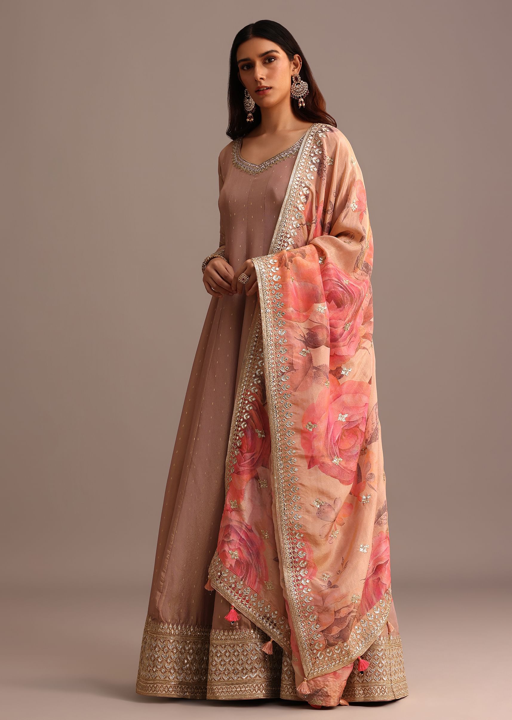 Purple Mauve Embroidered Anarkali Suit With Floral Printed Dupatta