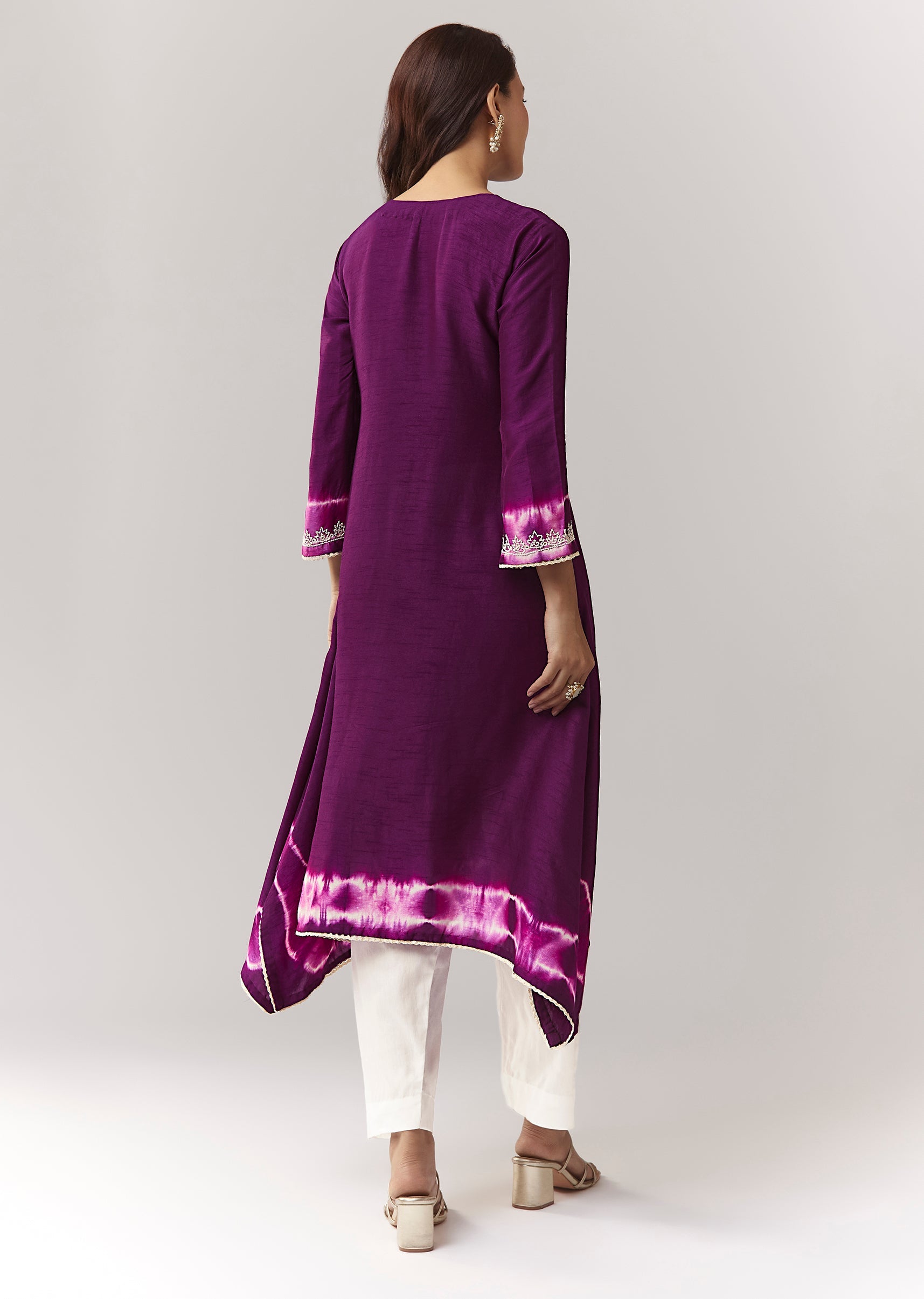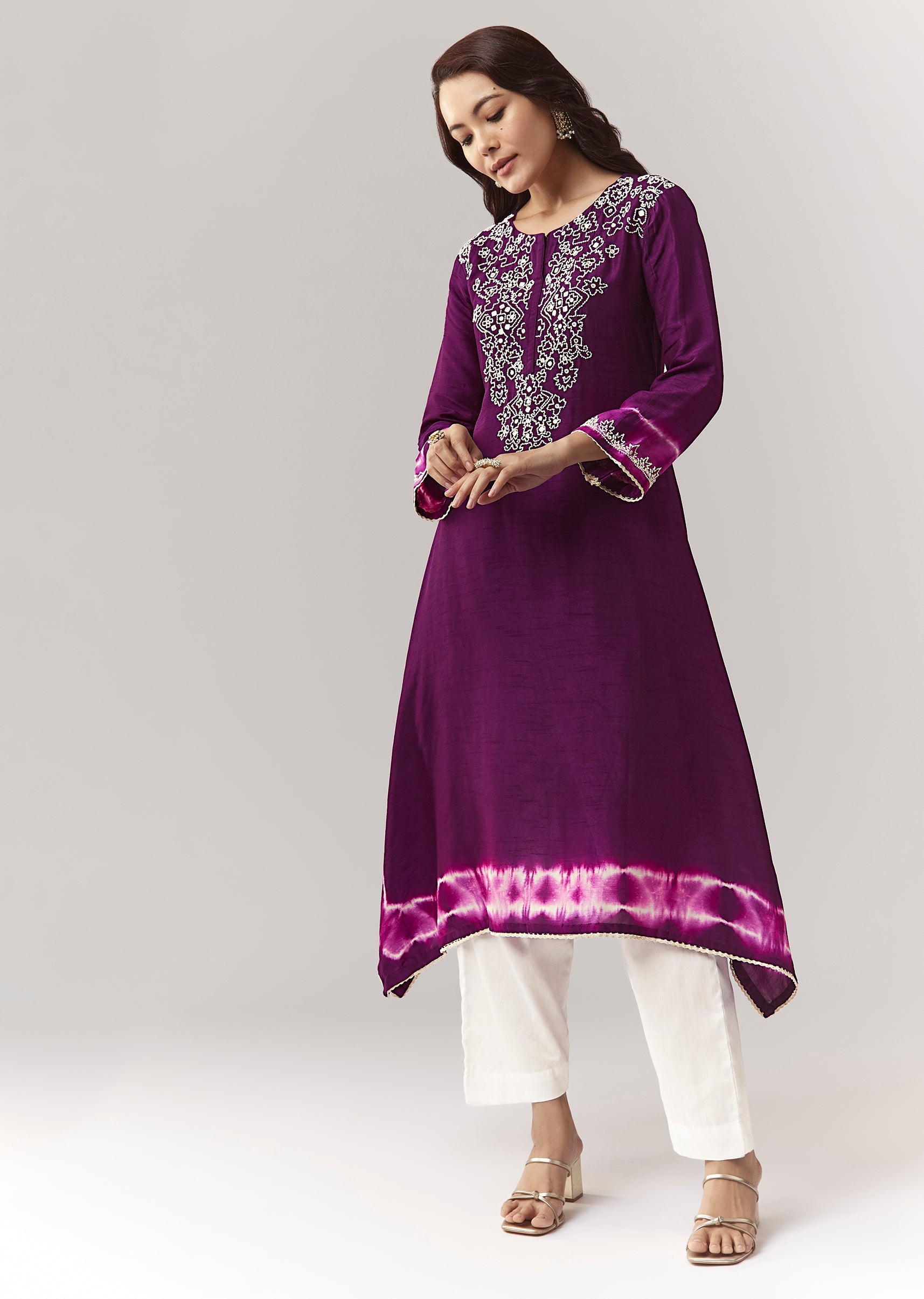 A purple asymmetric kurta with moti + mirror work and leheriya border, paired with straight pants. Minimal, elegant, and easy festive-casual. Awarded as the Most Trusted Brand, we're delivering styles... More Product Details