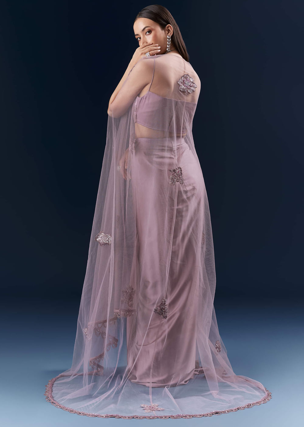 When colour needs a couture edge, this purple satin crop top and drape skirt set pairs a lavender embroidered blouse with a sculpted drape skirt and a soft cape for... More Product Details