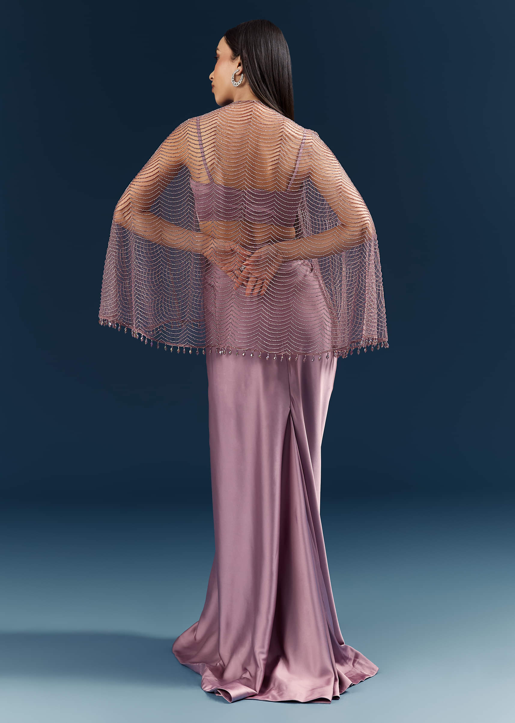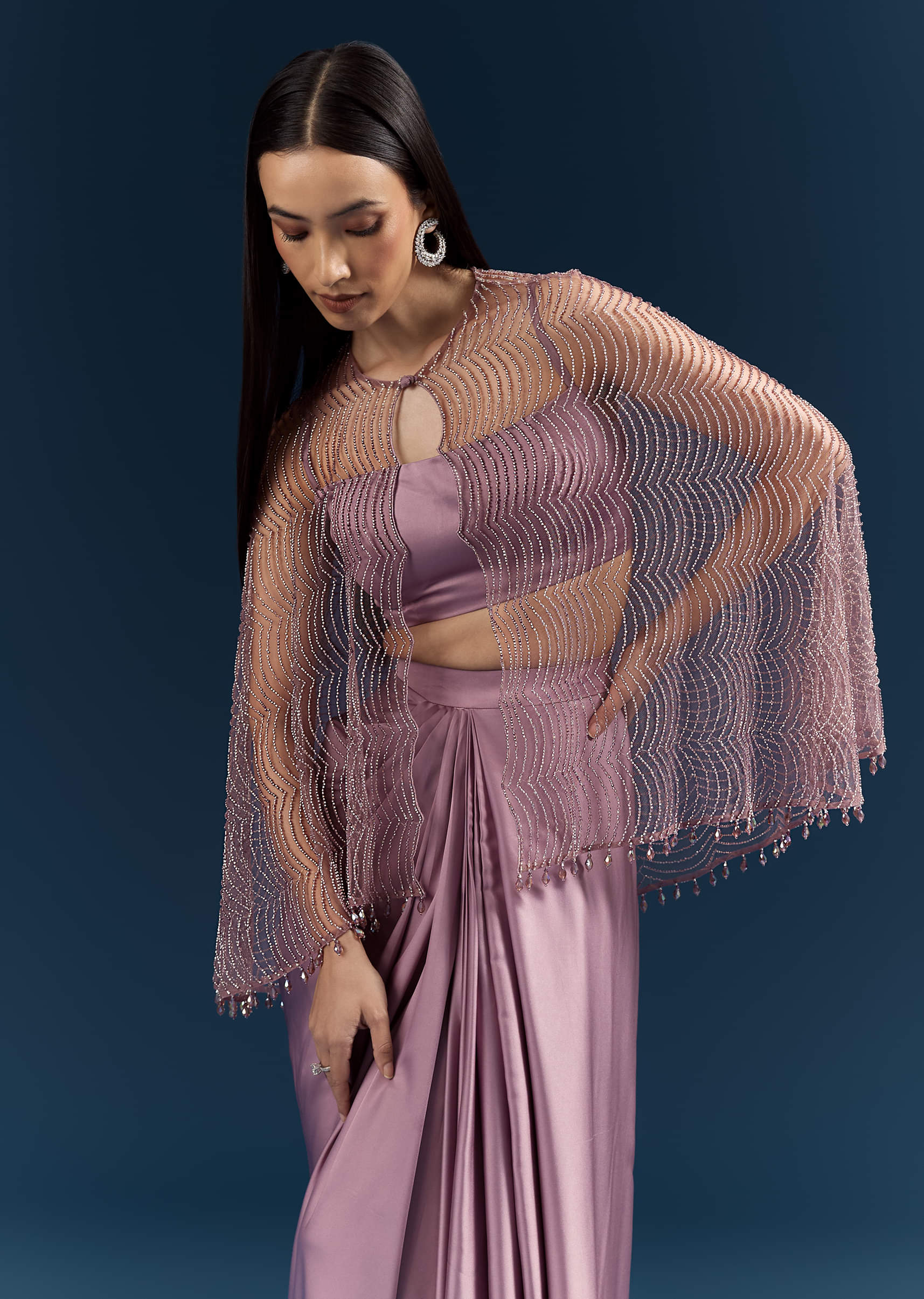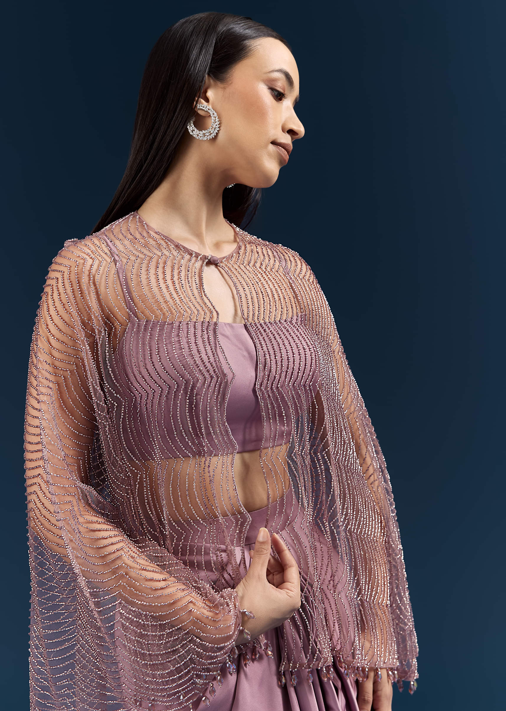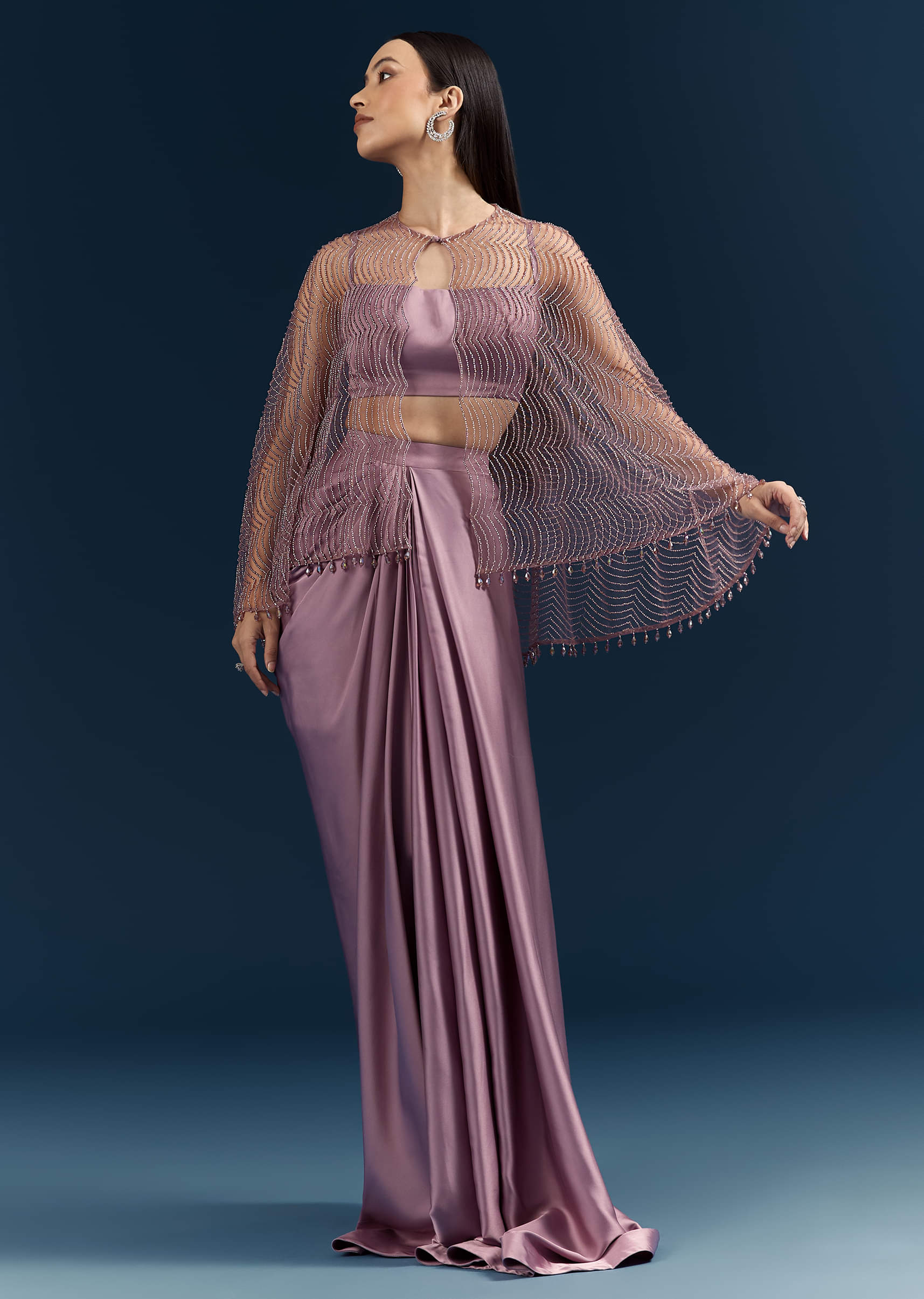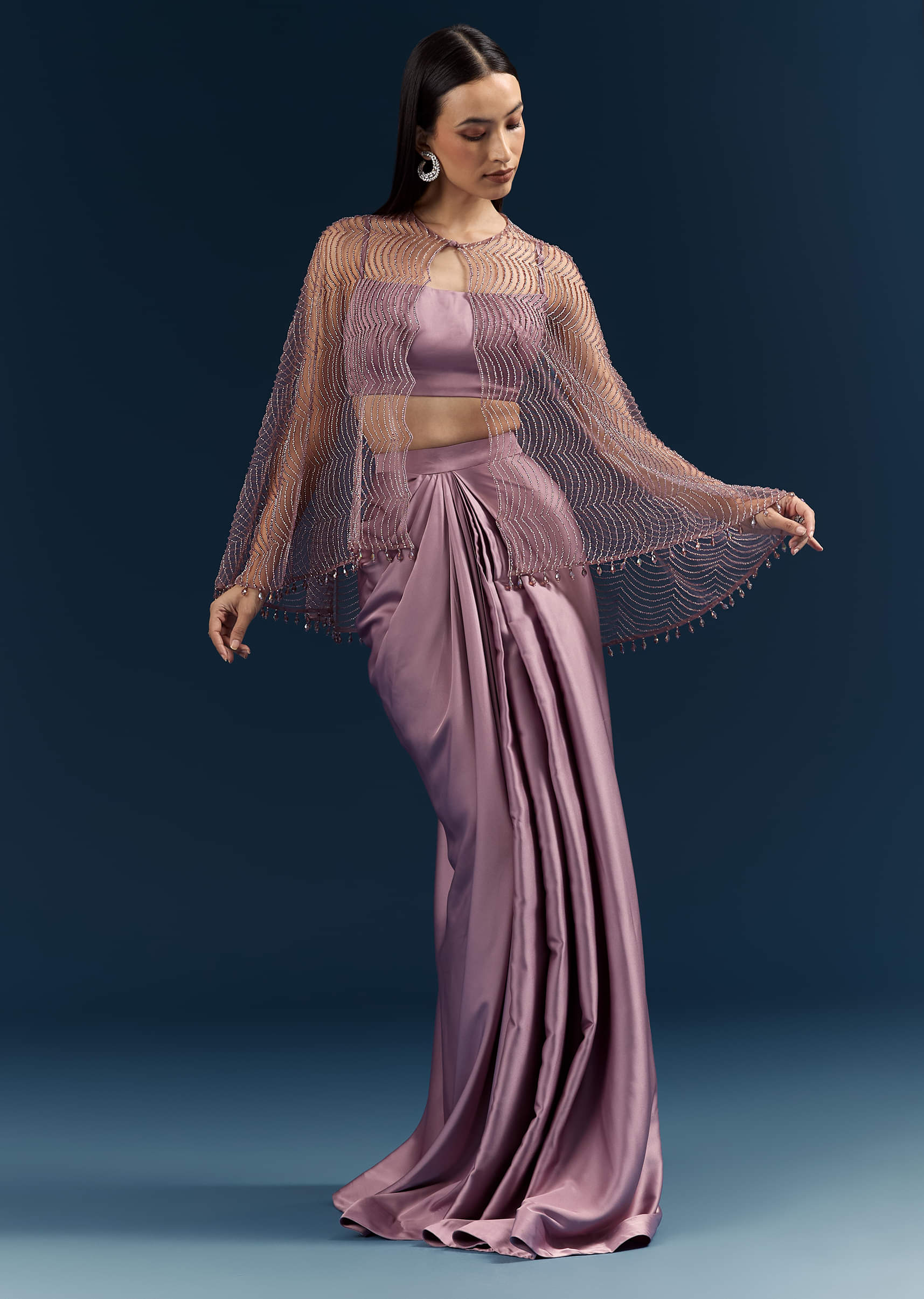 A pop of purple brings vibrant energy to this satin crop top and drape skirt set, with bead and cutdana work adding shine. Bridesmaids and guests alike will love its... More Product Details