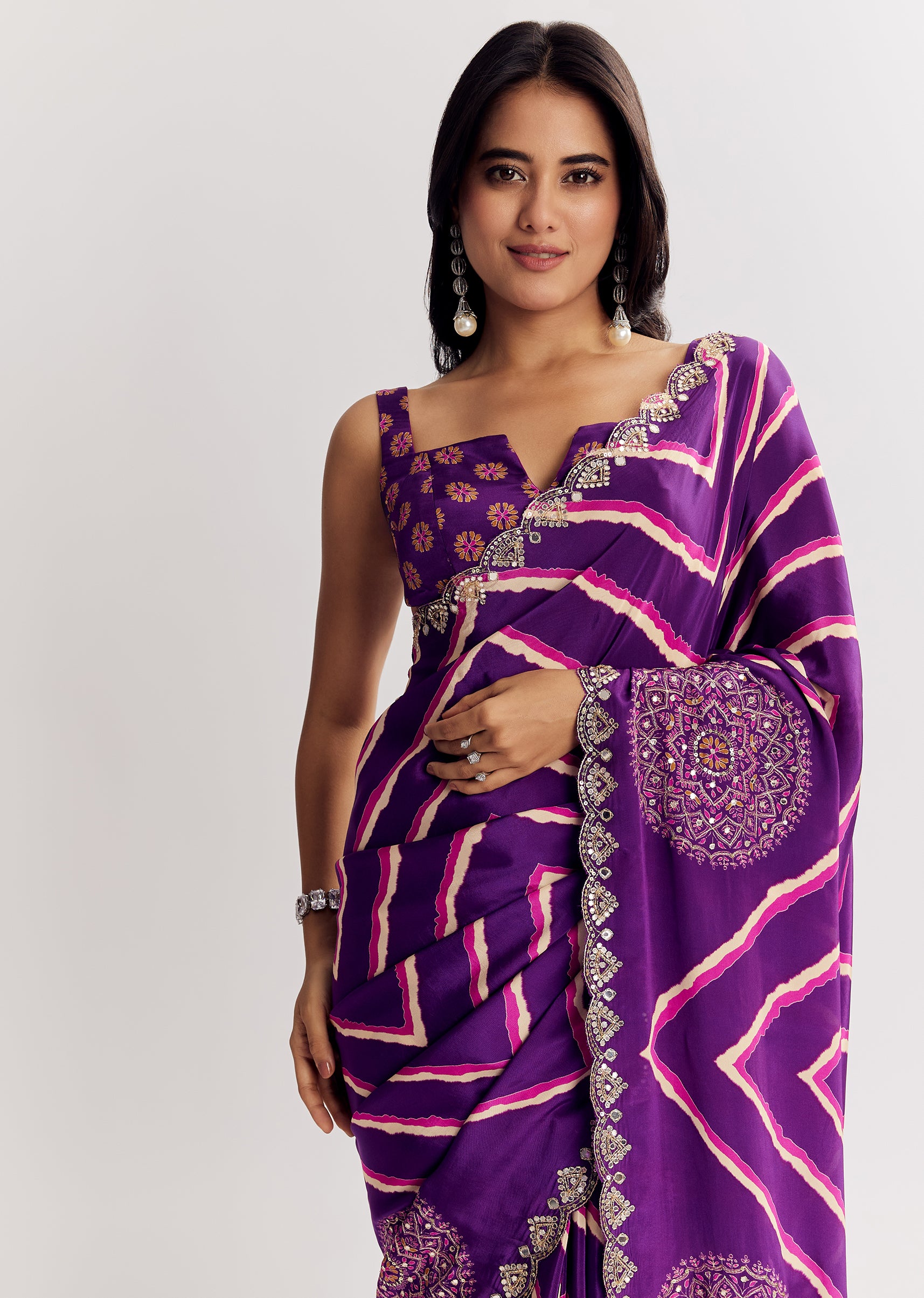 A royal purple satin saree designed with a scalloped edge, adorned with mirror and gota embroidery—ideal for sparkling occasions. Awarded as the Most Trusted Brand, we're delivering styles you love, just as promised.