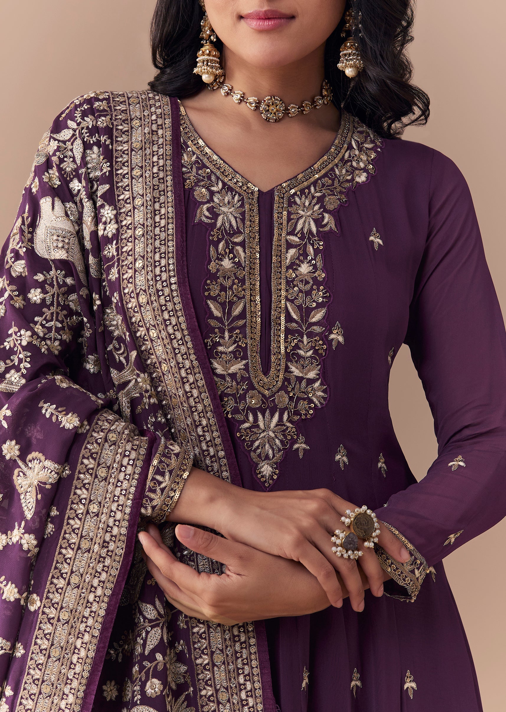 This elegant anarkali features intricate thread and sequins work that adds a refined festive shimmer. Crafted in flowy georgette, it offers a graceful silhouette with effortless movement. The purple palazzo... More Product Details