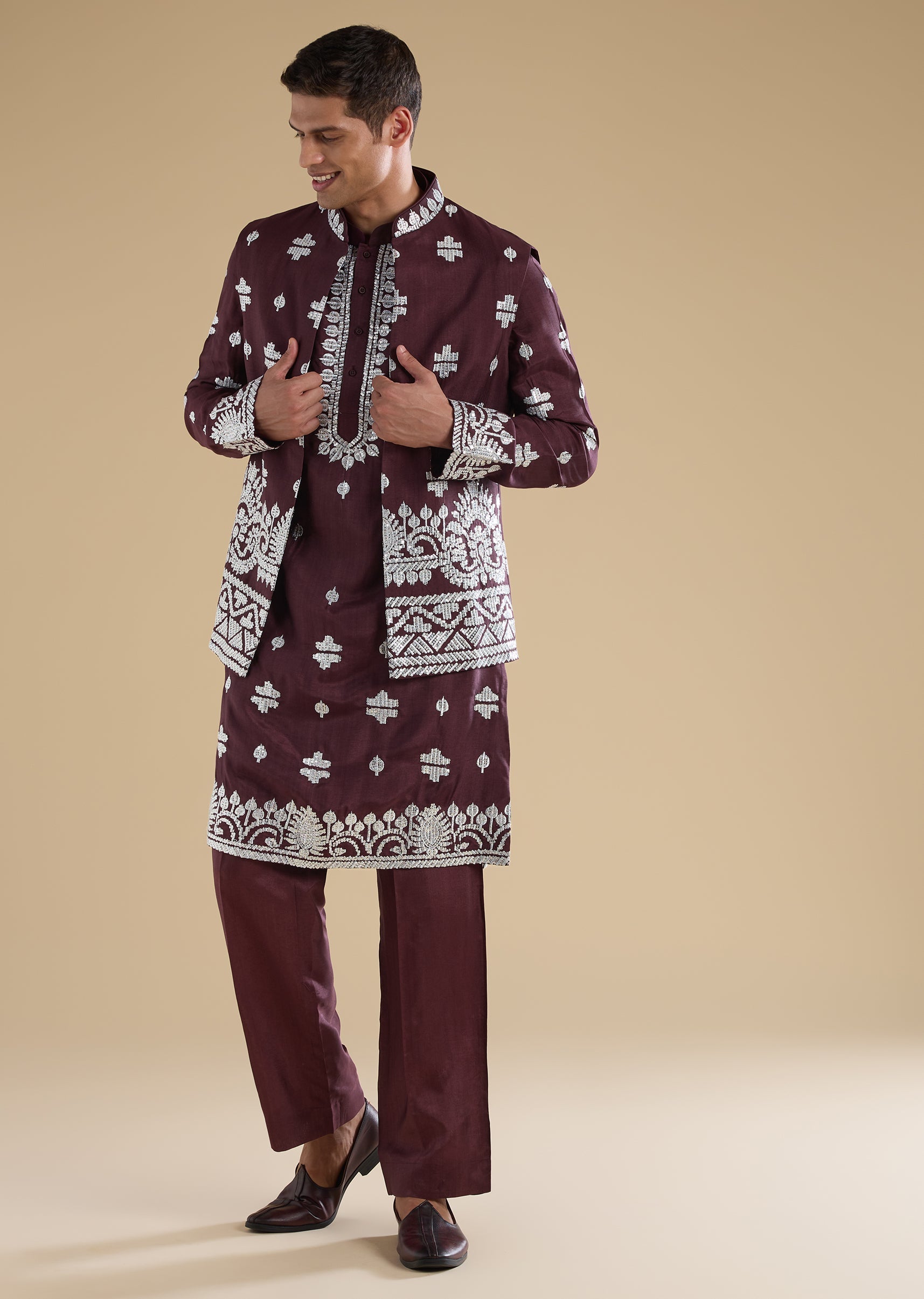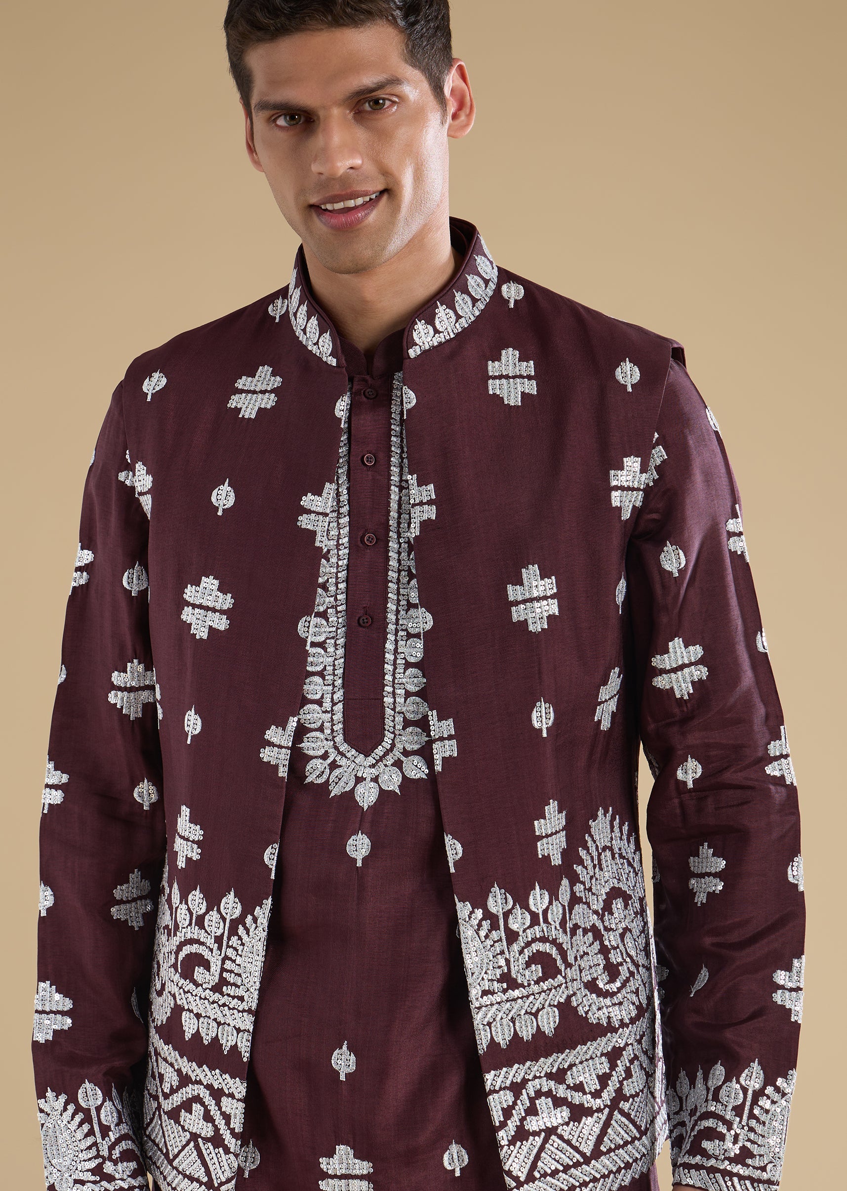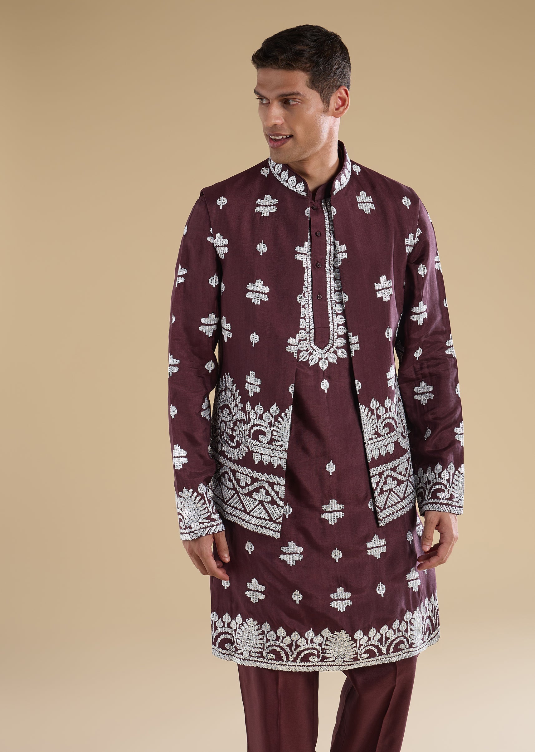 Regal and celebration-ready, this purple kurta jacket set is crafted in a luxurious silk-blend fabric for wedding occasions. The kurta features a mandarin collar, full sleeves, and side slits, paired with an embroidered jacket highlighted with zari and sequin detailing for a rich festive finish. Completed with straight-fit trousers and a partially elasticated waist, this ensemble is perfect for groomsmen duties and special wedding celebrations. Awarded as the Most Trusted Brand, we're delivering styles you love, just as promised.