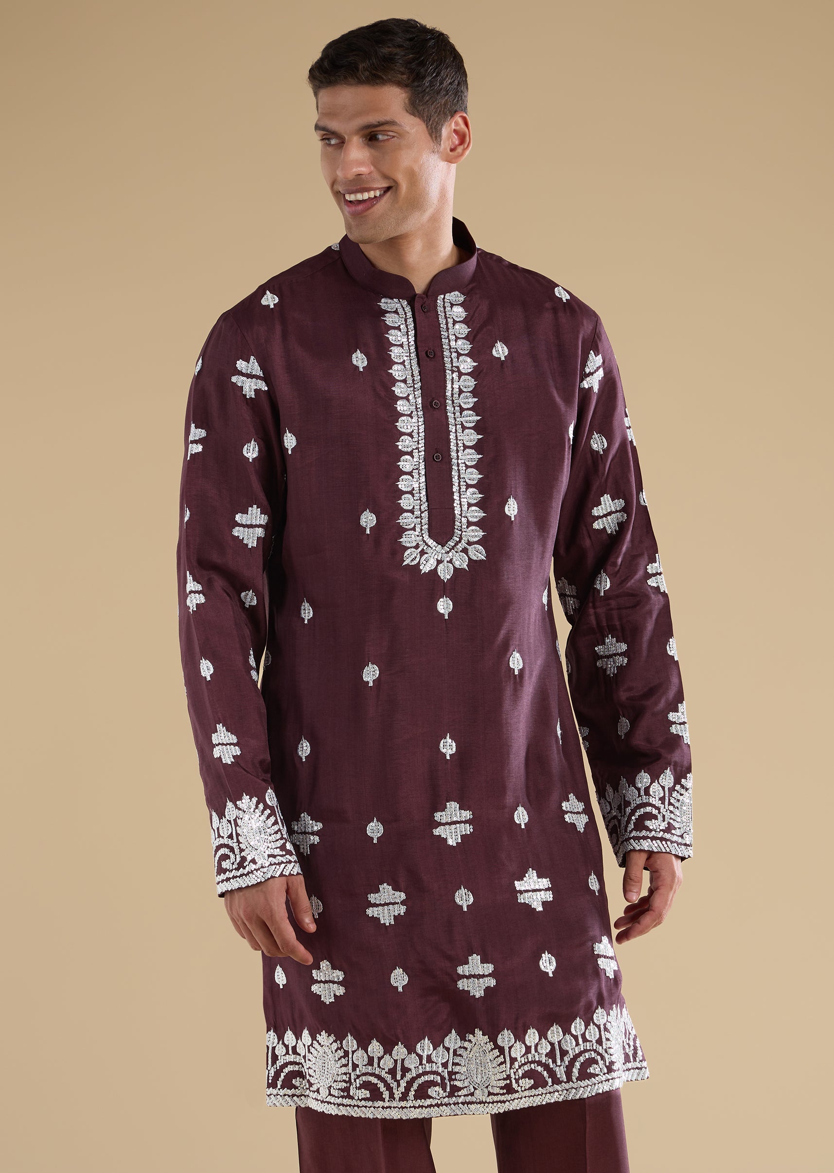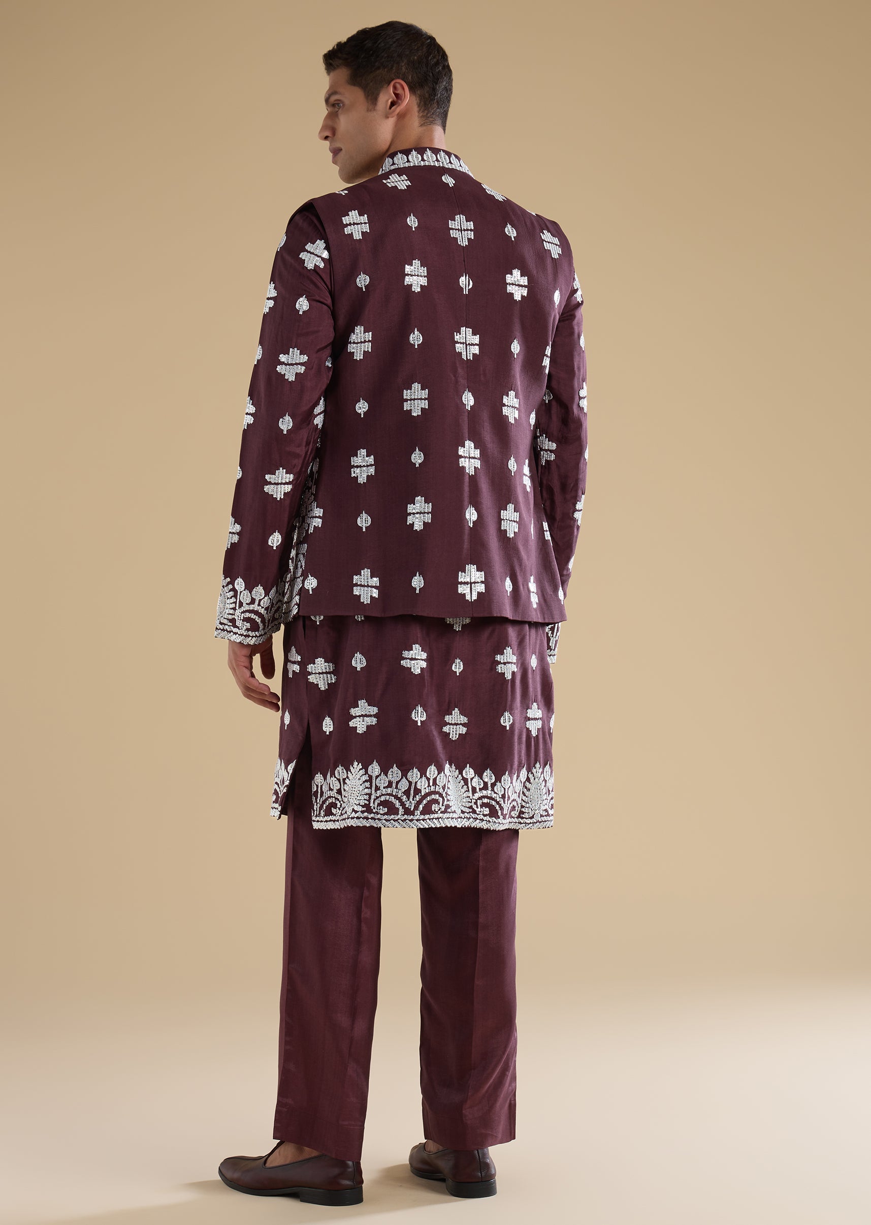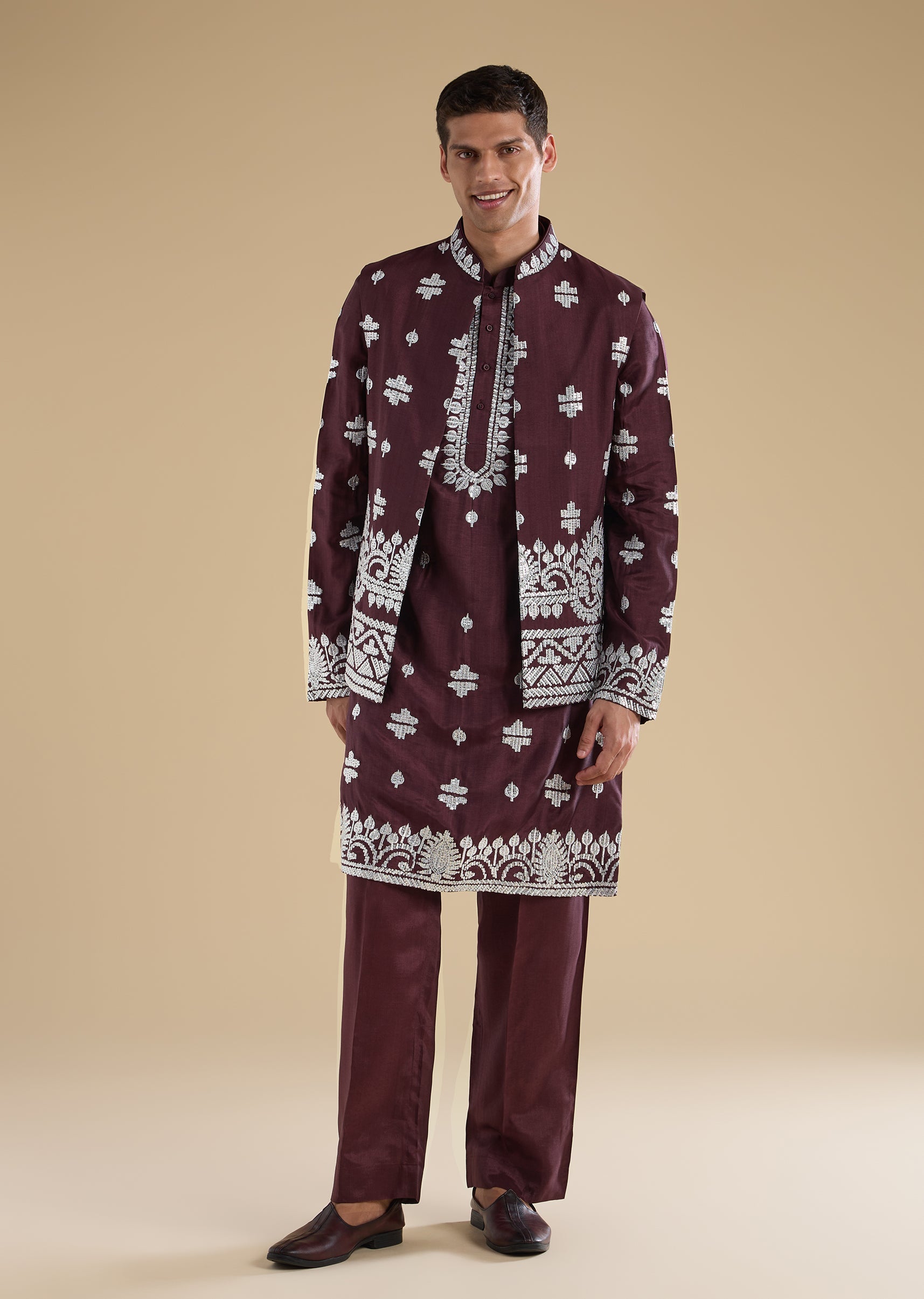 Regal and celebration-ready, this purple kurta jacket set is crafted in a luxurious silk-blend fabric for wedding occasions. The kurta features a mandarin collar, full sleeves, and side slits, paired with an embroidered jacket highlighted with zari and sequin detailing for a rich festive finish. Completed with straight-fit trousers and a partially elasticated waist, this ensemble is perfect for groomsmen duties and special wedding celebrations. Awarded as the Most Trusted Brand, we're delivering styles you love, just as promised.