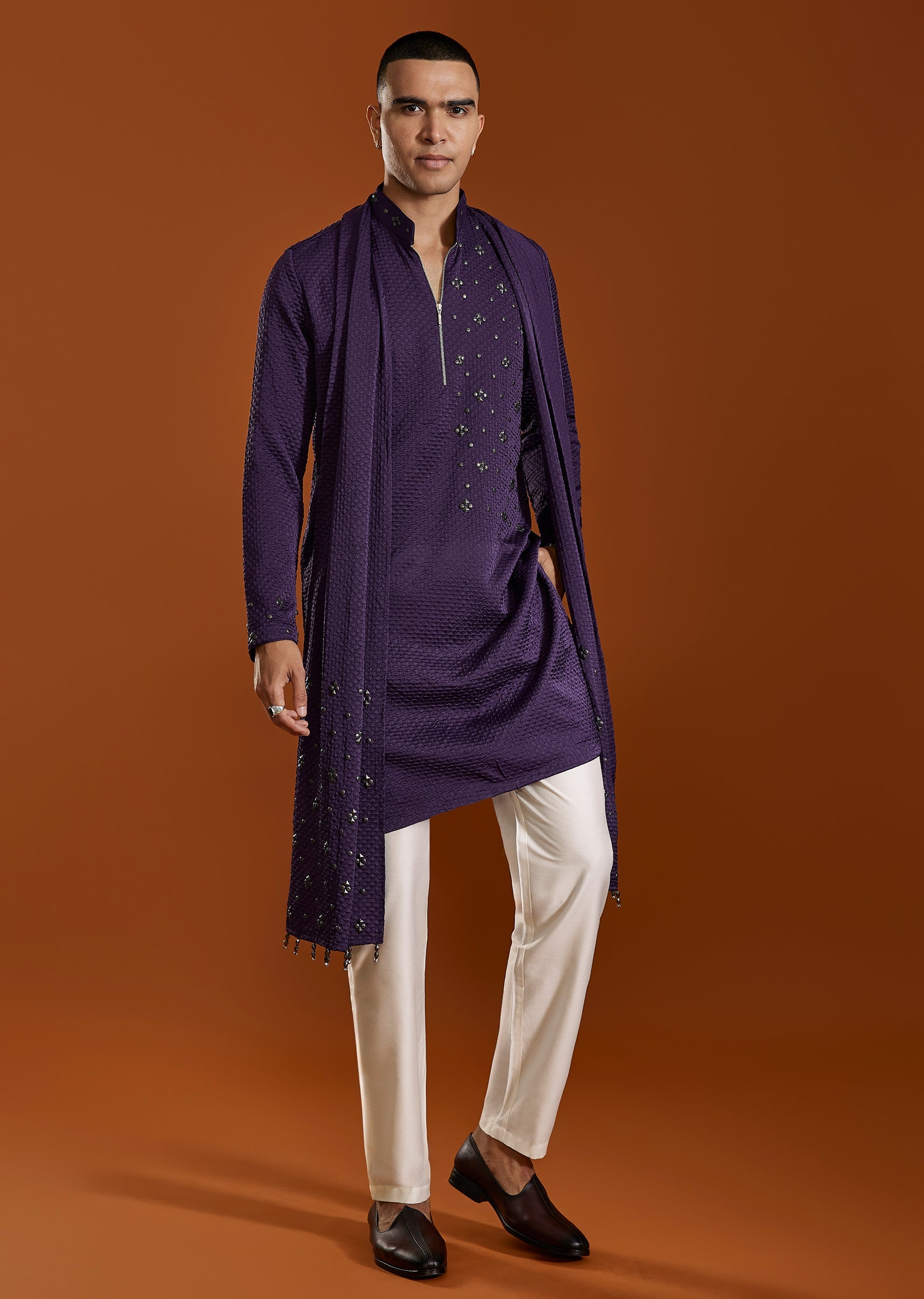 A rich purple silk kurta set designed with a sleek mandarin collar and contemporary front zip detailing. Paired with straight pants and a matching dupatta, this ensemble offers a refined... More Product Details