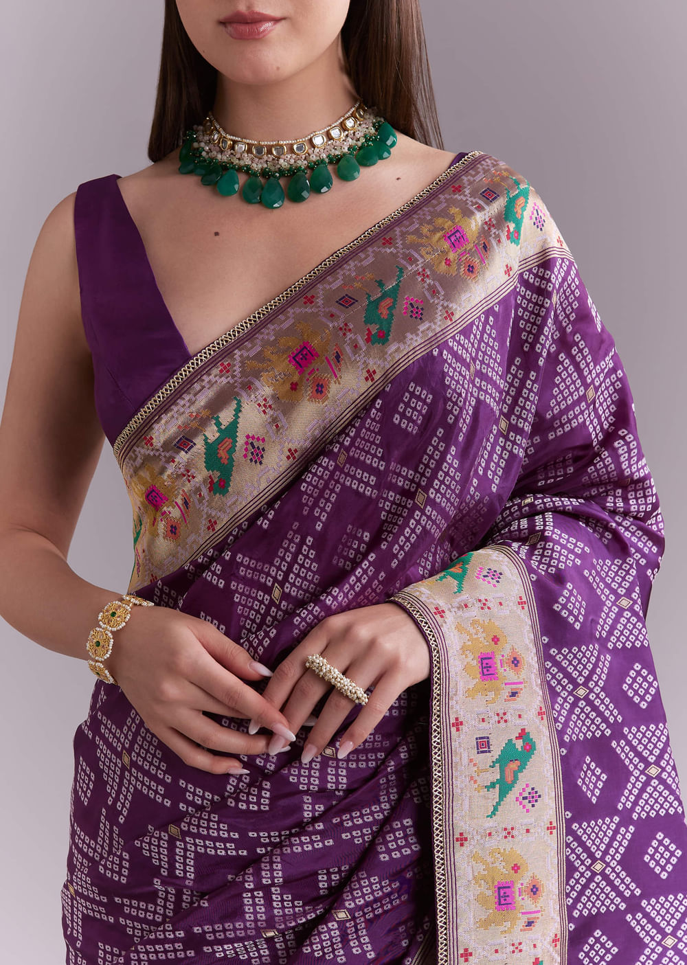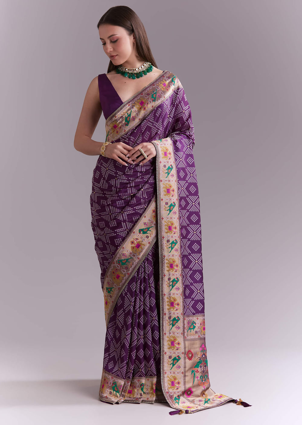 Purple Silk Saree With Zari Border And Multicolour Motifs