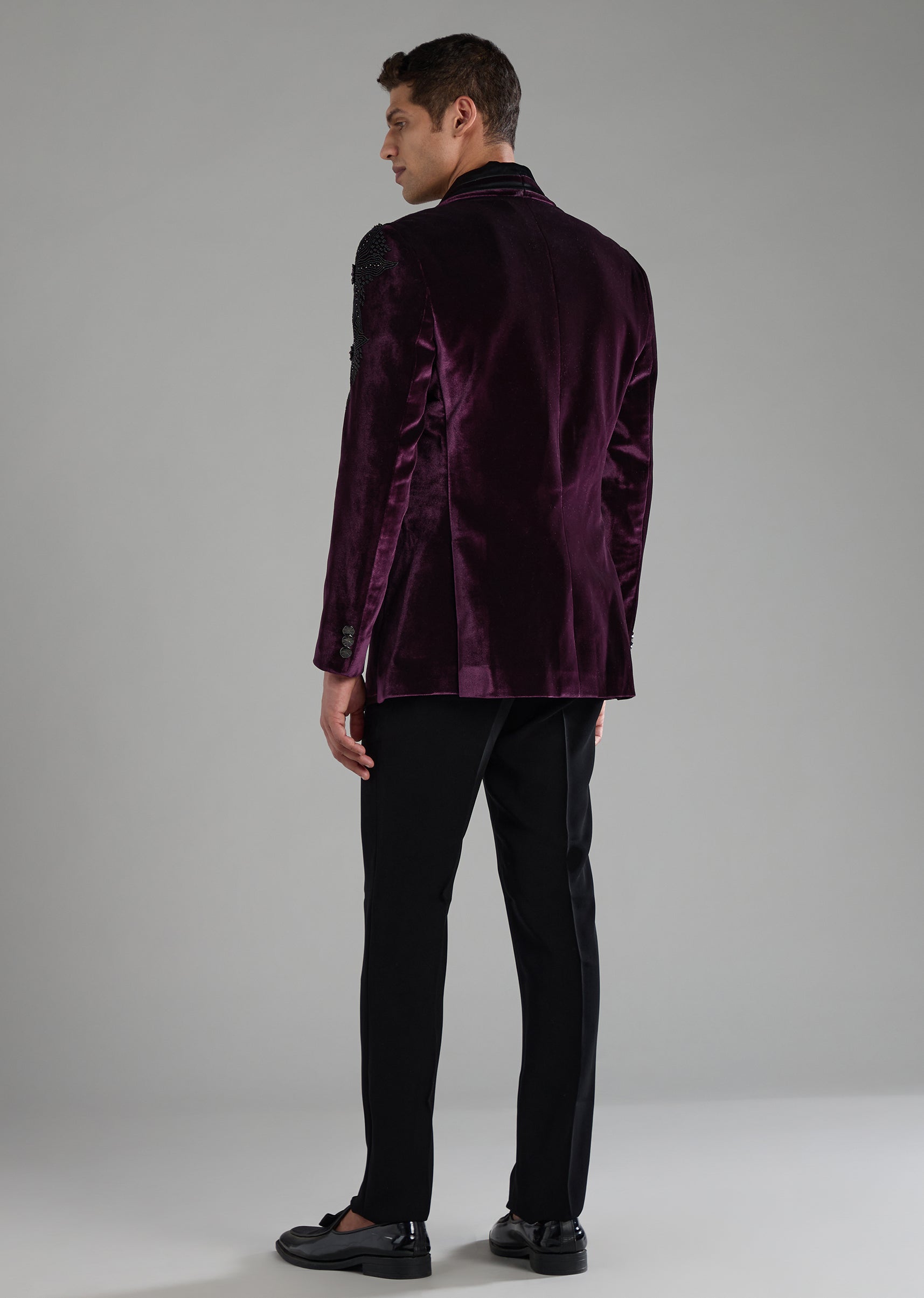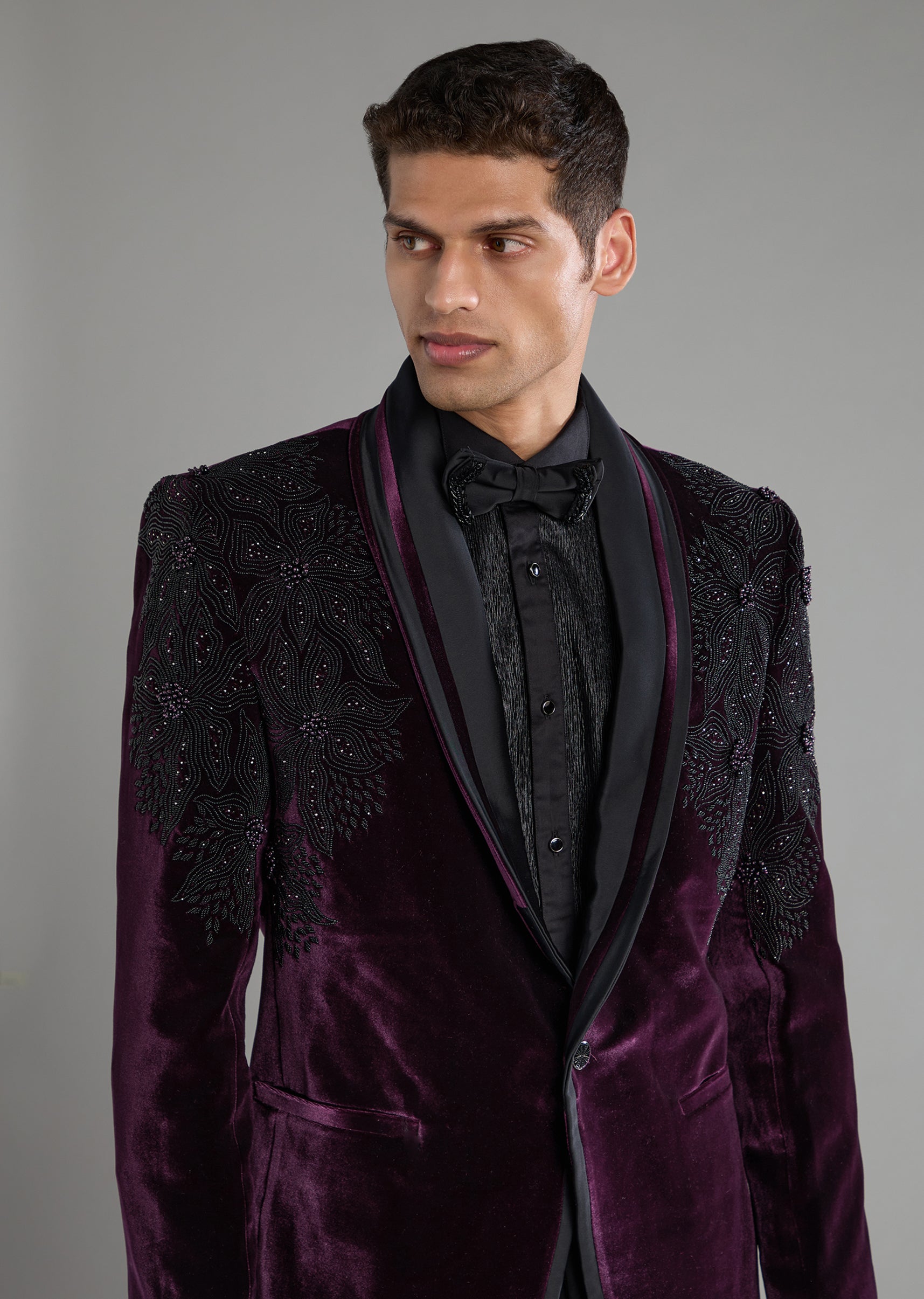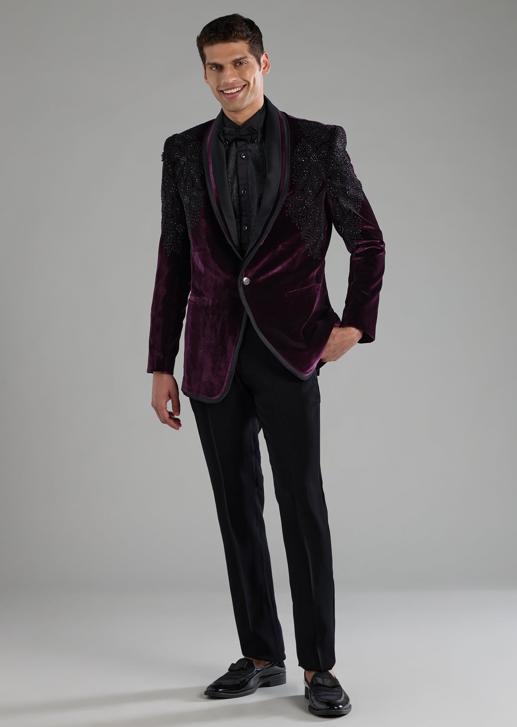 Purple Velvet Stone Embellished Tuxedo Set with Bow Tie