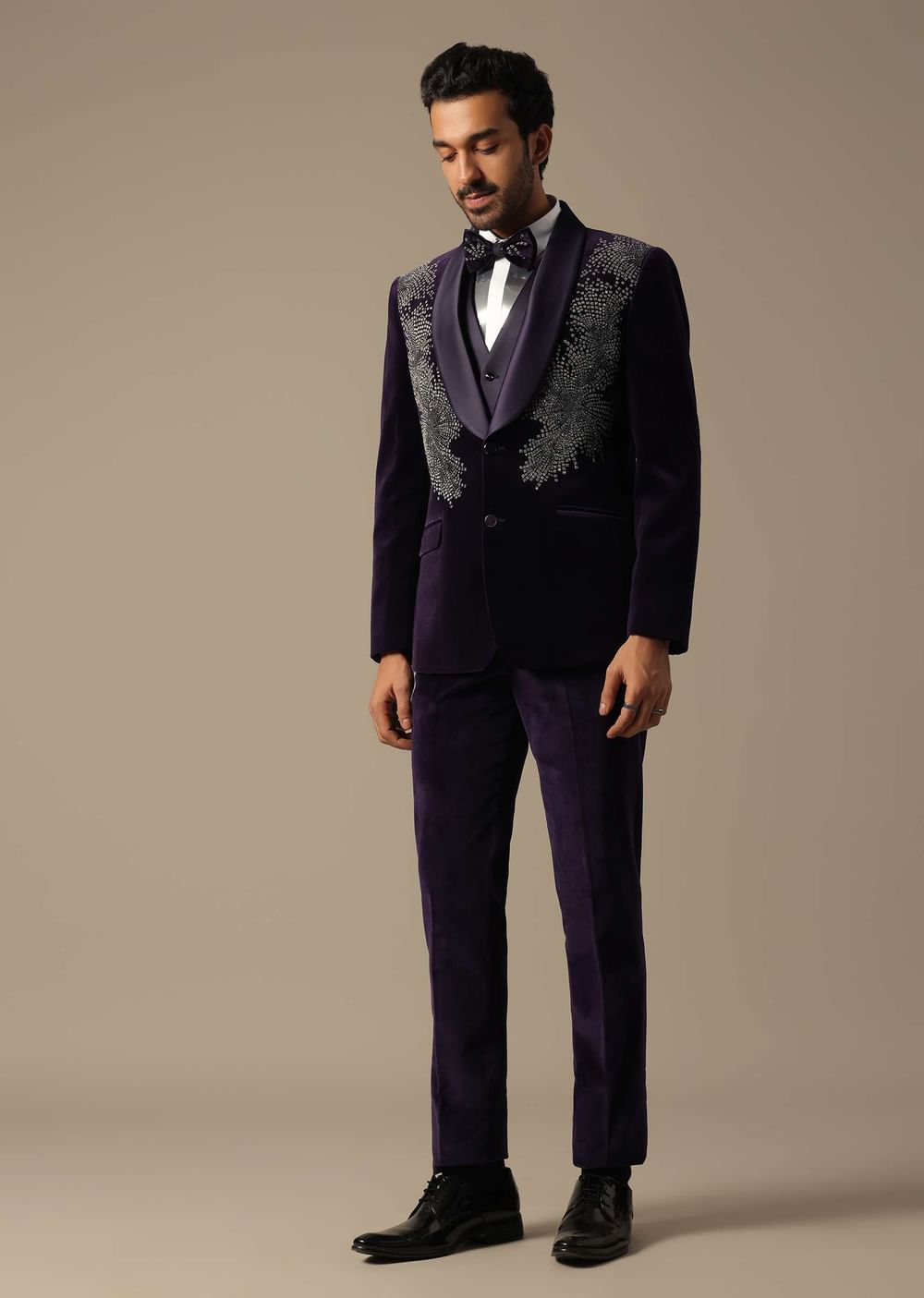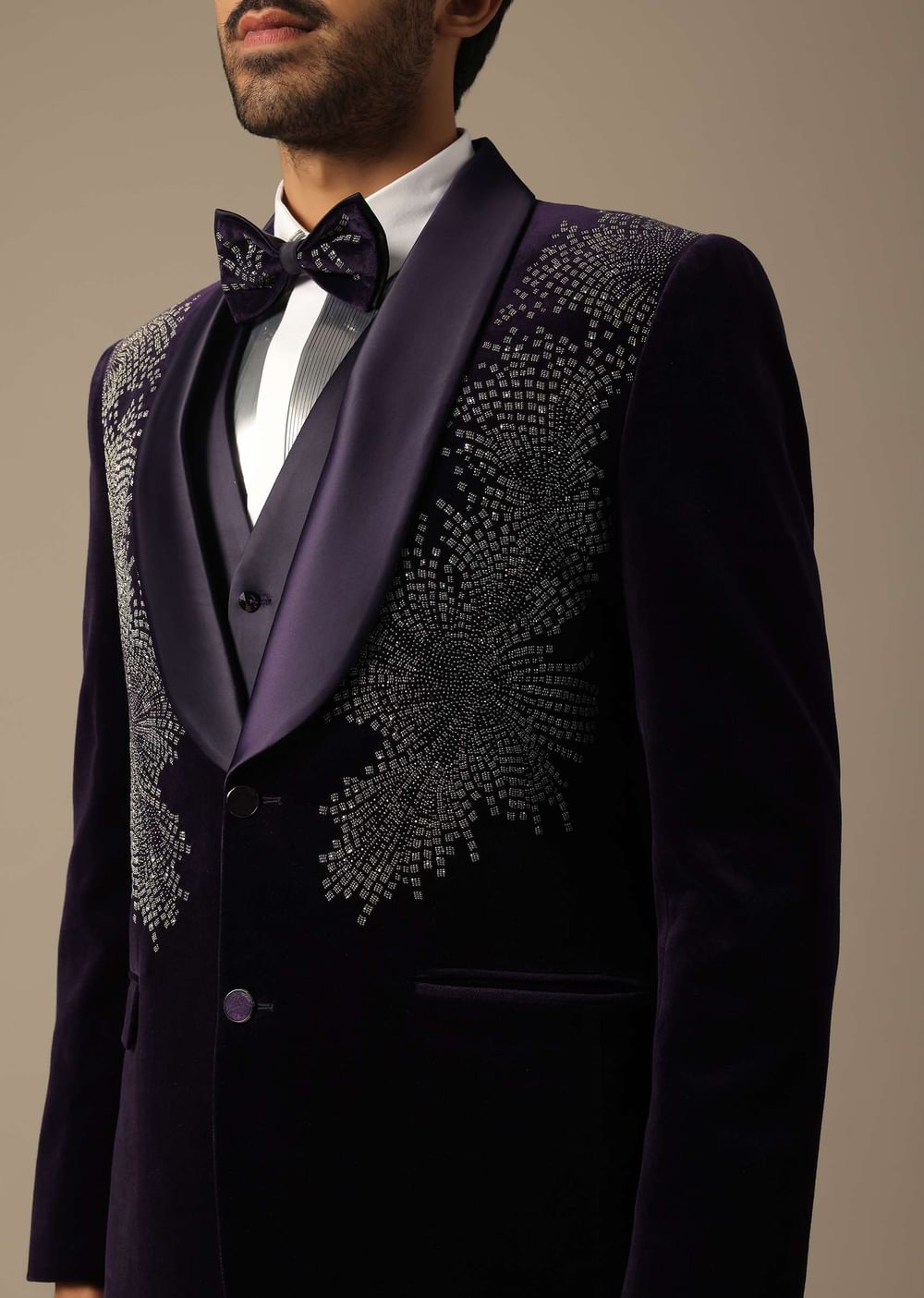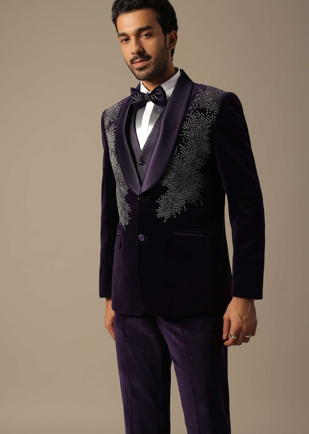 Unveil opulence in our Bridal Velvet Tuxedo. It is adorned with intricate stone embroidery in the front and crystal handwork on the blazer. The rich purple hue, complemented by wine accents, creates a regal ensemble for reception or cocktail party. This ensemble comprises a blazer, waistcoat, shirt, trouser, and a bowtie. Awarded as the Most Trusted Brand, we're delivering styles you love, just as promised.