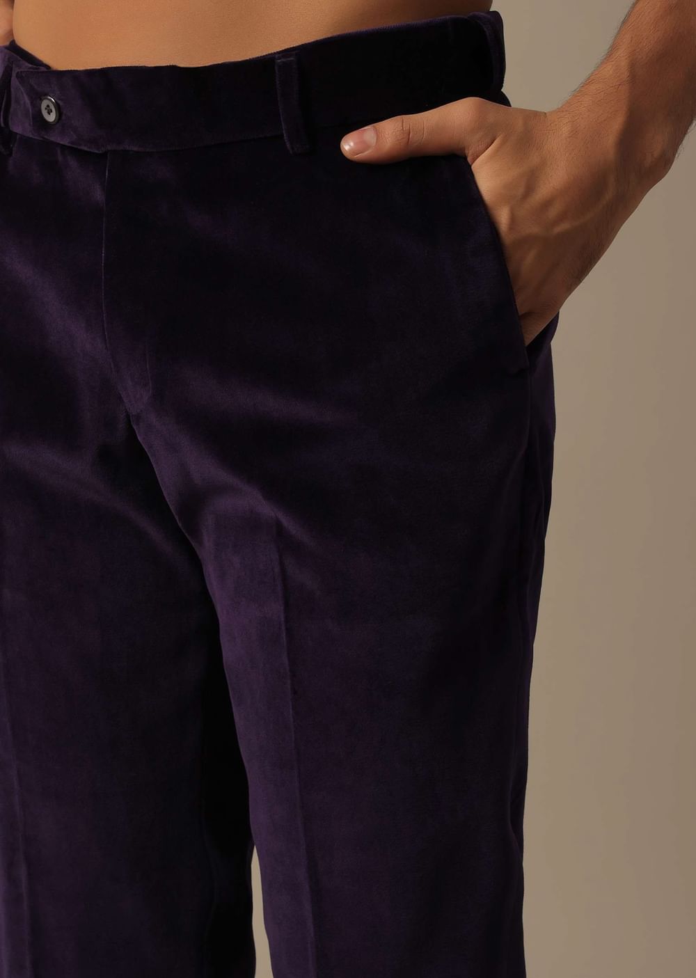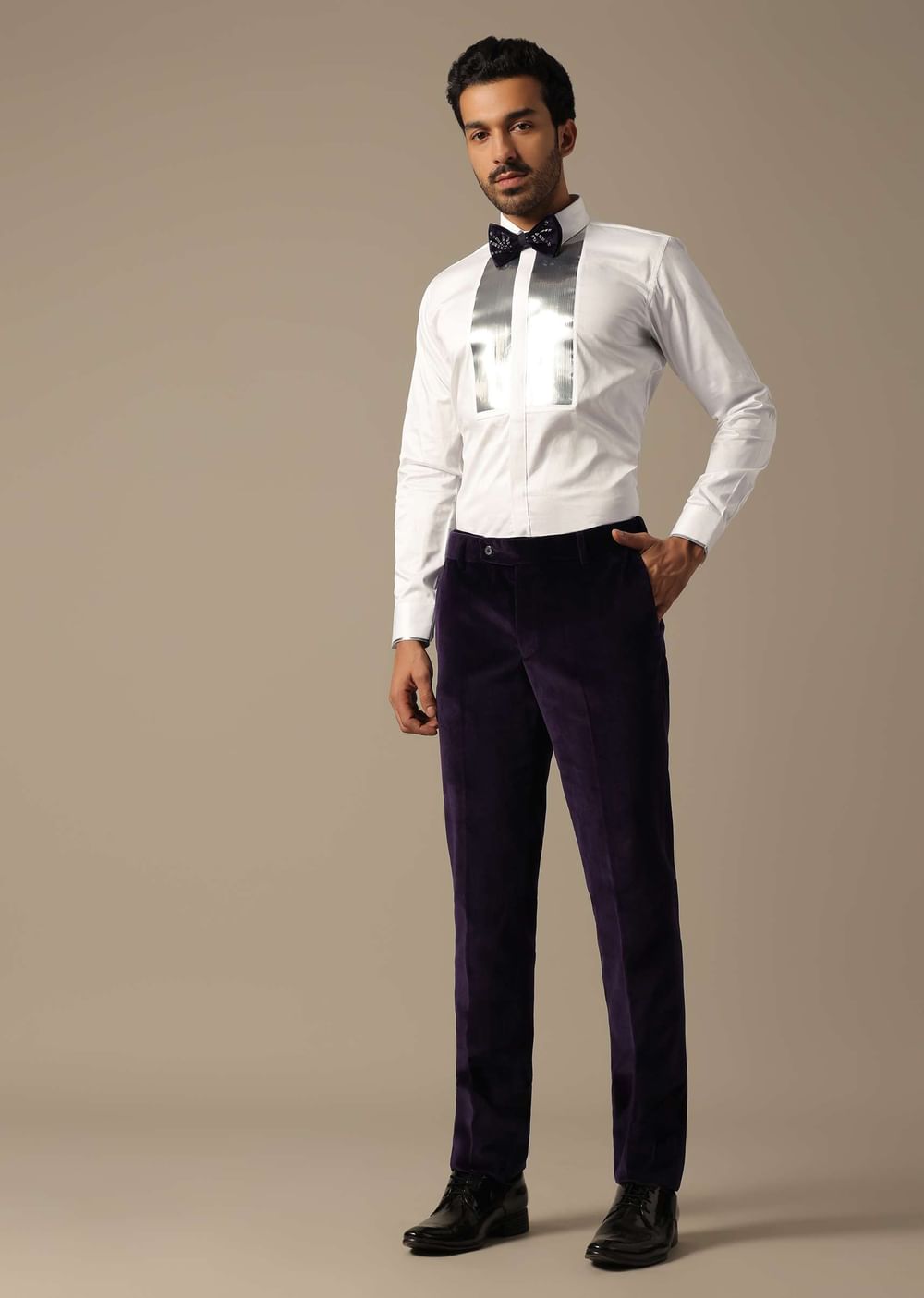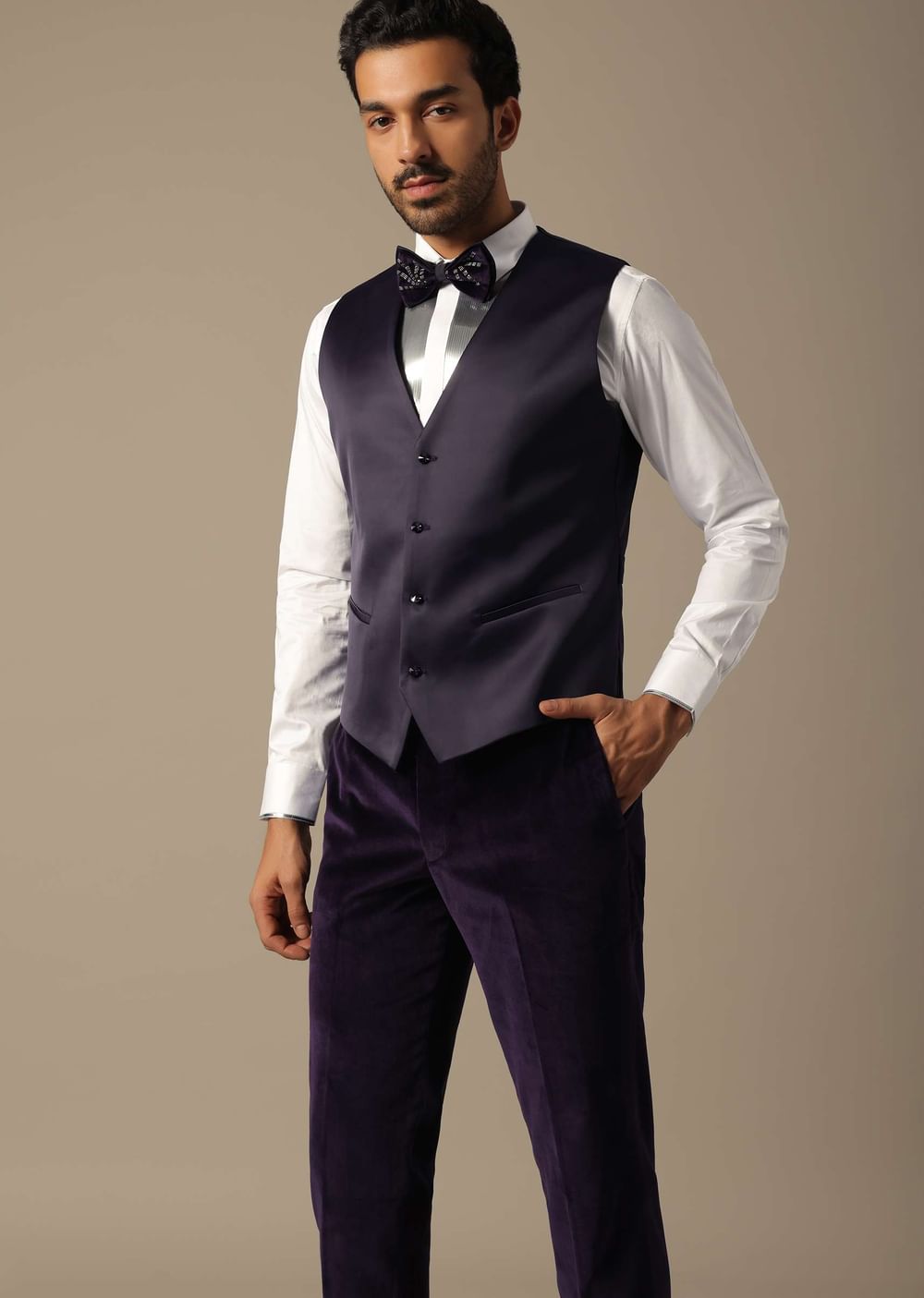 Unveil opulence in our Bridal Velvet Tuxedo. It is adorned with intricate stone embroidery in the front and crystal handwork on the blazer. The rich purple hue, complemented by wine accents, creates a regal ensemble for reception or cocktail party. This ensemble comprises a blazer, waistcoat, shirt, trouser, and a bowtie. Awarded as the Most Trusted Brand, we're delivering styles you love, just as promised.