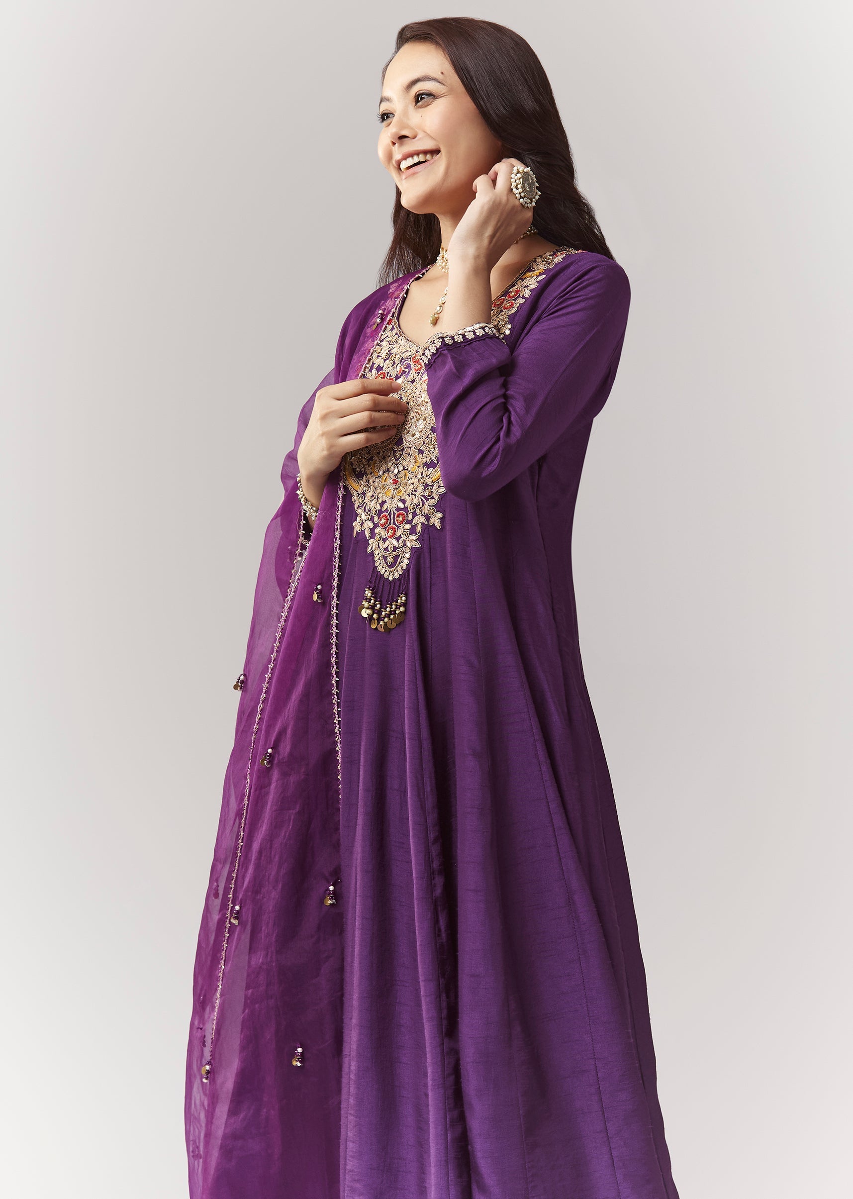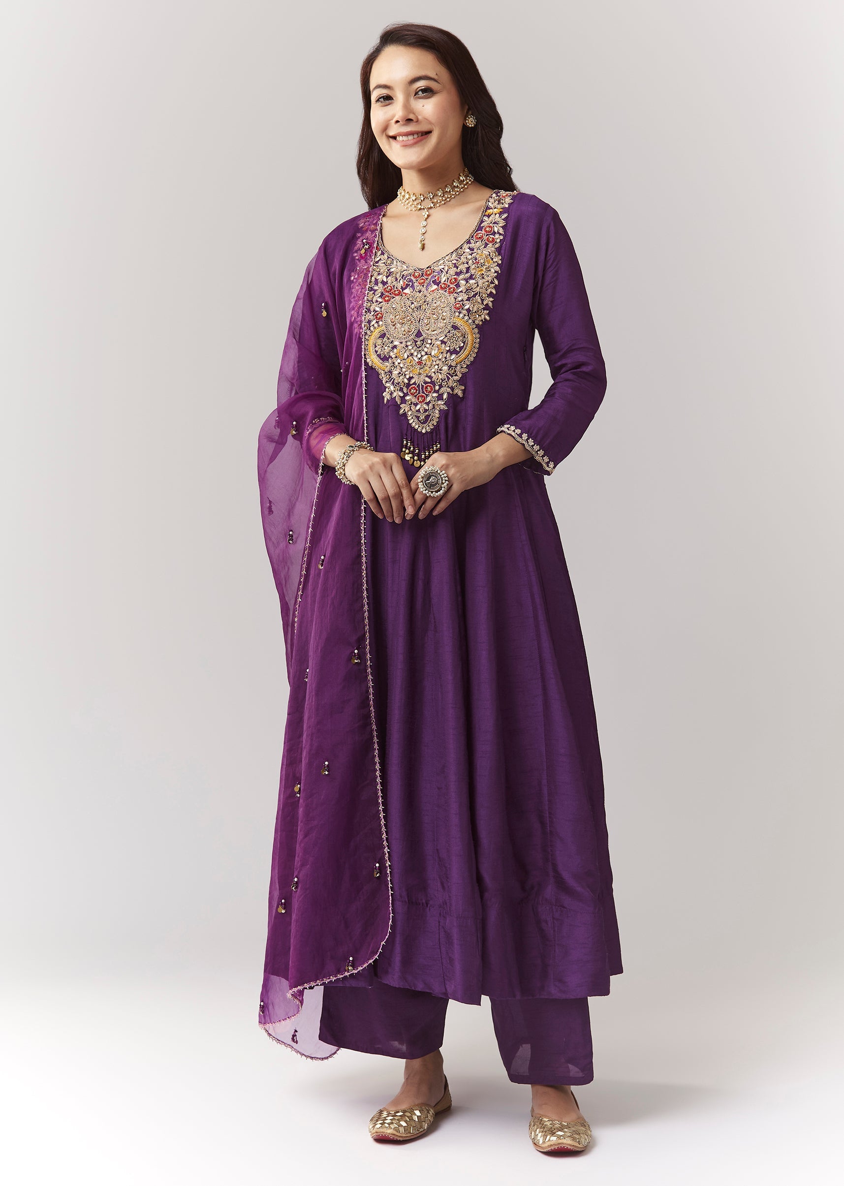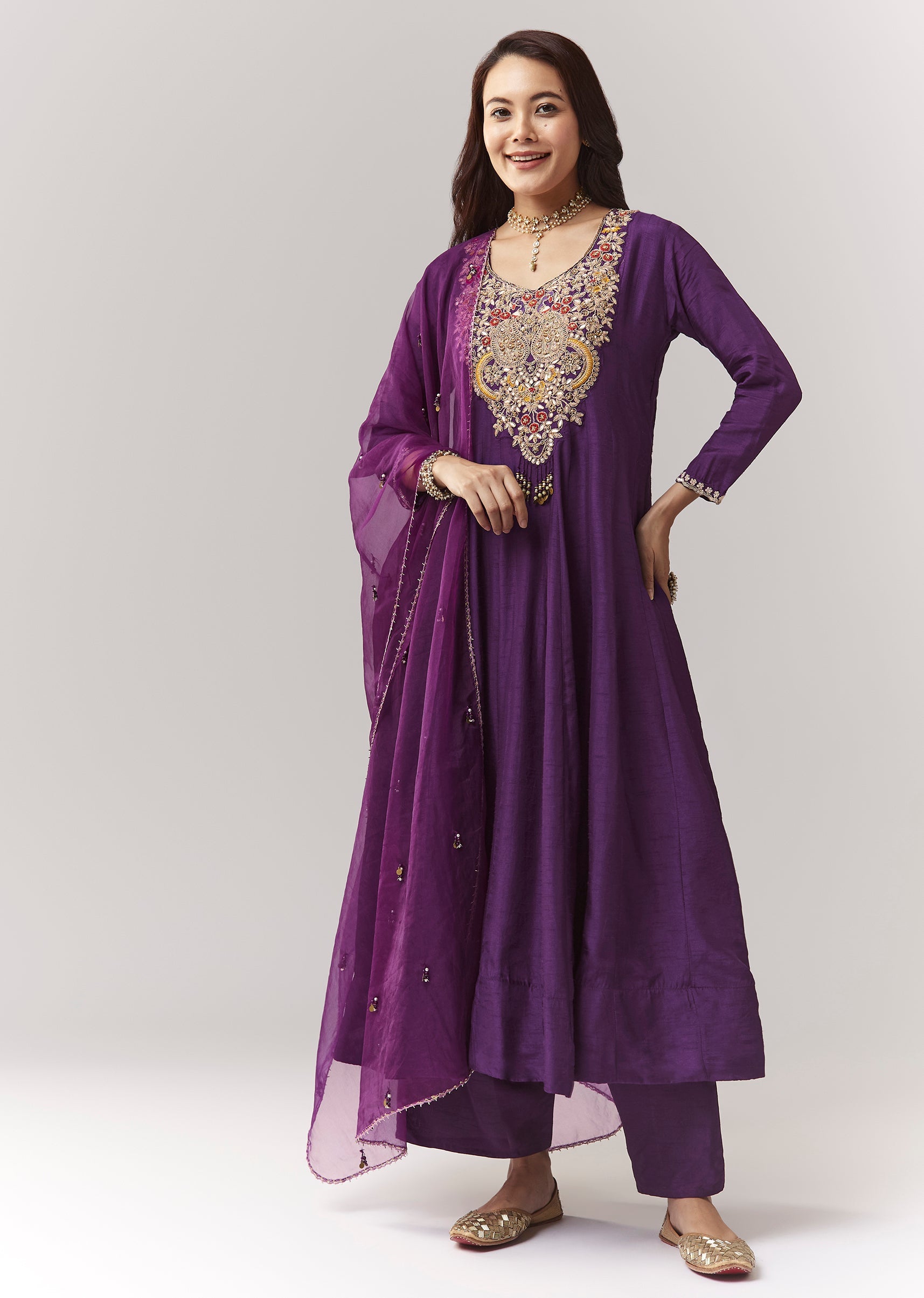 A minimal festive purple anarkali in silk (dola silk), featuring zardosi work and a v-neck neckline. Comes with straight pants (elasticated waist) and an organza dupatta—easy festive dressing for pooja... More Product Details
