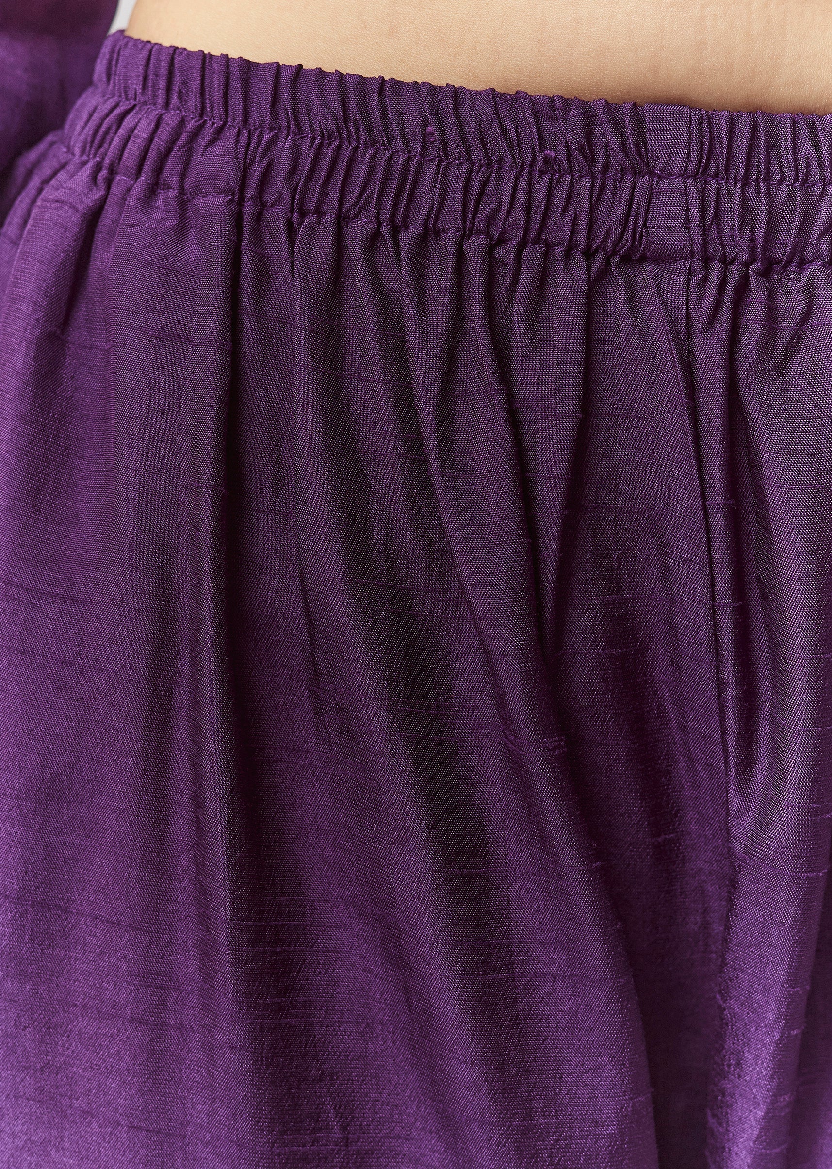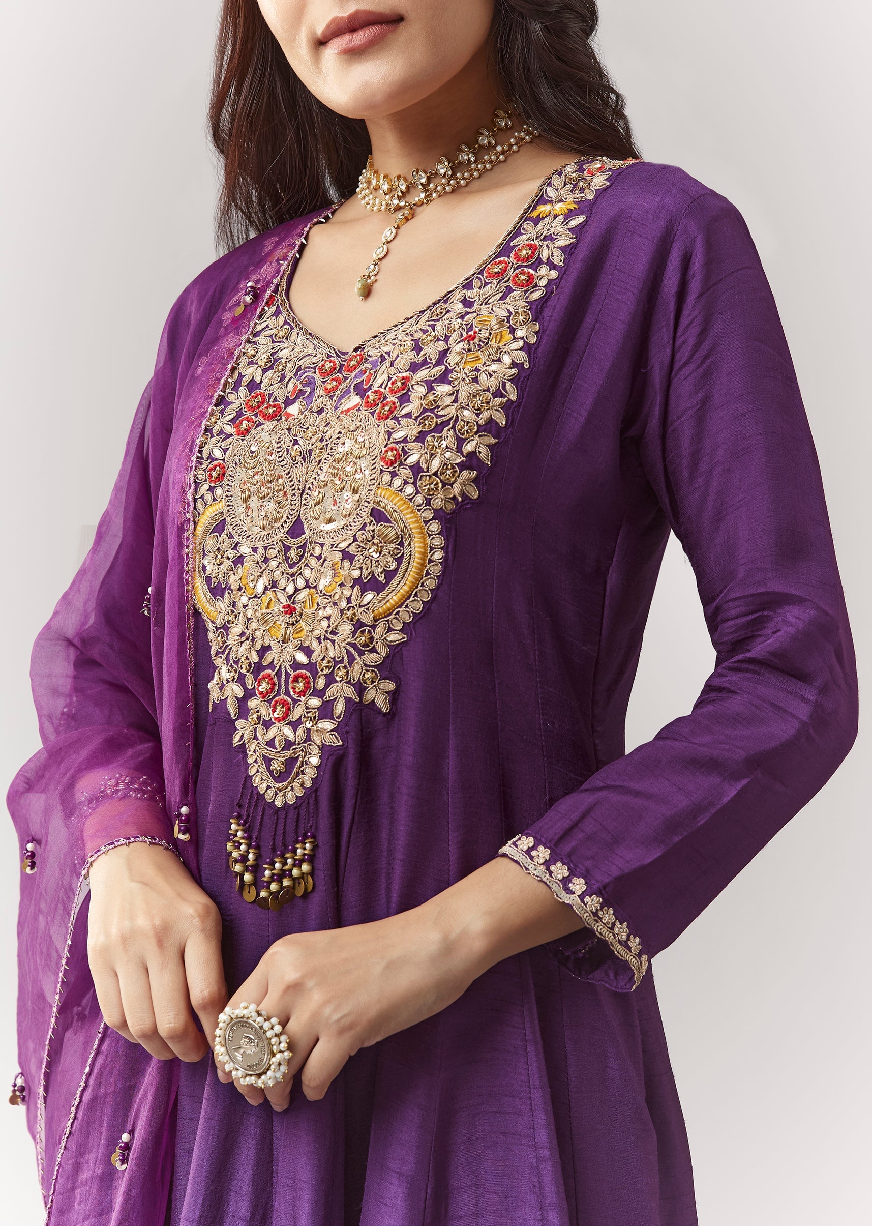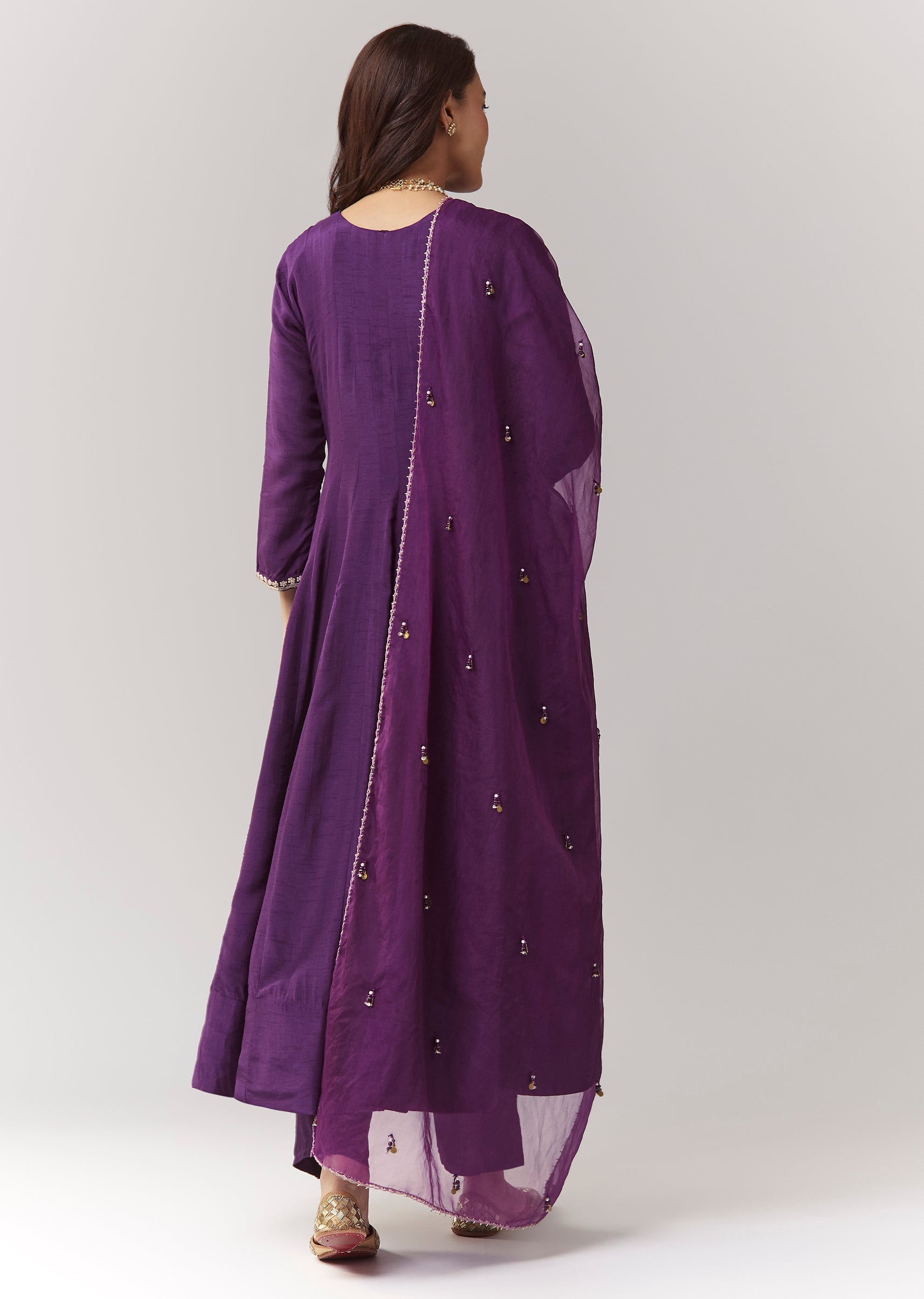 A minimal festive purple anarkali in silk (dola silk), featuring zardosi work and a v-neck neckline. Comes with straight pants (elasticated waist) and an organza dupatta—easy festive dressing for pooja... More Product Details