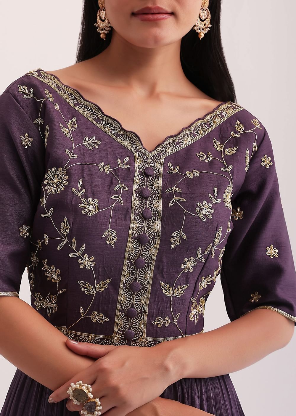 Experience the ultimate epitome with our purple anarkali . This piece of art is made from silk fabric, and it has detailed zari work and moti embroidery. The anarkali is... More Product Details