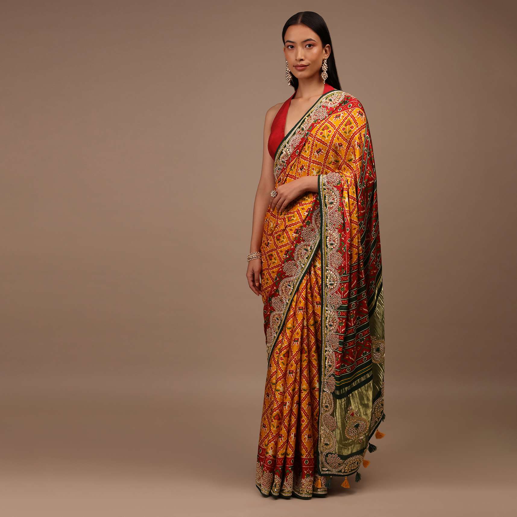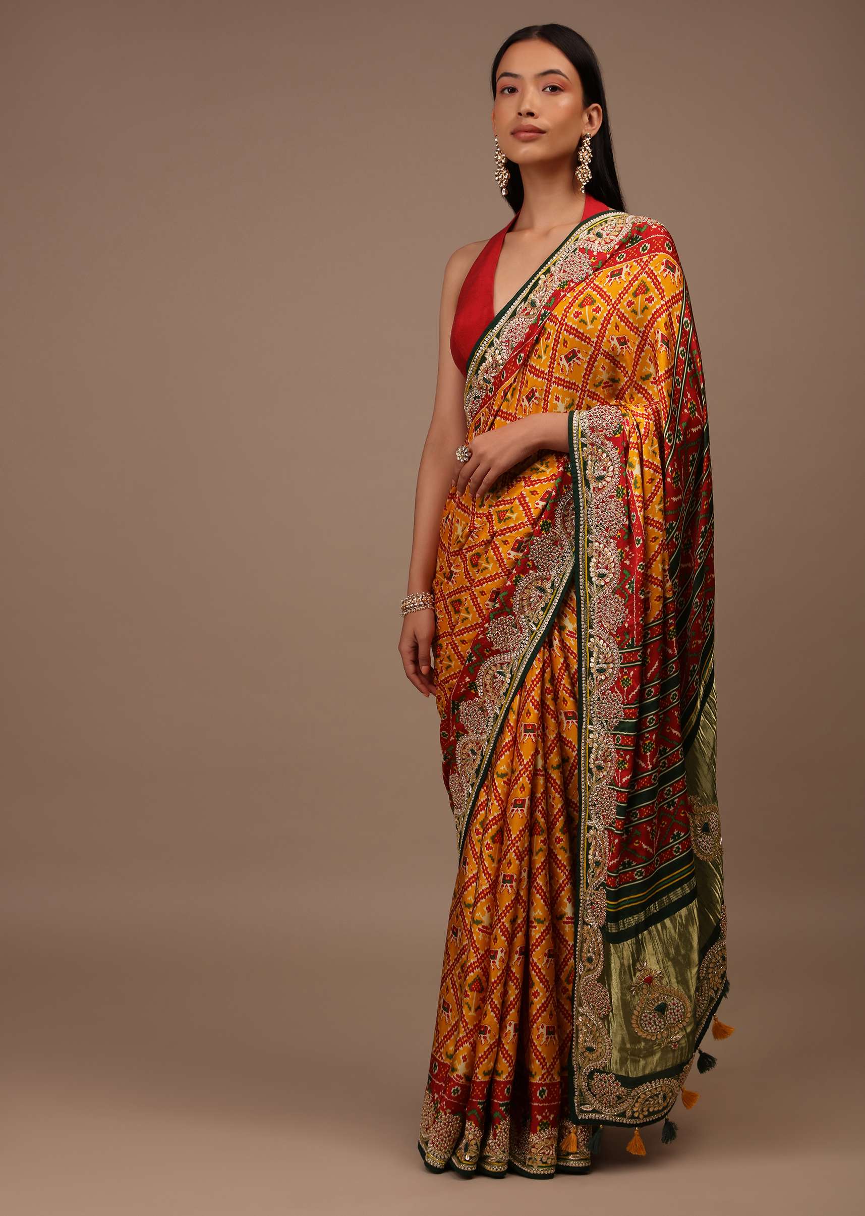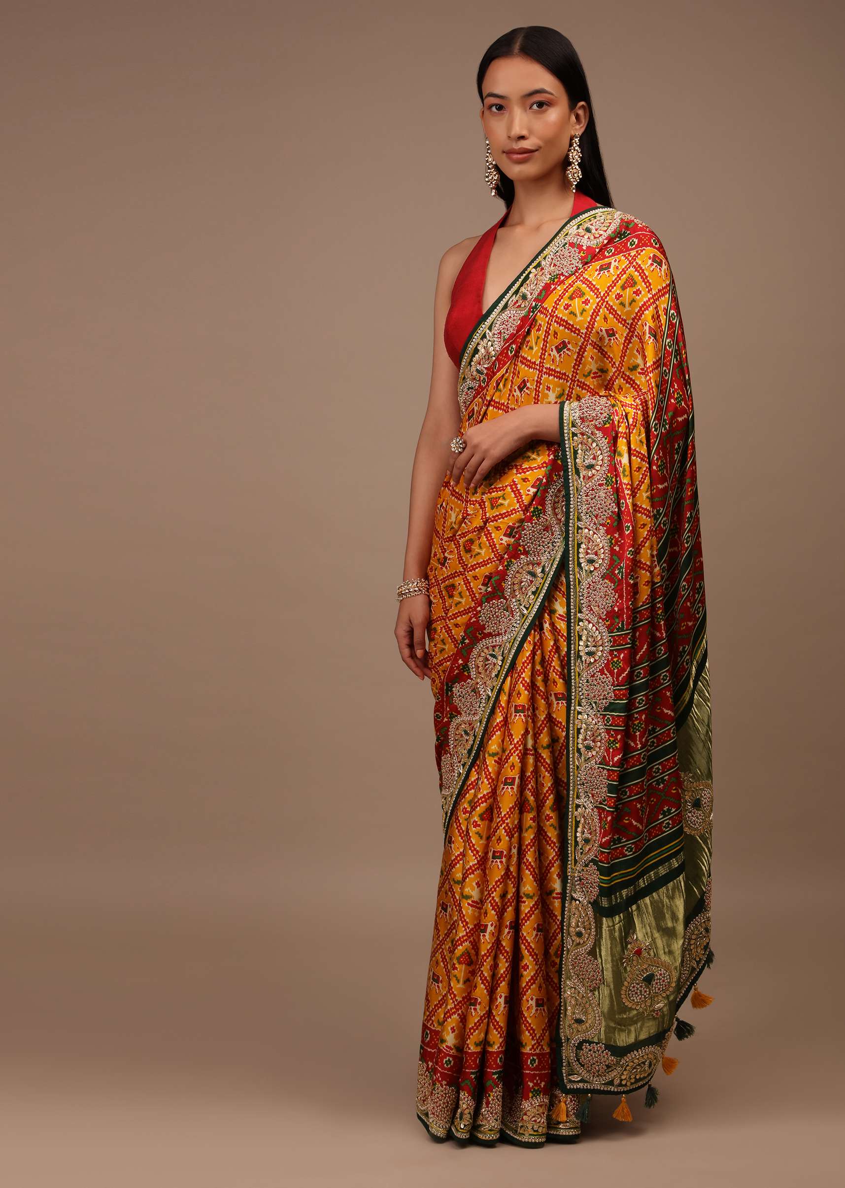 Radiant yellow saree in satin with multi colored patola print all over. The saree has a contrasting deep red and dark green border with gotta patti, moti, french knots and zardosi work. The pallu is enhanced with brocade weave and tassels. Paired with a dark green unstitched blouse in satin with printed buttis. Awarded As The Most Trusted Brand We'Re Delivering Styles You Love Just As Promised.