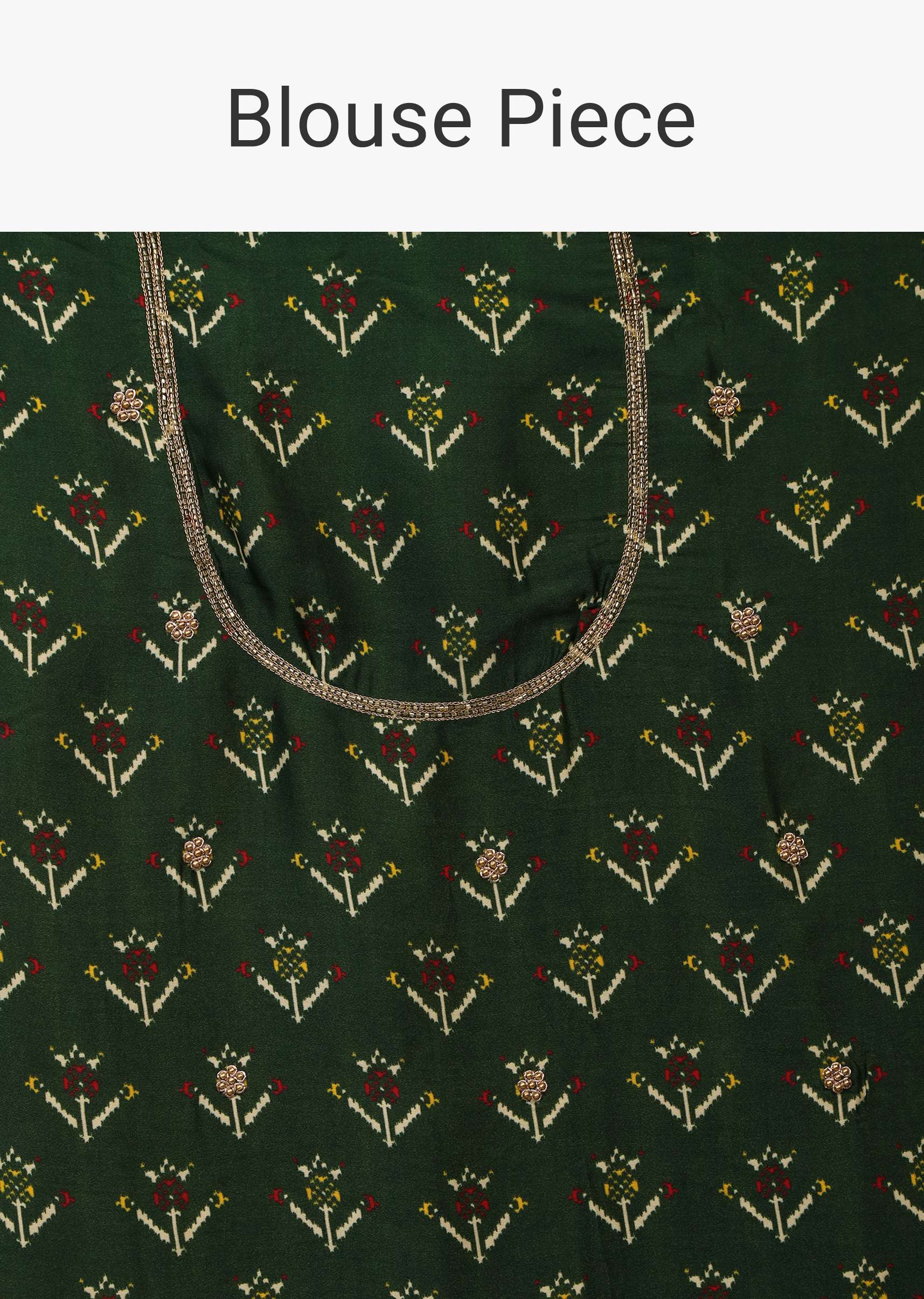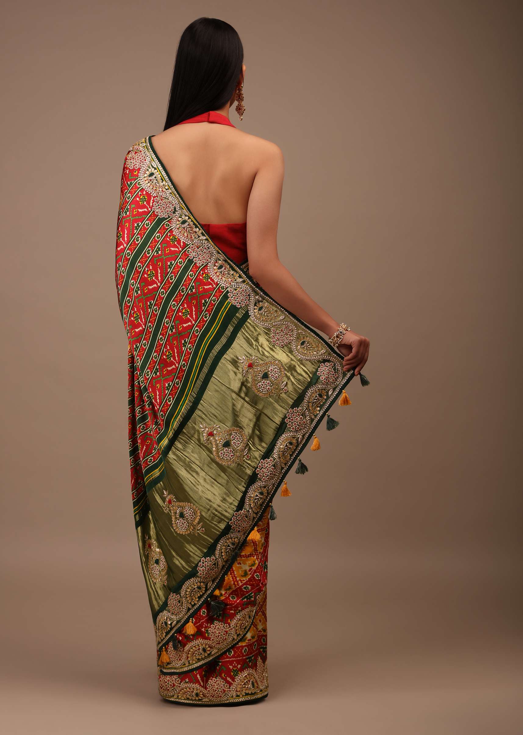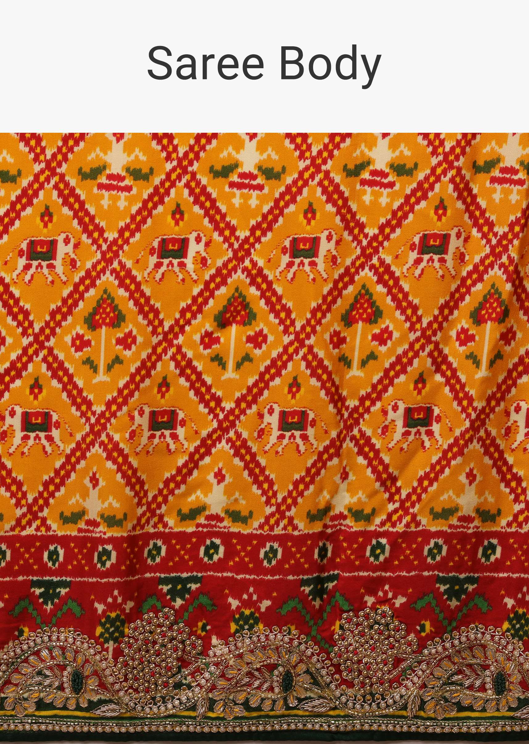 Radiant yellow saree in satin with multi colored patola print all over. The saree has a contrasting deep red and dark green border with gotta patti, moti, french knots and zardosi work. The pallu is enhanced with brocade weave and tassels. Paired with a dark green unstitched blouse in satin with printed buttis. Awarded As The Most Trusted Brand We'Re Delivering Styles You Love Just As Promised.