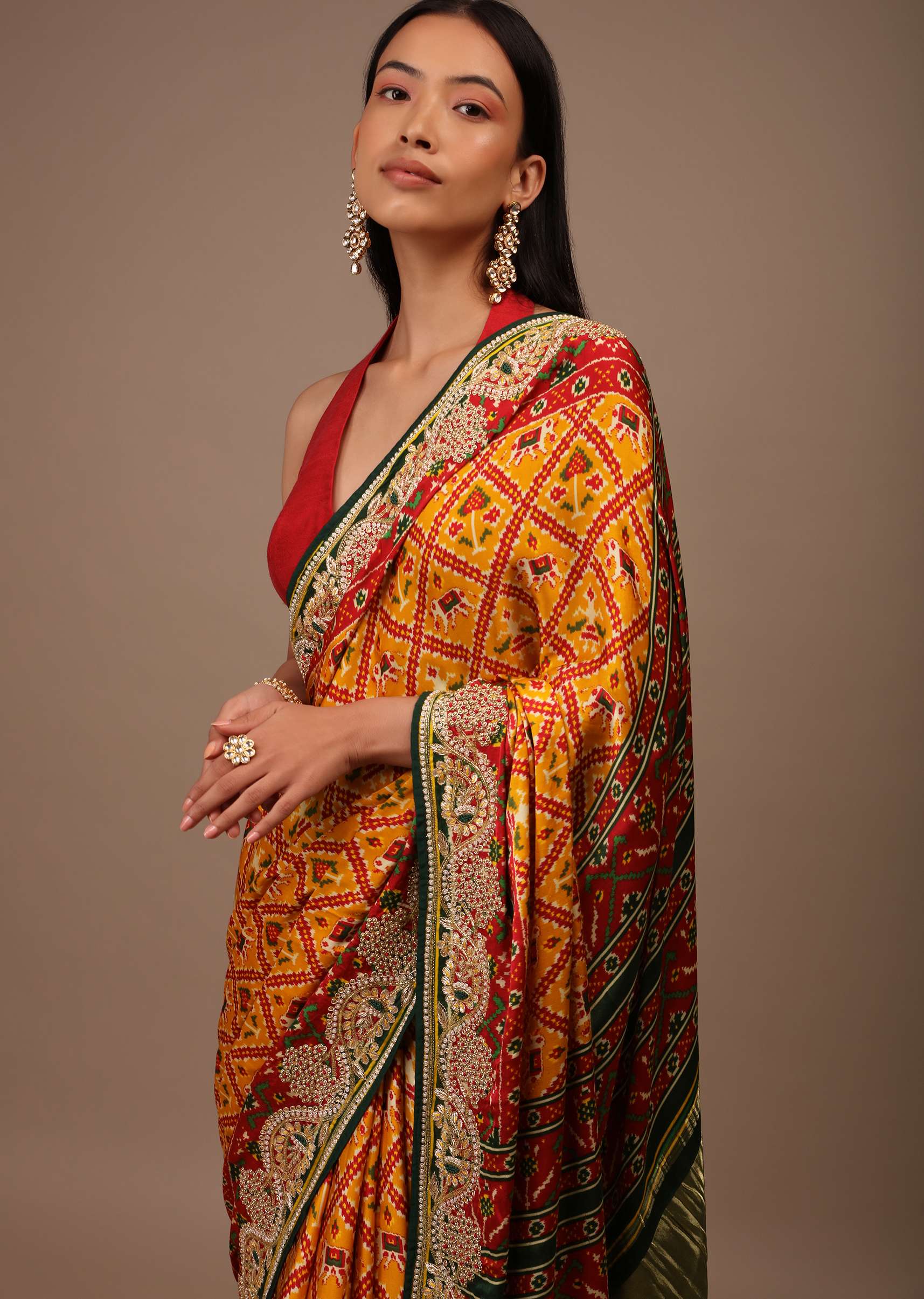 Radiant Yellow Saree In Satin With Multi Colored Patola Print And Gotta Patti Embroidered Border