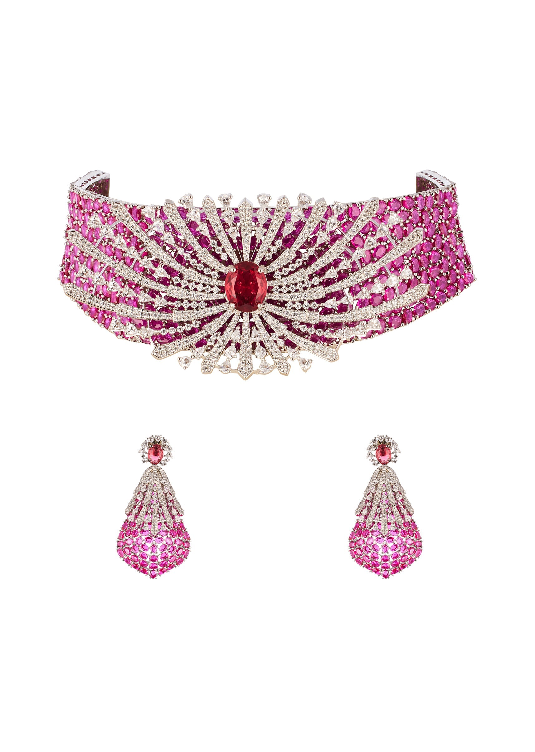 Vibrant and celebratory, this rani pink CZ diamond look necklace set adds a joyful pop of color with timeless elegance. The rhodium plated finish enhances the brilliance of the pink... More Product Details
