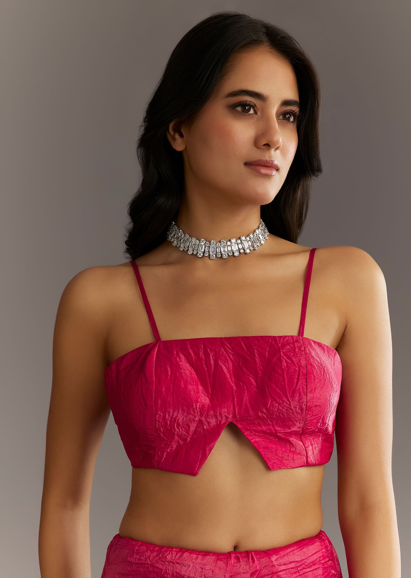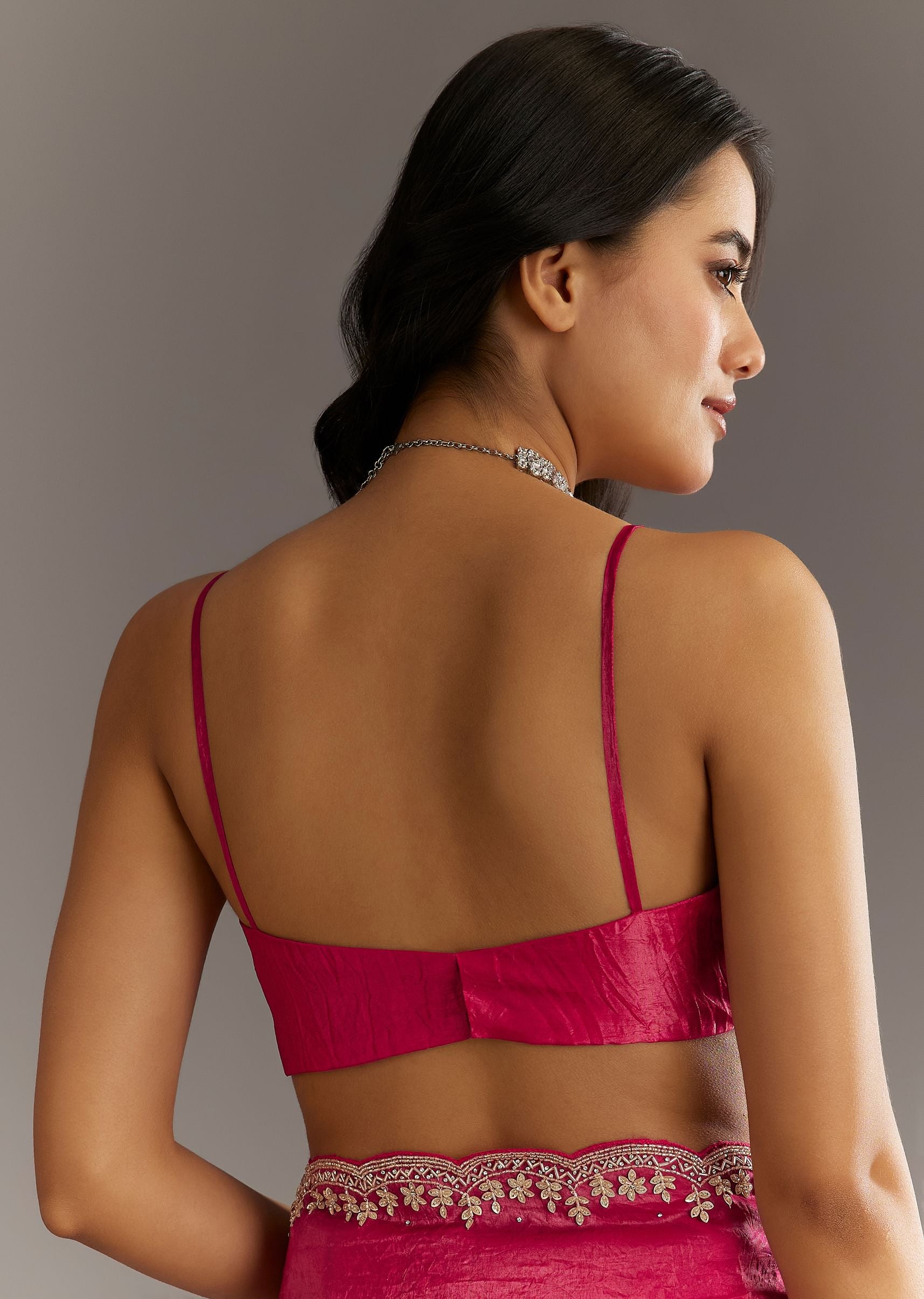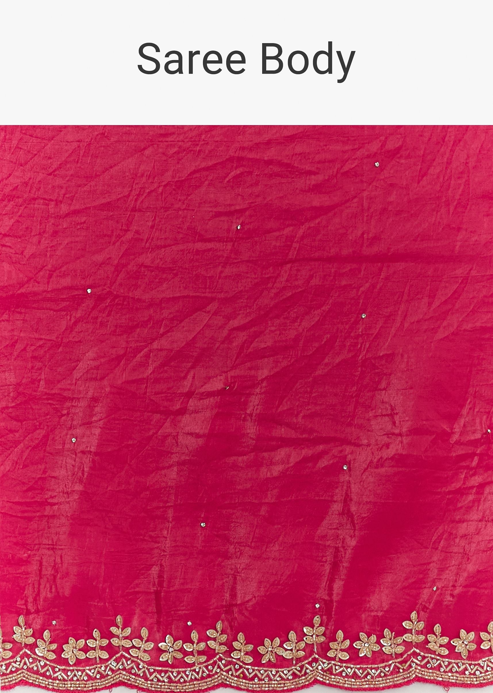 Rani Pink Crushed Tissue Saree With Stone Embellishments And Scallop Border