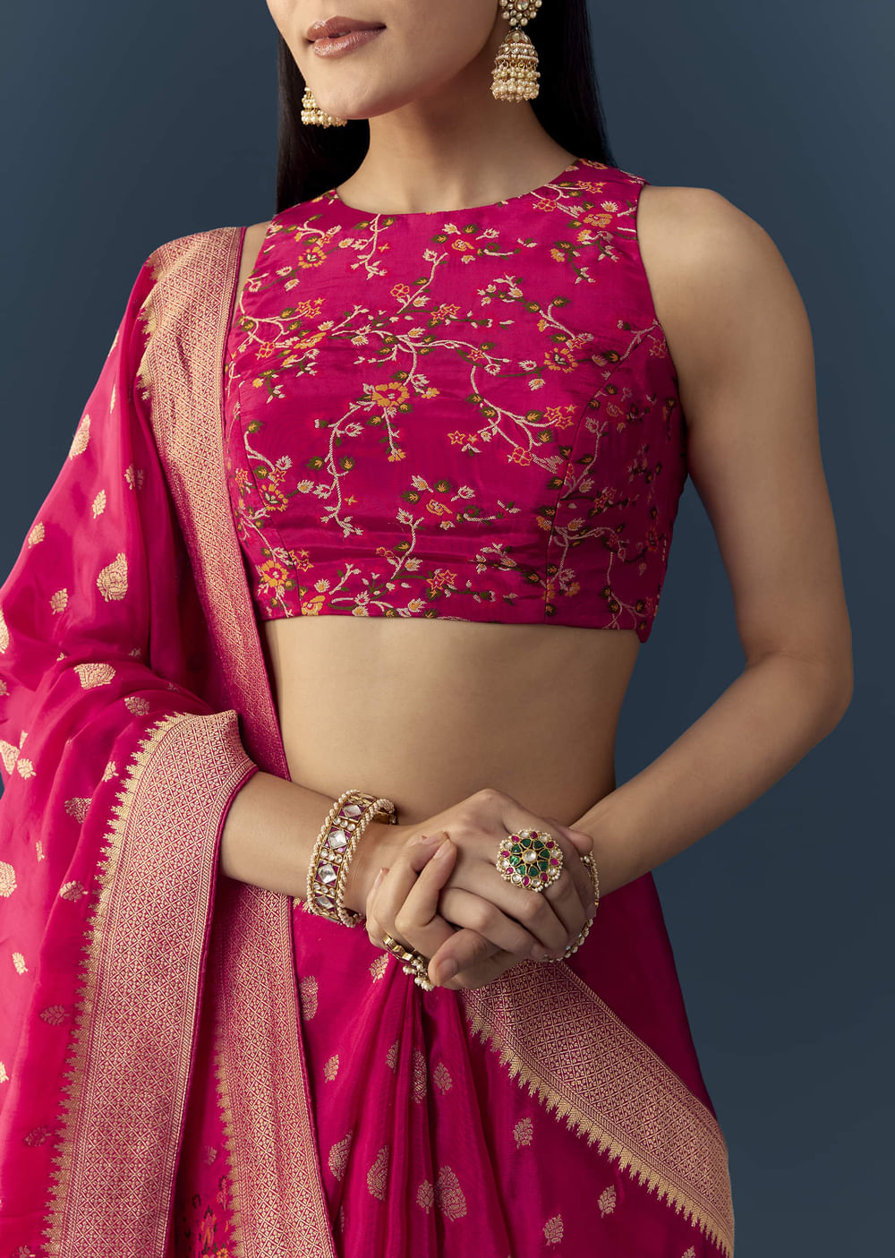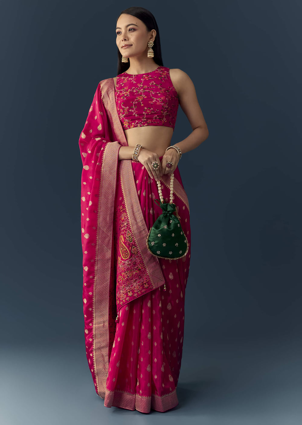 Fit Tips:Stitch the blouse for a well-fitted, structured look that enhances the saree’s rich drape and intricate details.