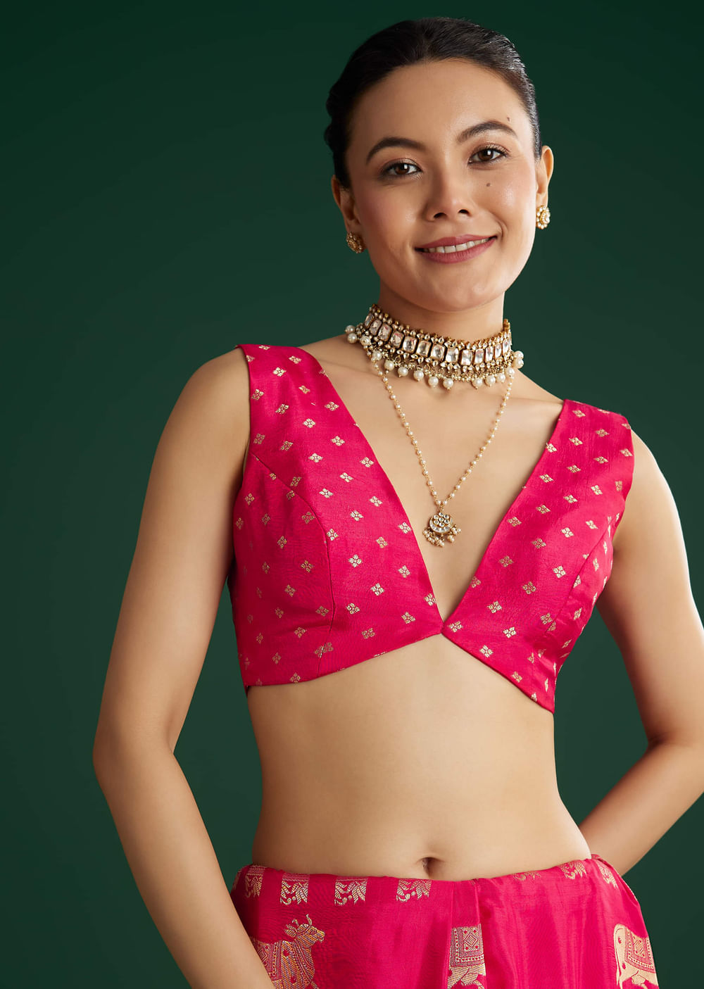 Pair this bold red saree and plunging blouse with a mirror choker necklace for a trendy fusion touch, or opt for a kundan collar set for a classic vibe.