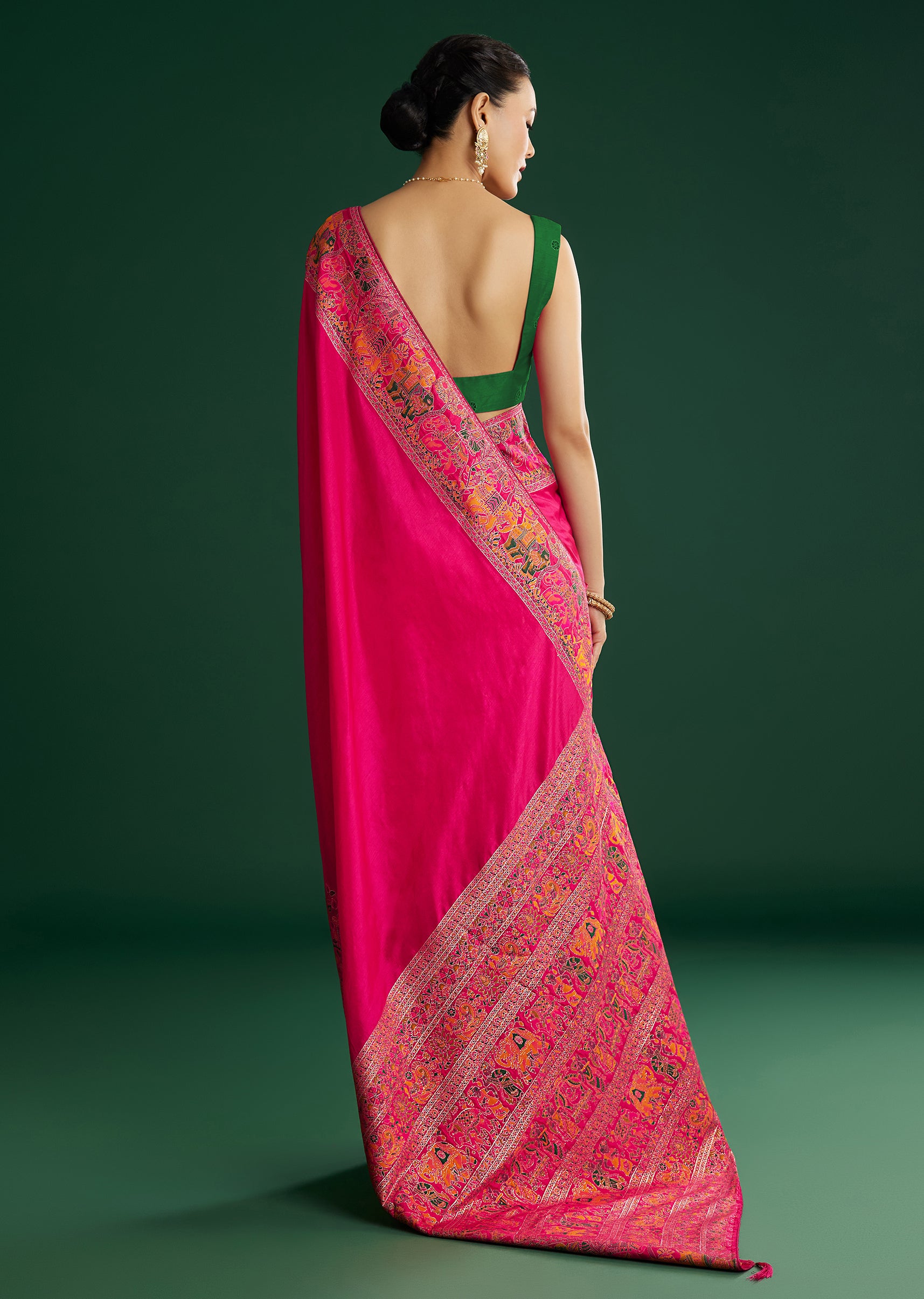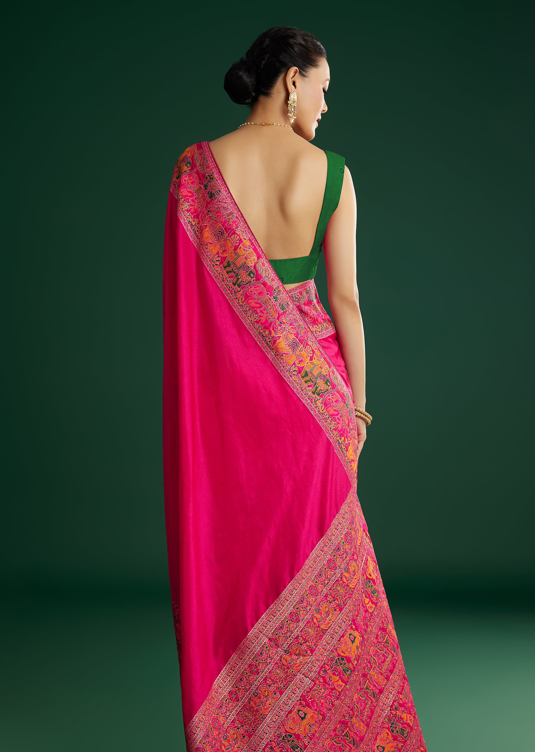 Rani Pink Dola Silk Woven Saree With Floral And Animal Prints