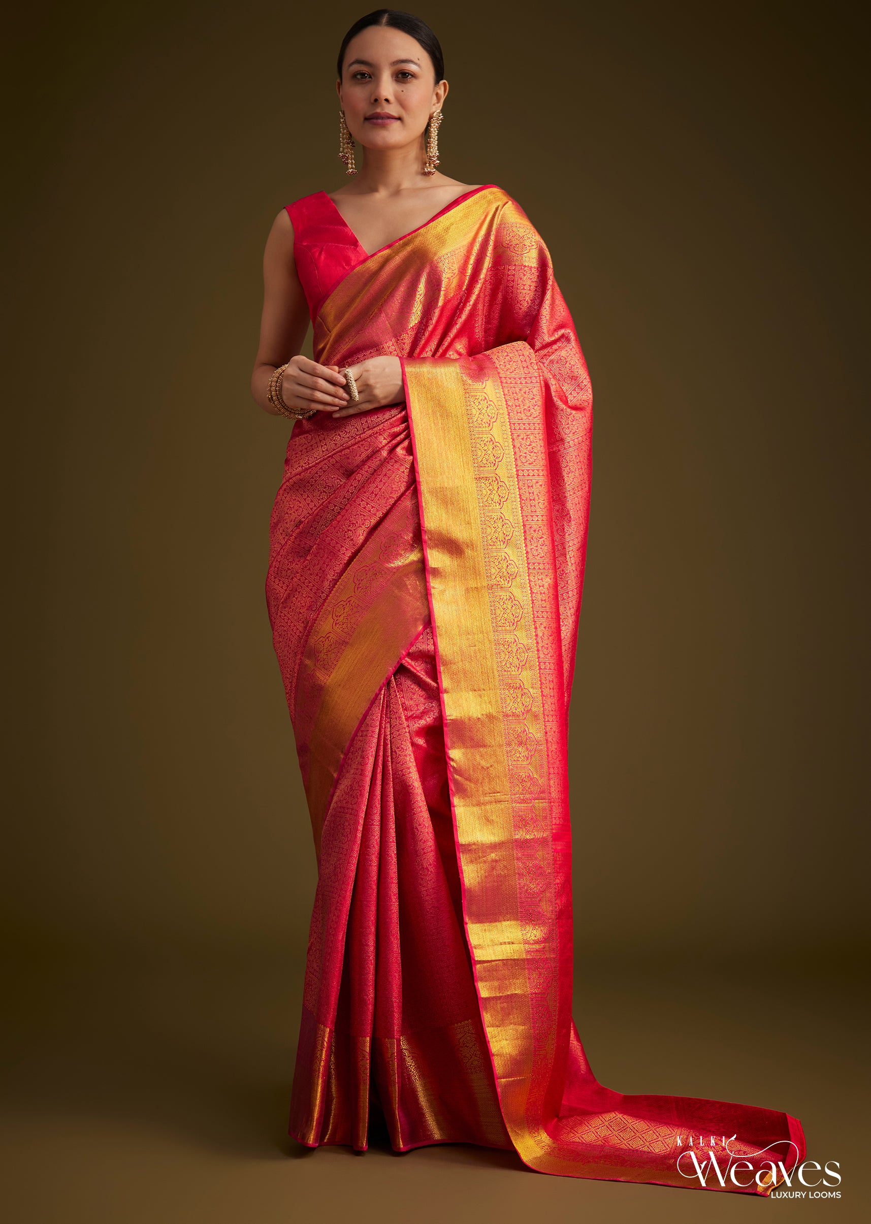Rani Pink Kanjivaram Silk Saree With Golden Zari Detailing