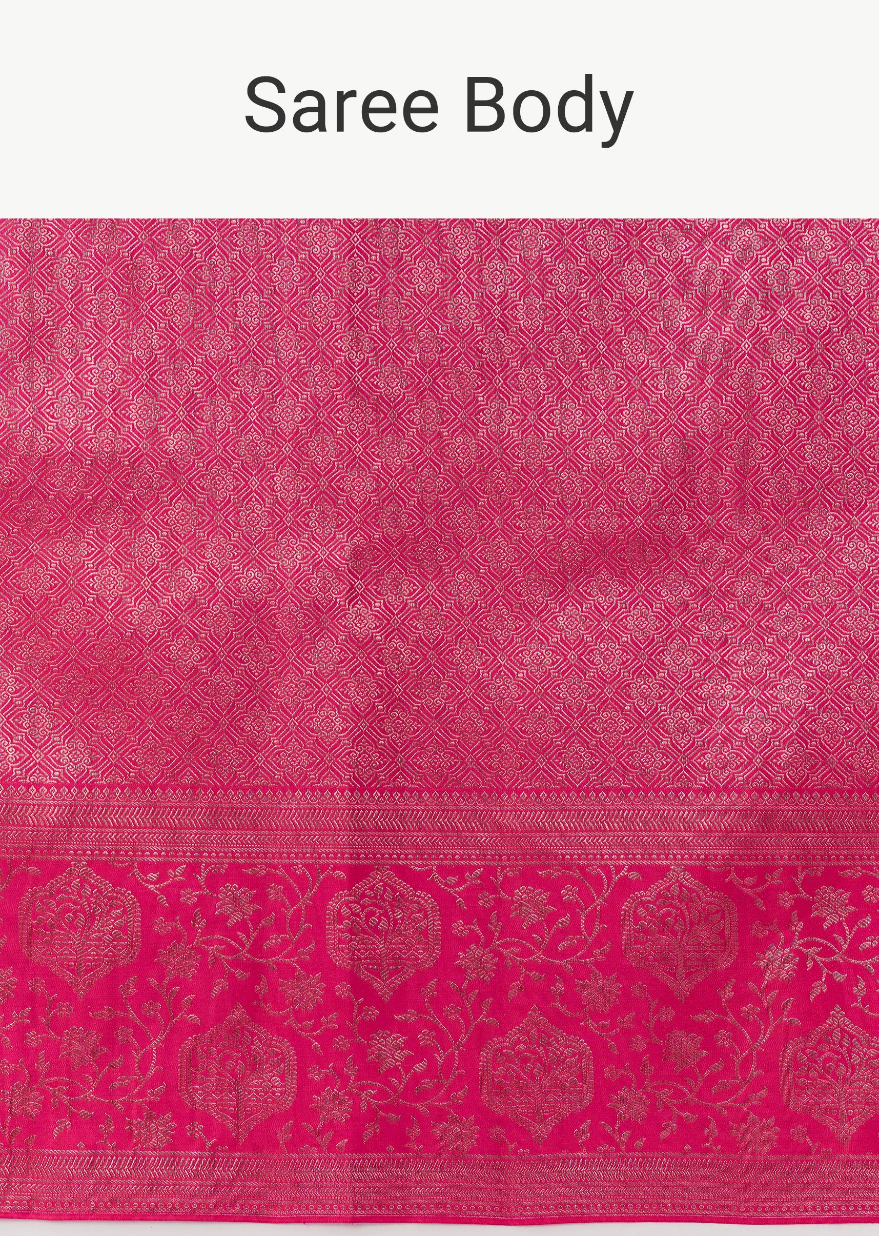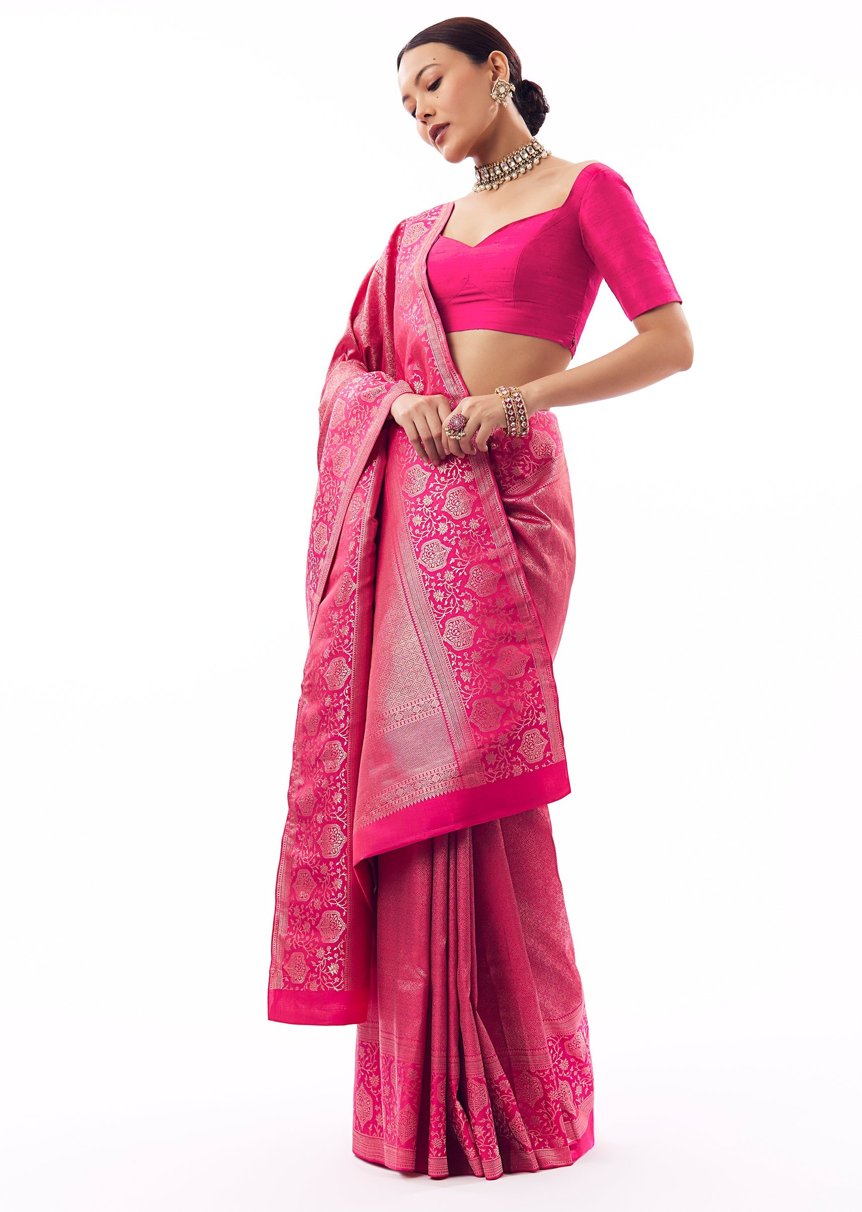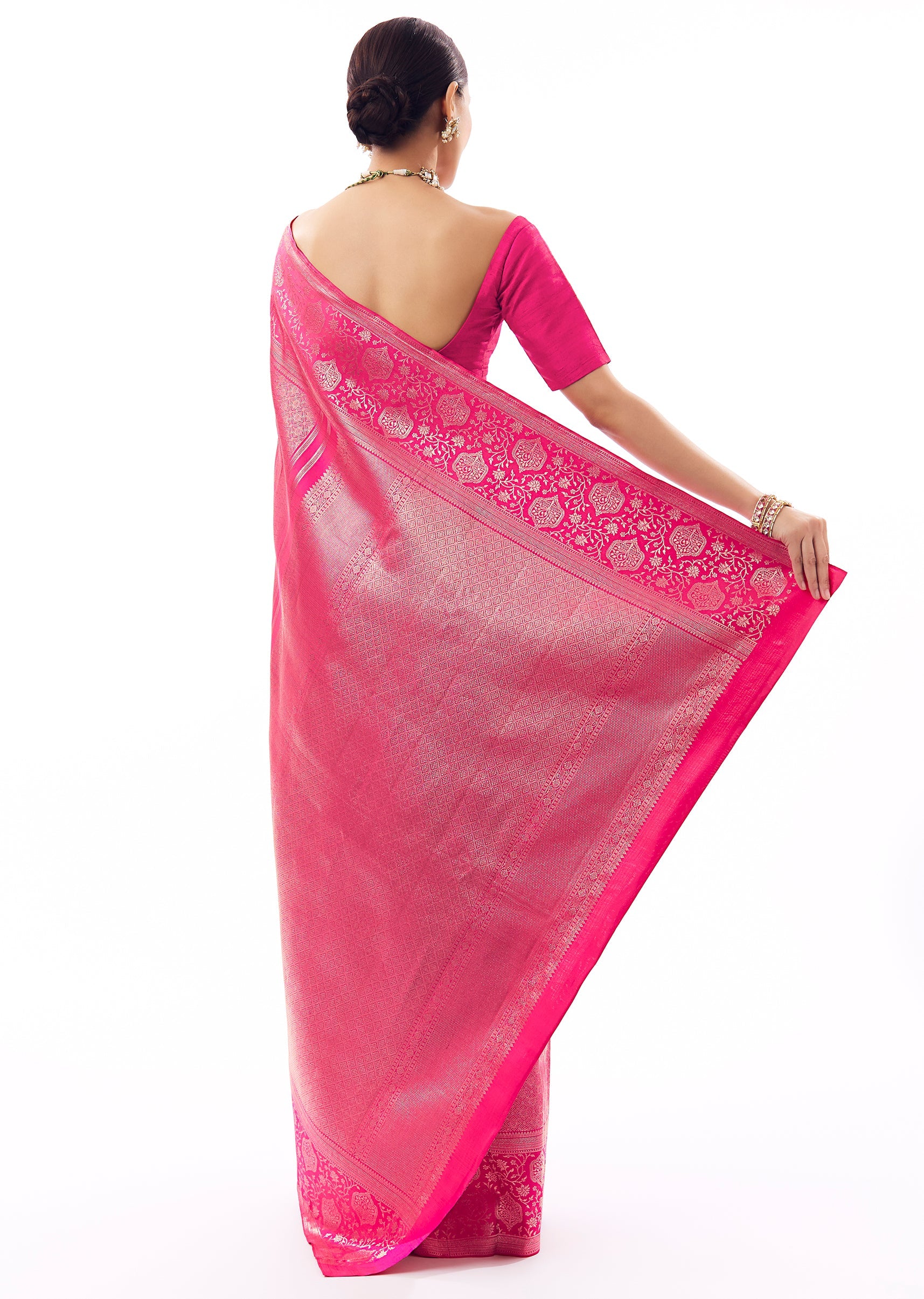 Bring out your festive best in this rani pink silk saree, woven with chanderi zari that catches light with every move. The floral statement border adds that wedding-guest drama—perfect for mehendi nights and wedding ceremonies when you want to look classic, bright, and photo-ready. Comes with unstitched blouse fabric.,Awarded as the Most Trusted Brand, we're delivering styles you love, just as promised.