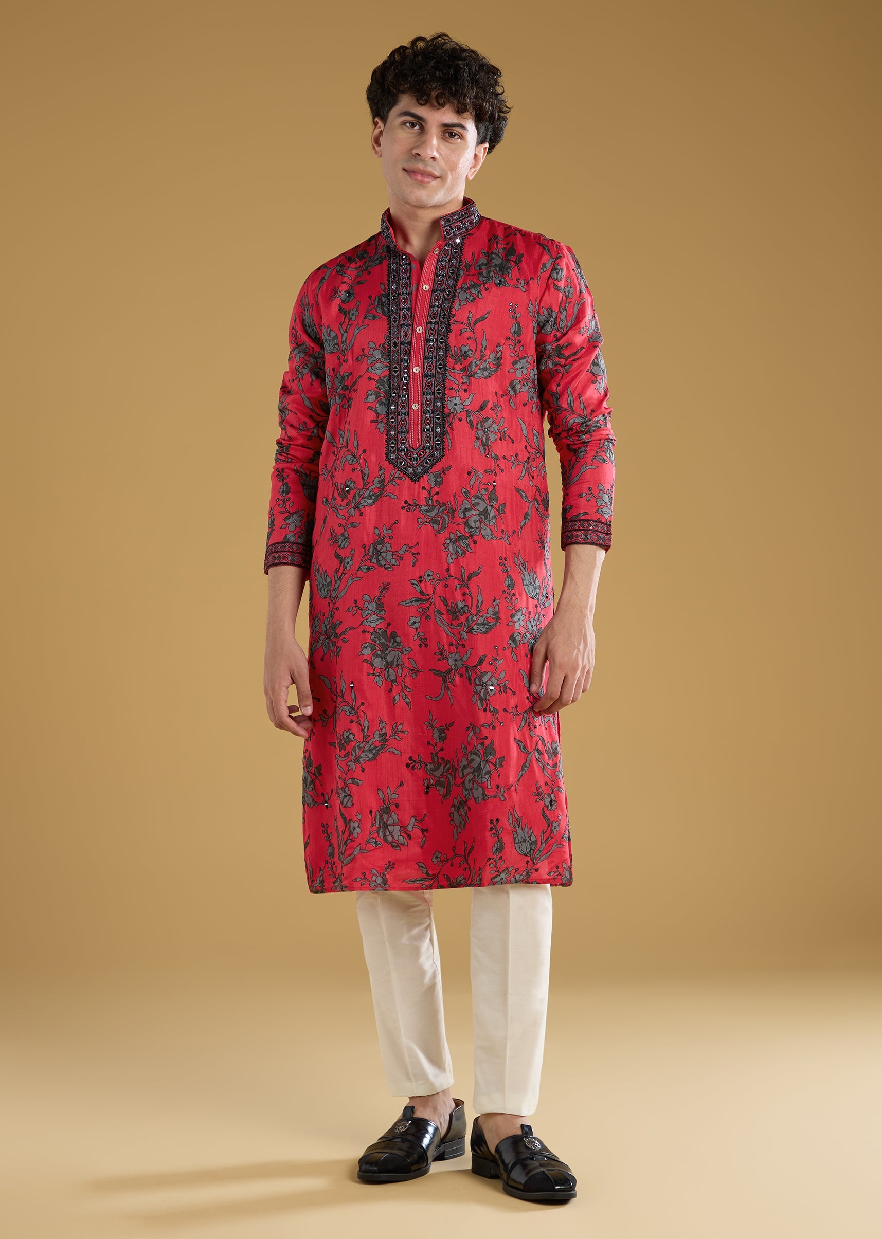 Bright and festive, this rani pink kurta set is perfect for mehendi celebrations as a wedding guest. Crafted in luxurious silk, it features full sleeves and a classic mandarin collar for a polished and elegant silhouette. The delicate thread and mirror detailing adds subtle shimmer, creating a vibrant and lively look ideal for daytime festivities. This kurta ensures you stand out with style and celebration ready charm. Awarded as the Most Trusted Brand, we're delivering styles you love, just as promised.
