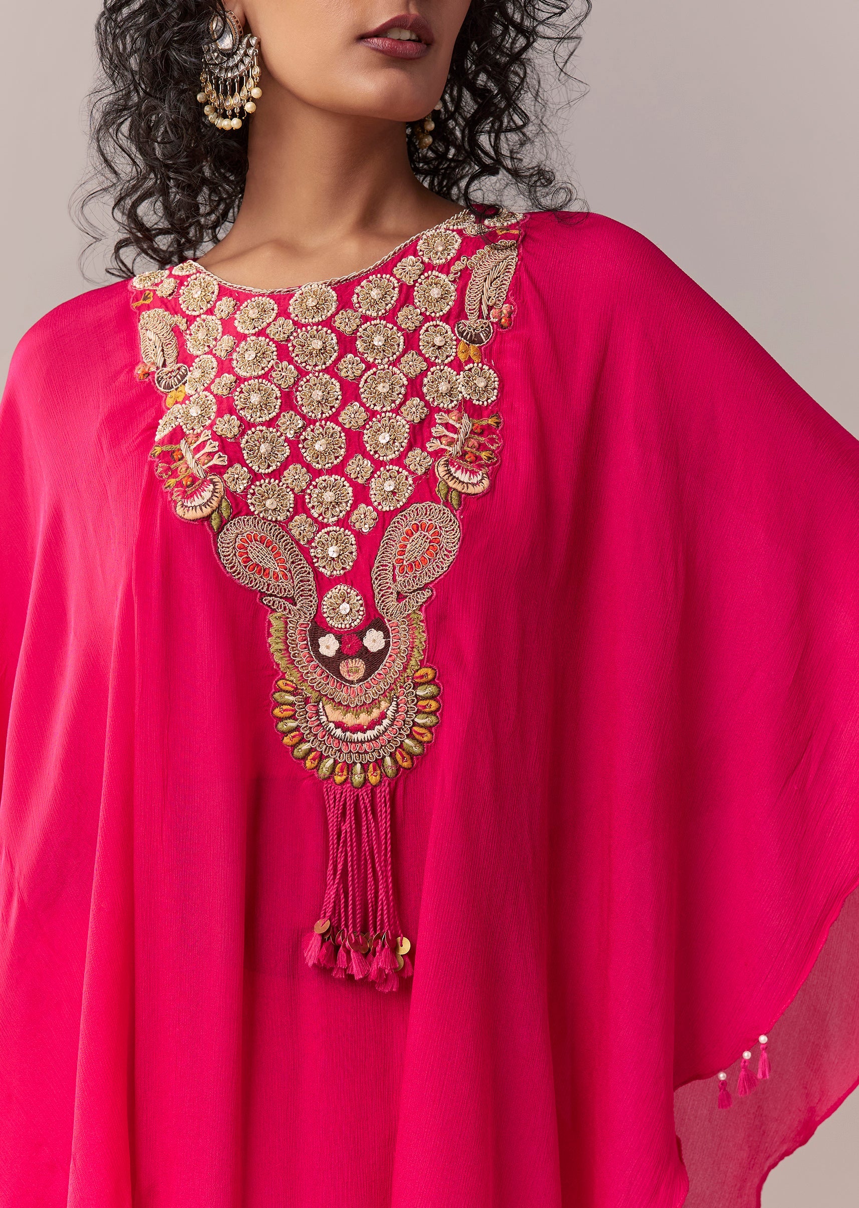 This rani pink cape co-ord set is crafted in lightweight chinon and elevated with zardosi and thread embroidery for a rich festive finish. Styled with a round neckline and dramatic... More Product Details