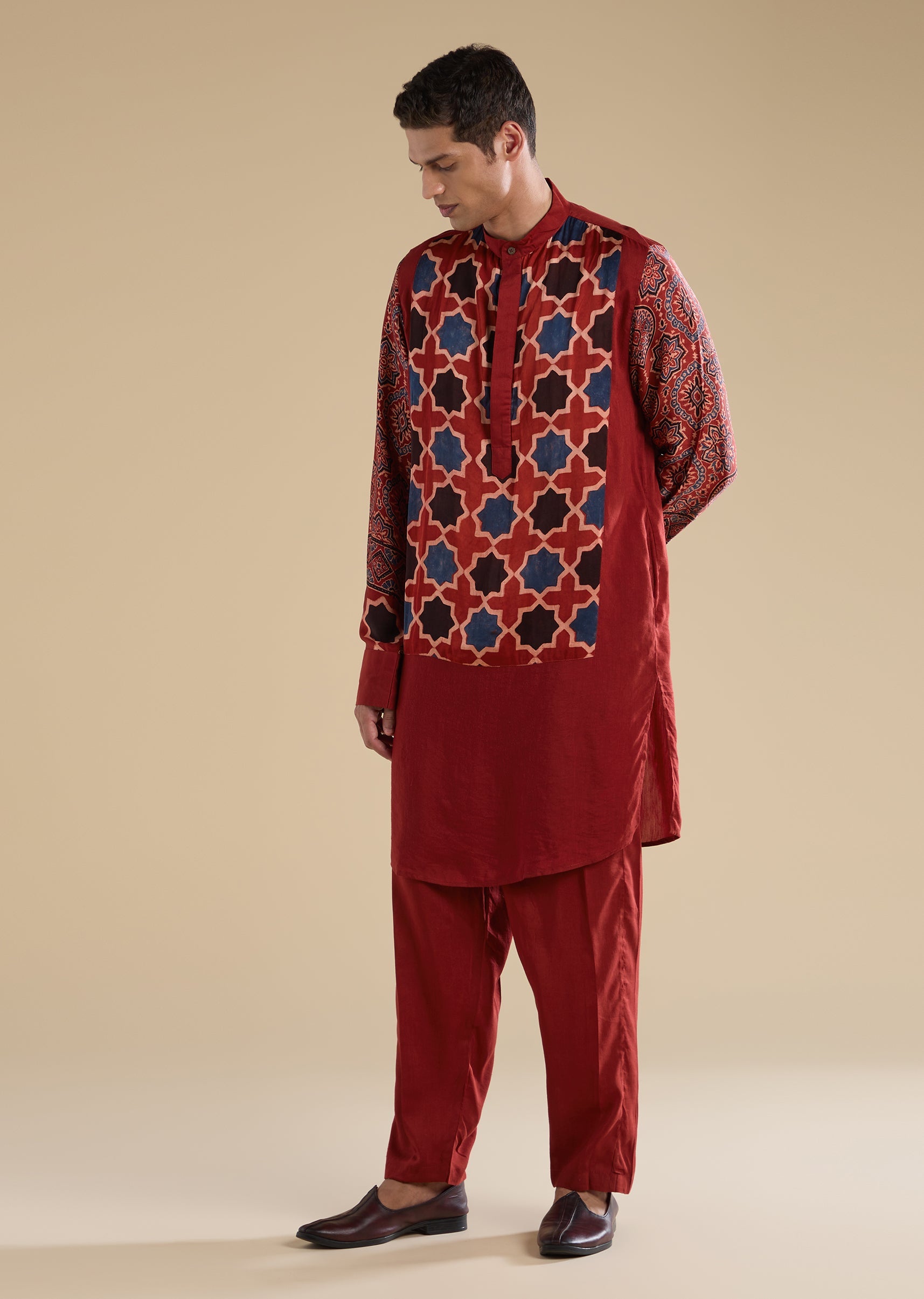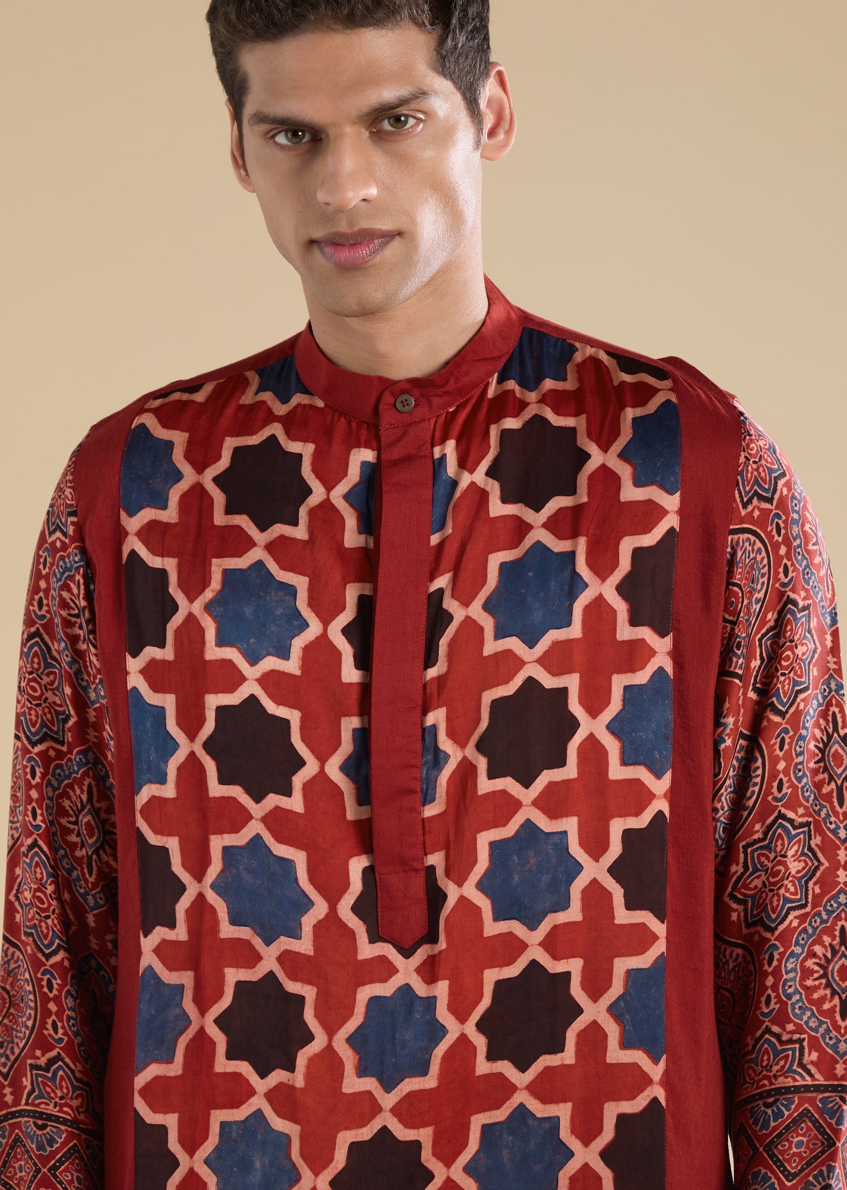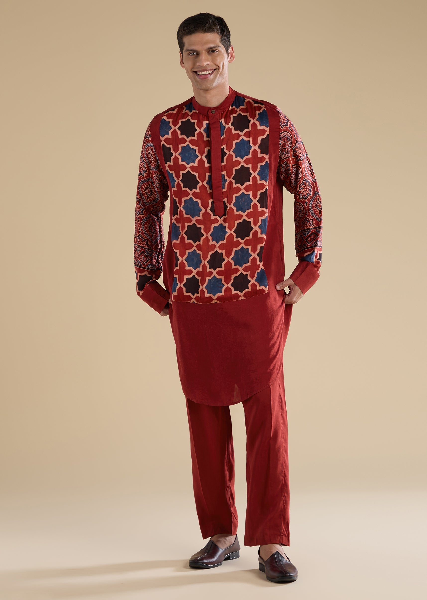 Bold and rooted in tradition, this red kurta set is crafted in soft modal fabric featuring pure handblock Ajrakh print. The mandarin collar, full sleeves, and side slits create a... More Product Details