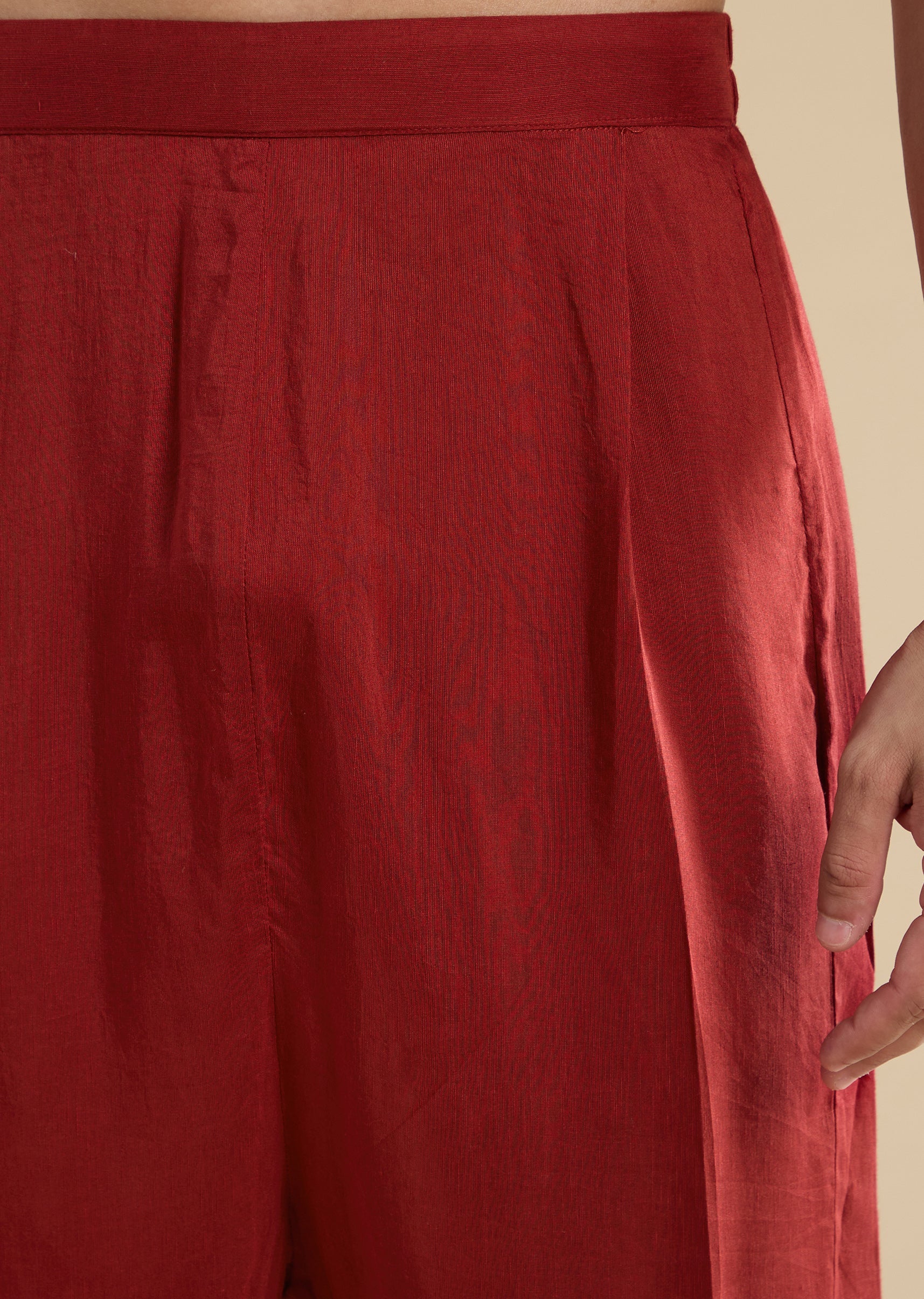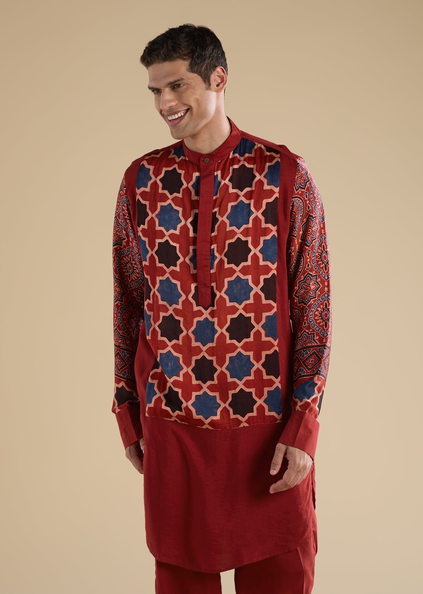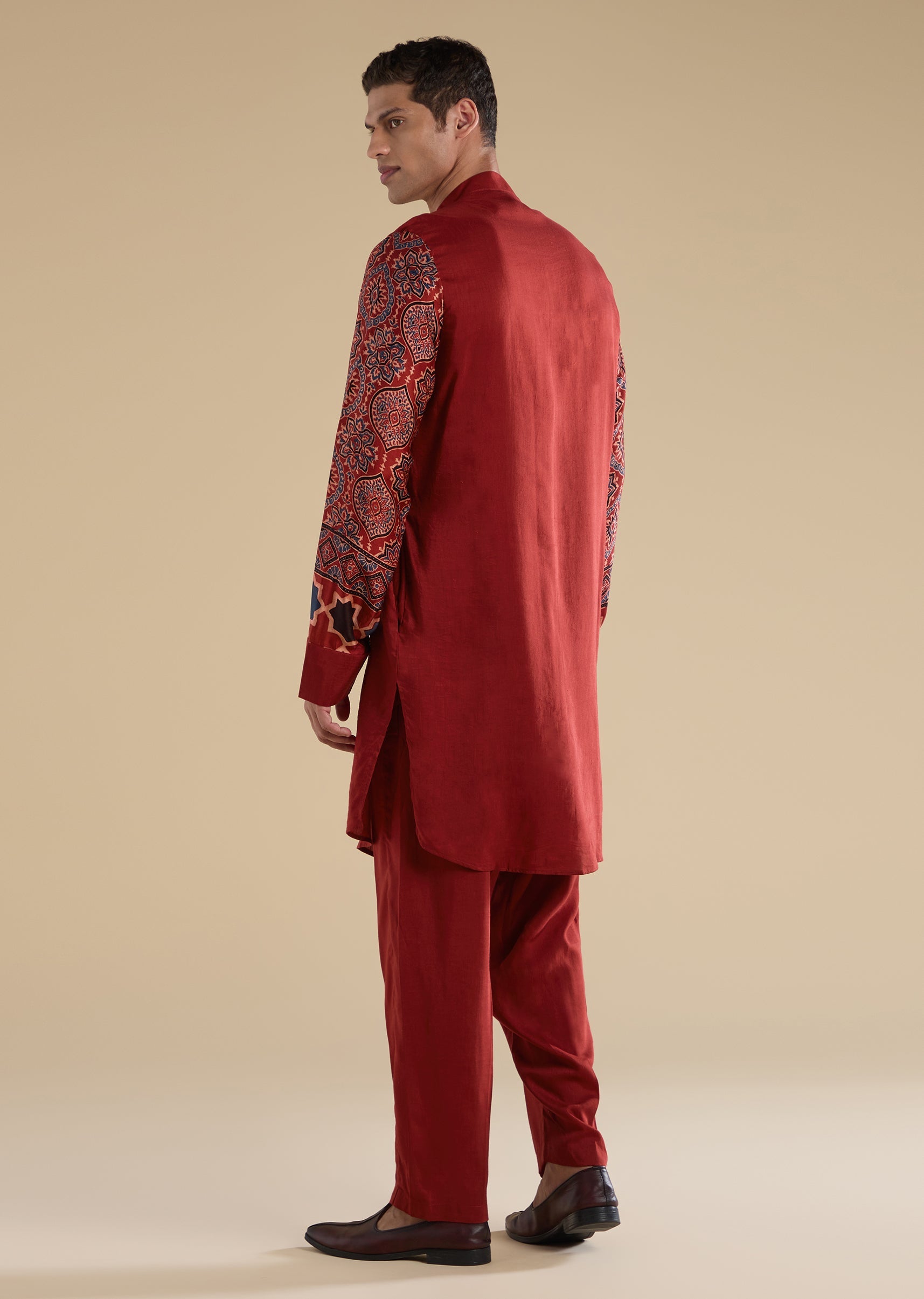 Bold and rooted in tradition, this red kurta set is crafted in soft modal fabric featuring pure handblock Ajrakh print. The mandarin collar, full sleeves, and side slits create a... More Product Details