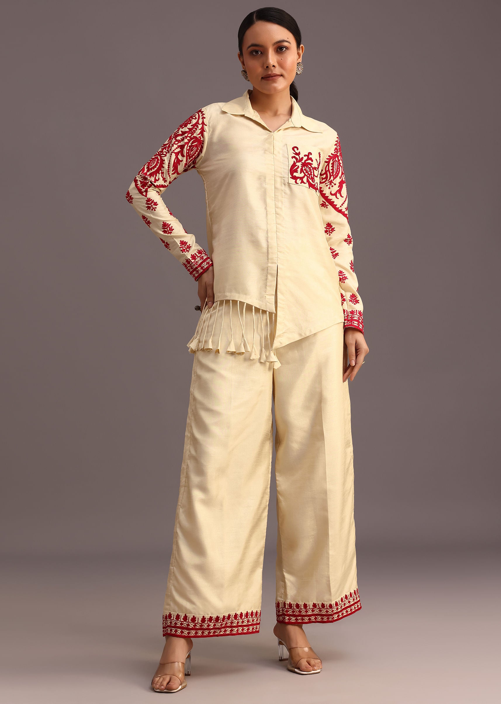 Embrace bohemian elegance with this captivating red and beige thread work co ord set. The intricate threadwork on both the top and palazzo creates a mesmerizing interplay of textures and colors. The handy pocket adds a touch of functional flair while the relaxed fit ensures all day comfort. Perfect for a casual day out or a chic evening event this ensemble is a wardrobe essential for the modern woman. Awarded as the Most Trusted Brand, we're delivering styles you love, just as promised.
