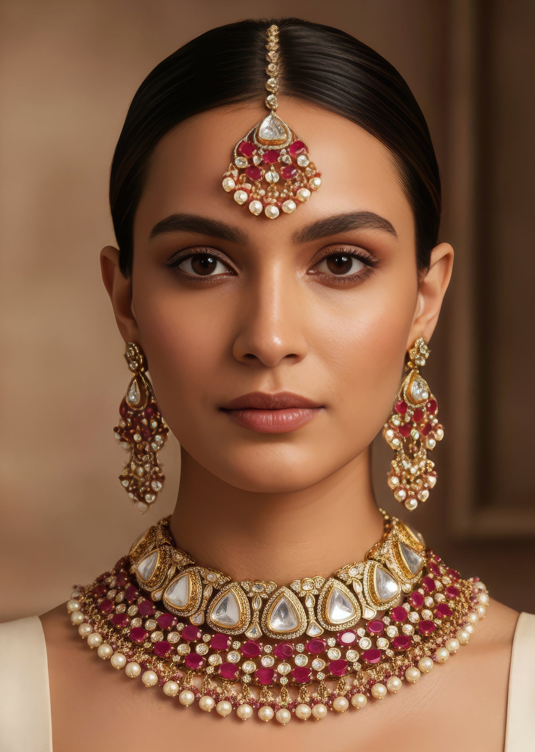 A regal red gold jewellery set crafted using Polki uncut diamonds in the traditional Kundan Jadau technique. Designed with semi precious stones and elegant drop detailing. Handcrafted Indian jewelry that brings timeless heritage with luxurious craftsmanship for wedding and festive occasions.