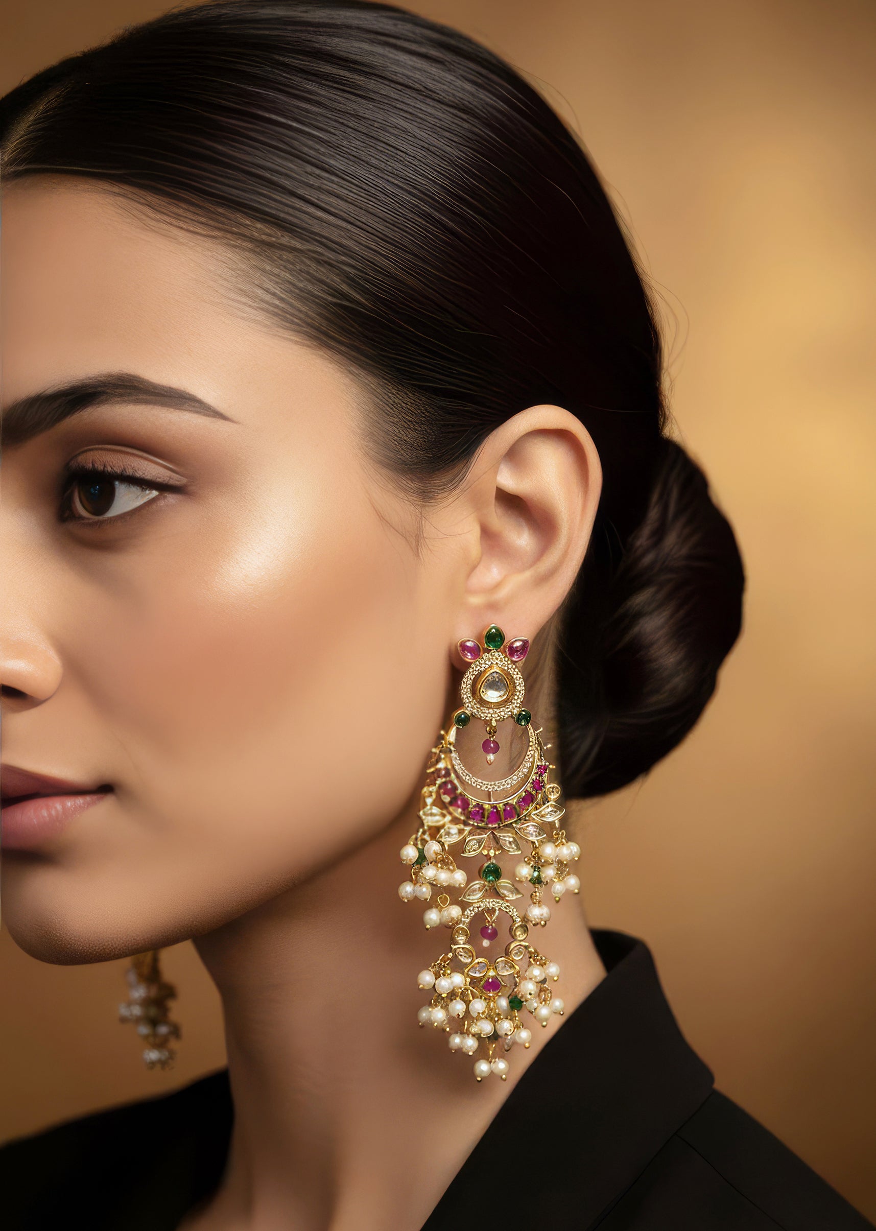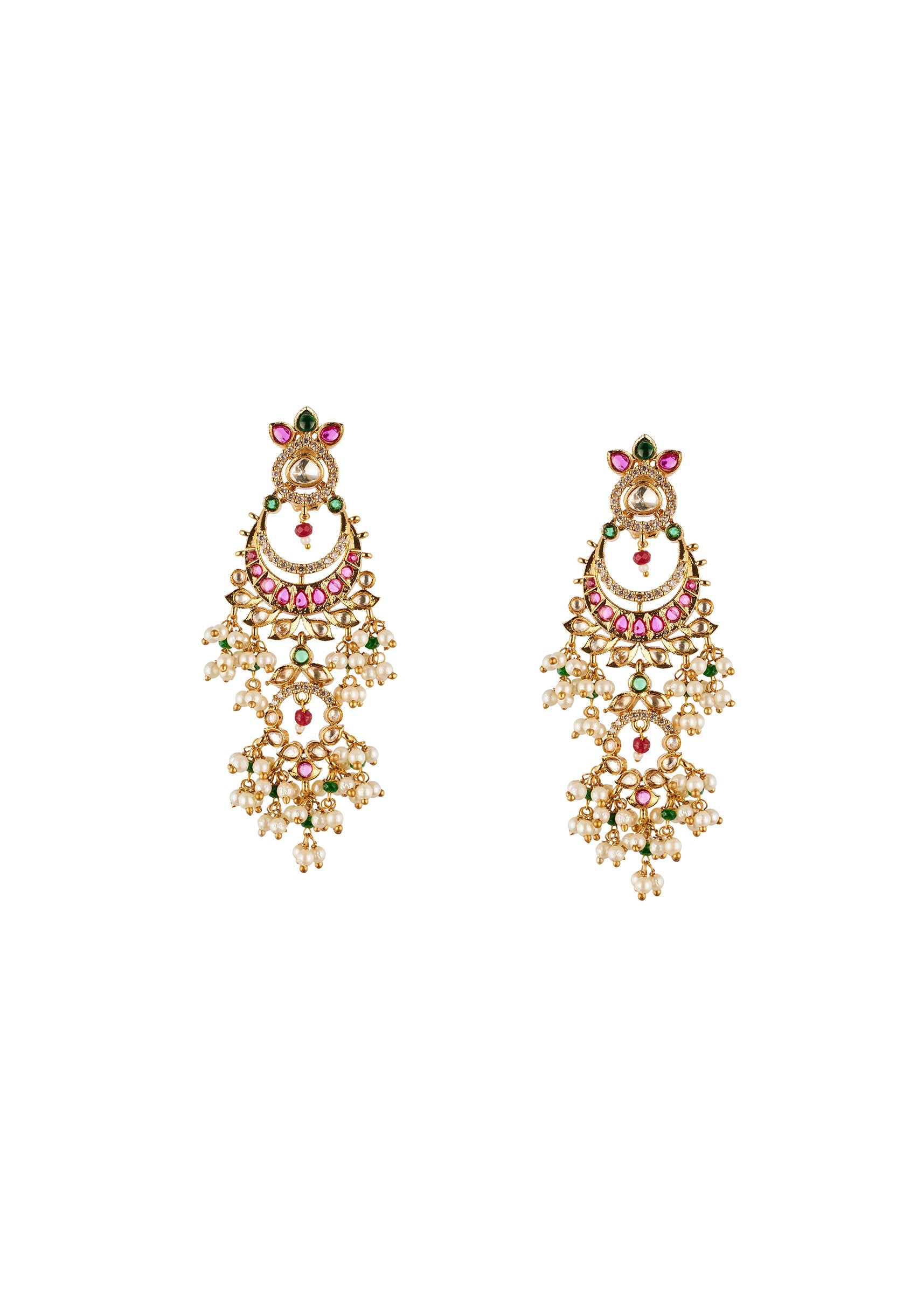 Elegant and festive, these traditional gold tone Kundan Polki style chandbalis are adorned with lustrous faux pearls and beautifully simulated coloured stones, adding a rich pop of green to the... More Product Details