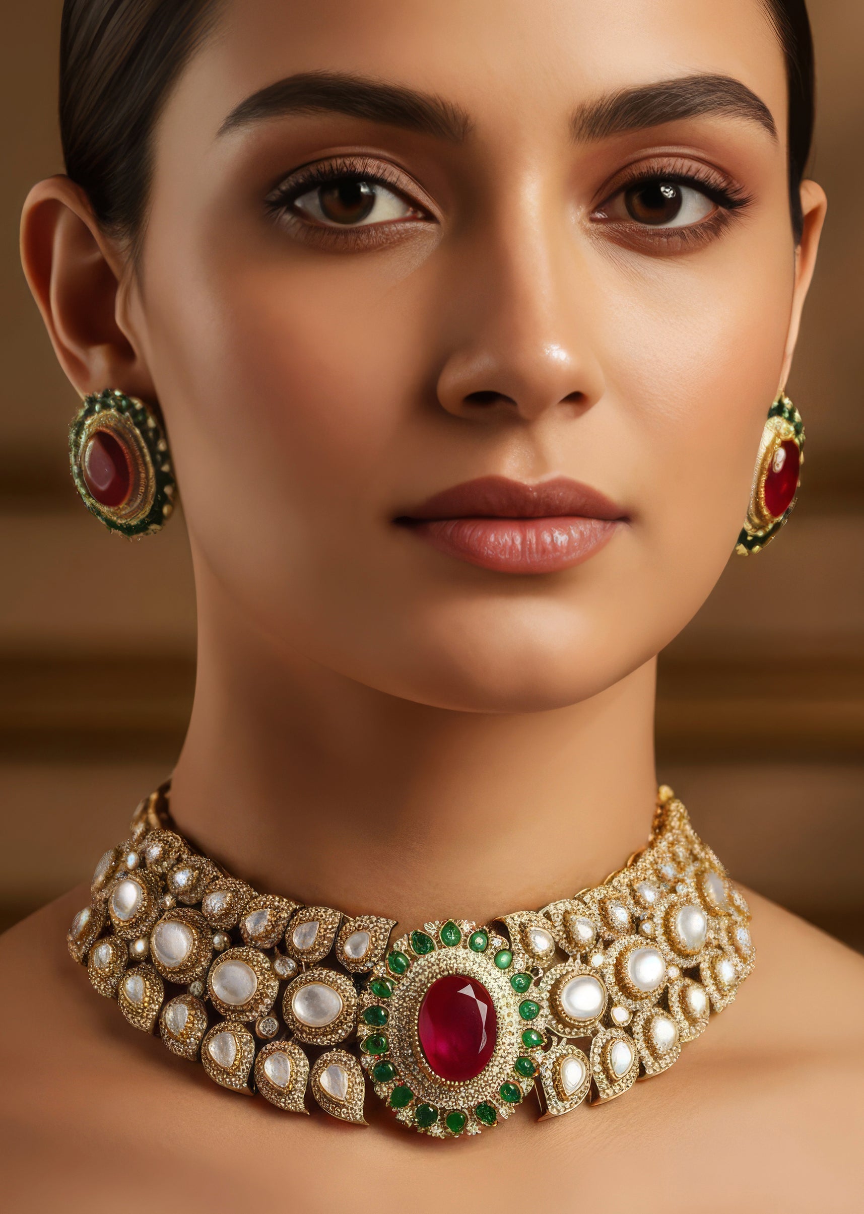 Designed to steal the spotlight, this CZ diamond look necklace set dazzles with rich red and green semi precious stones set in durable rhodium plated brass with an anti tarnish finish. The vibrant colour pairing adds a regal festive charm, making the necklace and matching earrings a striking choice for weddings and celebrations.